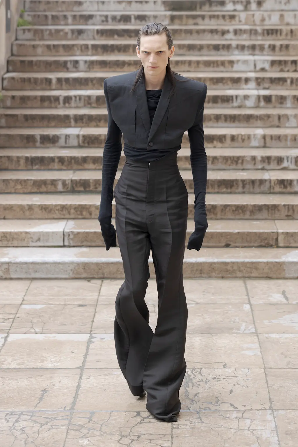 High-waisted suit trousers in satin bowed across the bum, sharpening into the knees and then flaring outwards to obscure the familiar perspex-heeled platforms. Meanwhile, blazer jackets constructed from triangulated panels were pointed at the shoulder, forming muscle-man caricatures, cropped at the navel in yet another androgynous tweak. You could see Rick and his doting fans in every look.