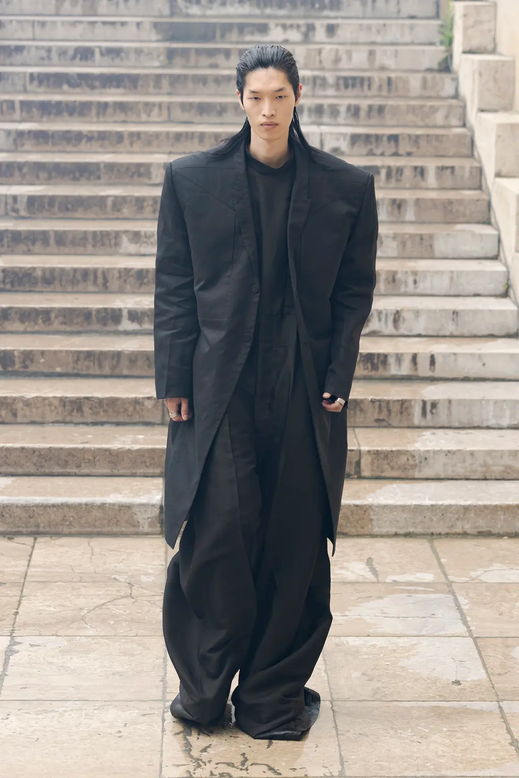 Opened by Rick’s muse Tyrone Dylan, the show was envisioned as an antidote to the current threats our world faces, although – for Rick virgins – the dark and brooding atmosphere hardly gave an impression of optimism. What it did do, however, was rile up the fash-pack with a series of angular, trailing Mad Max-esque looks.