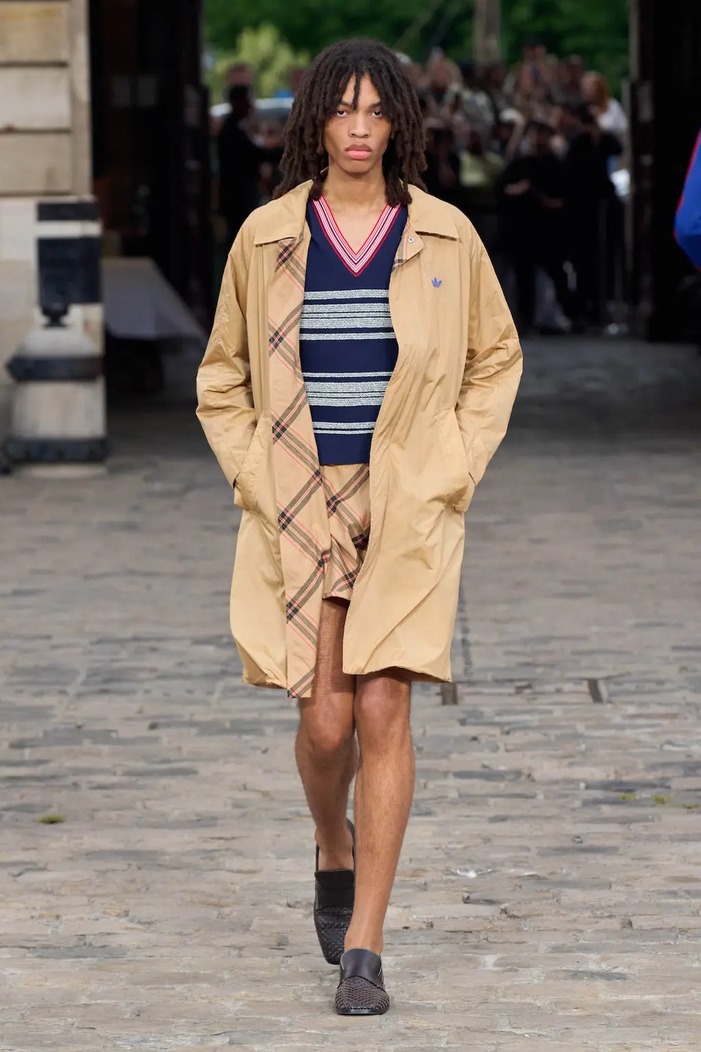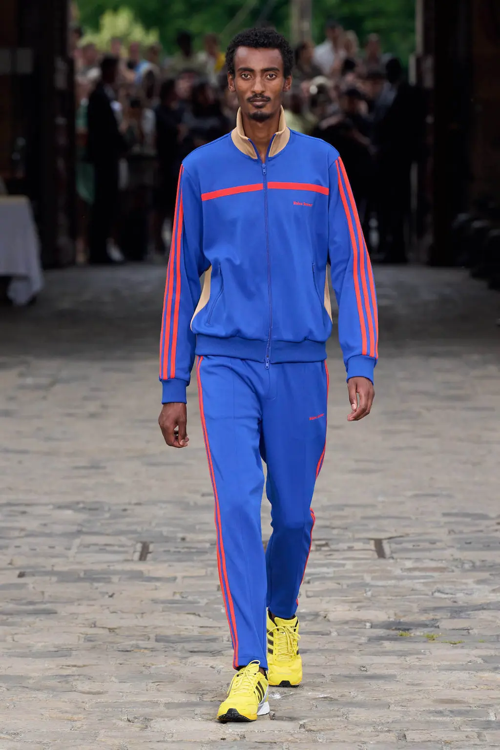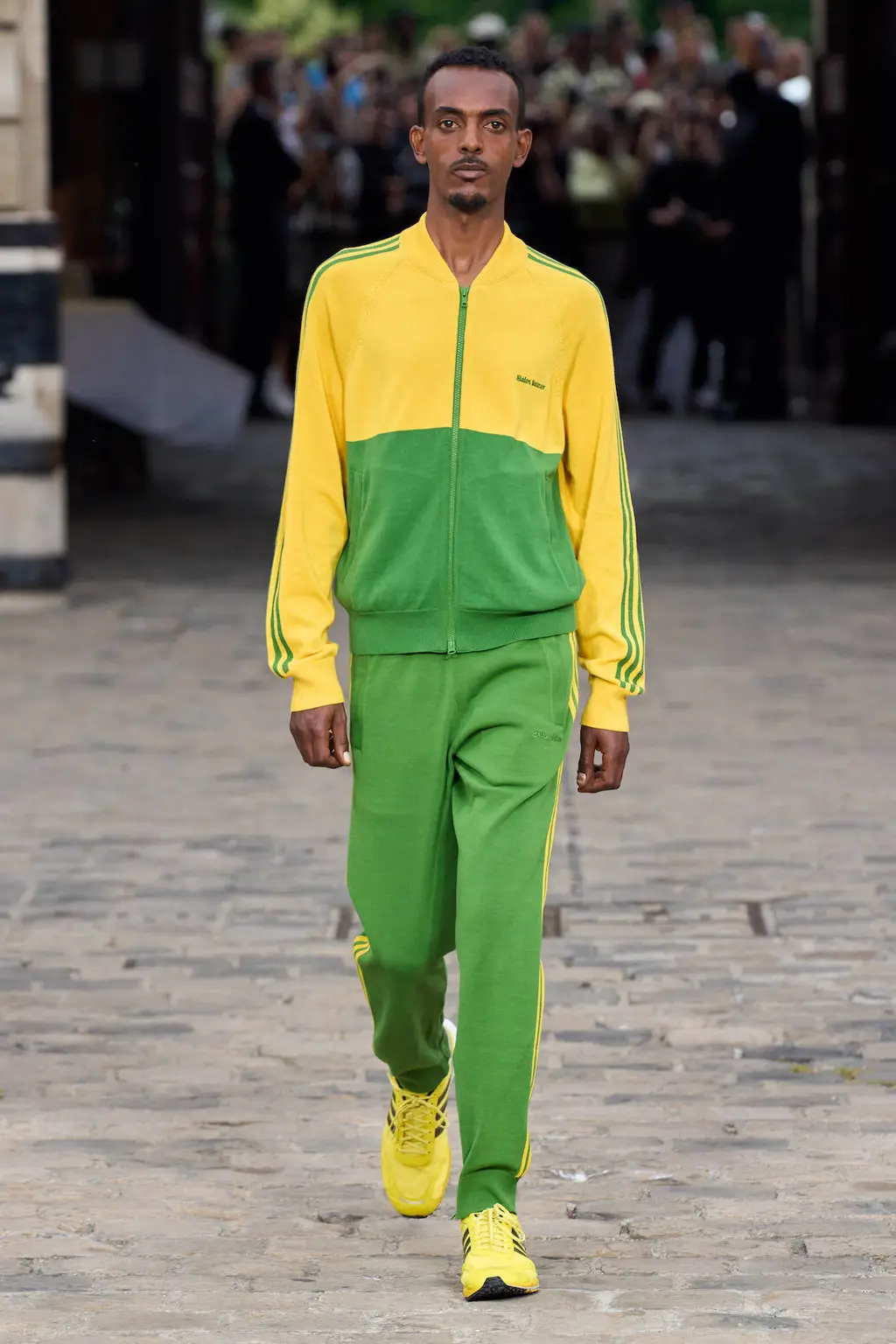 Like all Wales Bonner outings, the collection read like a visual essay, recounting the triumph and resilience that carries athletes on their journey through a marathon. This spanned the hard graft of training as told in canary-yellow and green adidas Originals tracksuits, and the celebrations that follow a record-breaking win, as seen in the biscuit box-cut blazers and denim two-pieces, trimmed with her signature woollen stripes.