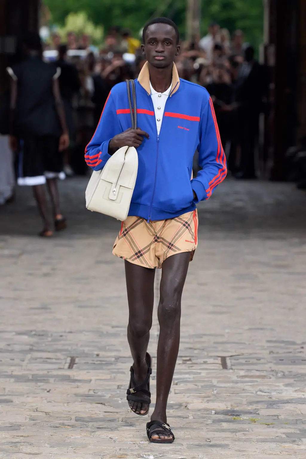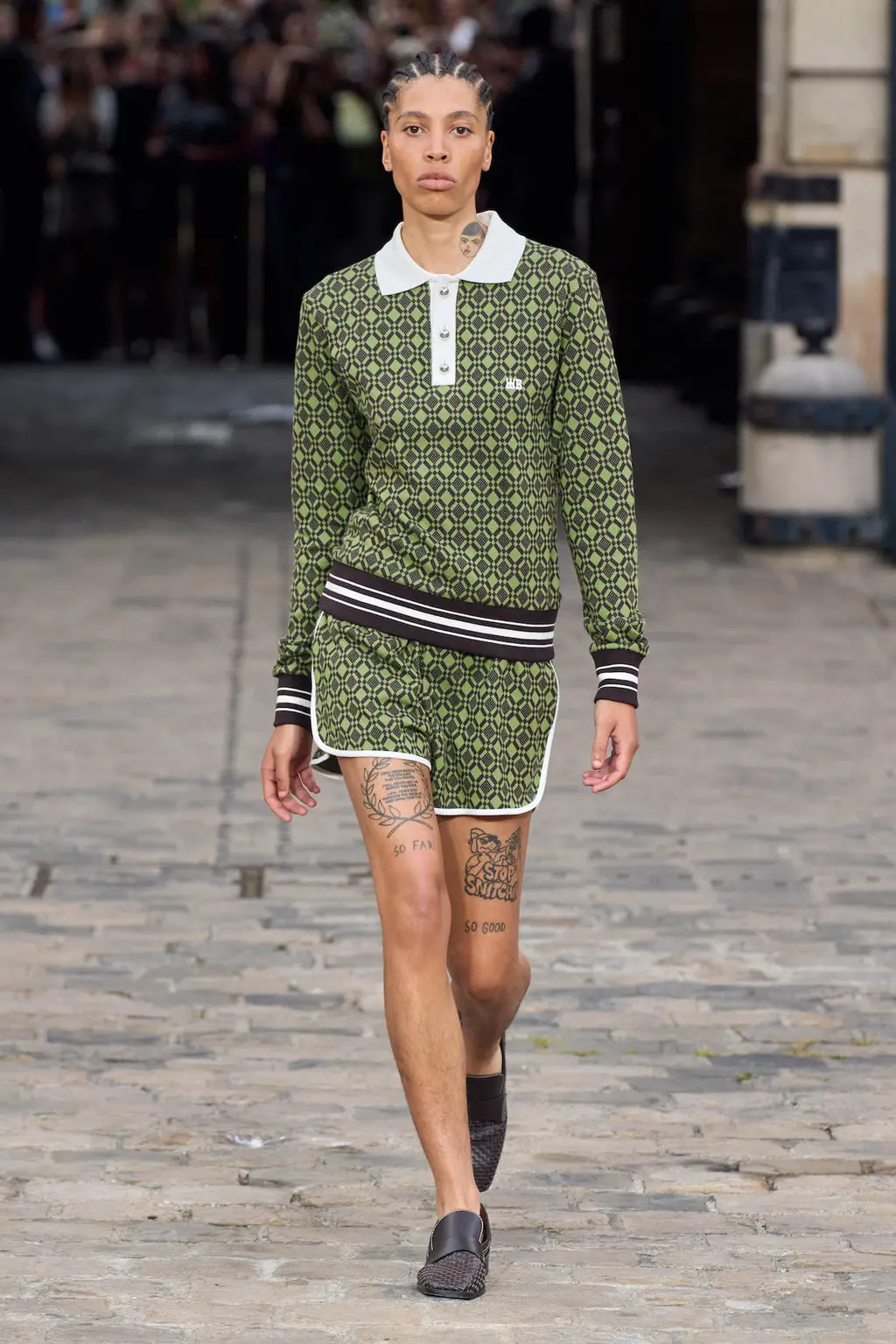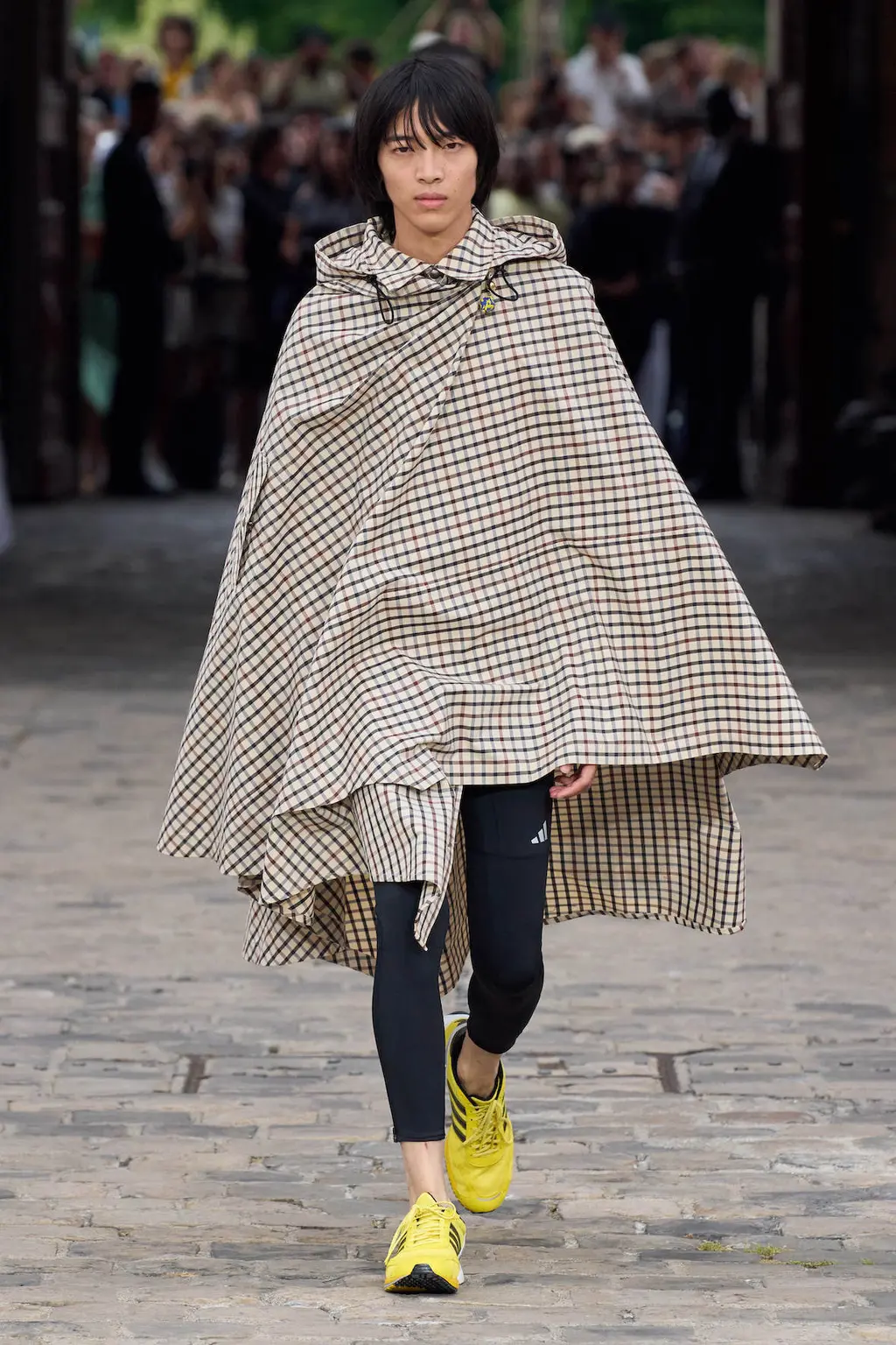 Like all Wales Bonner outings, the collection read like a visual essay, recounting the triumph and resilience that carries athletes on their journey through a marathon. This spanned the hard graft of training as told in canary-yellow and green adidas Originals tracksuits, and the celebrations that follow a record-breaking win, as seen in the biscuit box-cut blazers and denim two-pieces, trimmed with her signature woollen stripes.