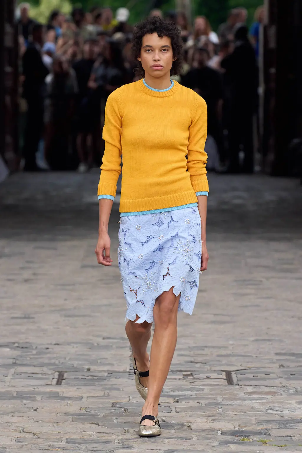 Elsewhere, brooches embellished lapels with fine jewels, or, in several cases, decked the garments completely, forming regal cardigans and polo shirts. Complementing this, millinery designed by Stephen Jones took the form of woollen hats, pinched at the top like rosebuds and iced with lilies and mother-of-pearl pins. These ticked off craft.