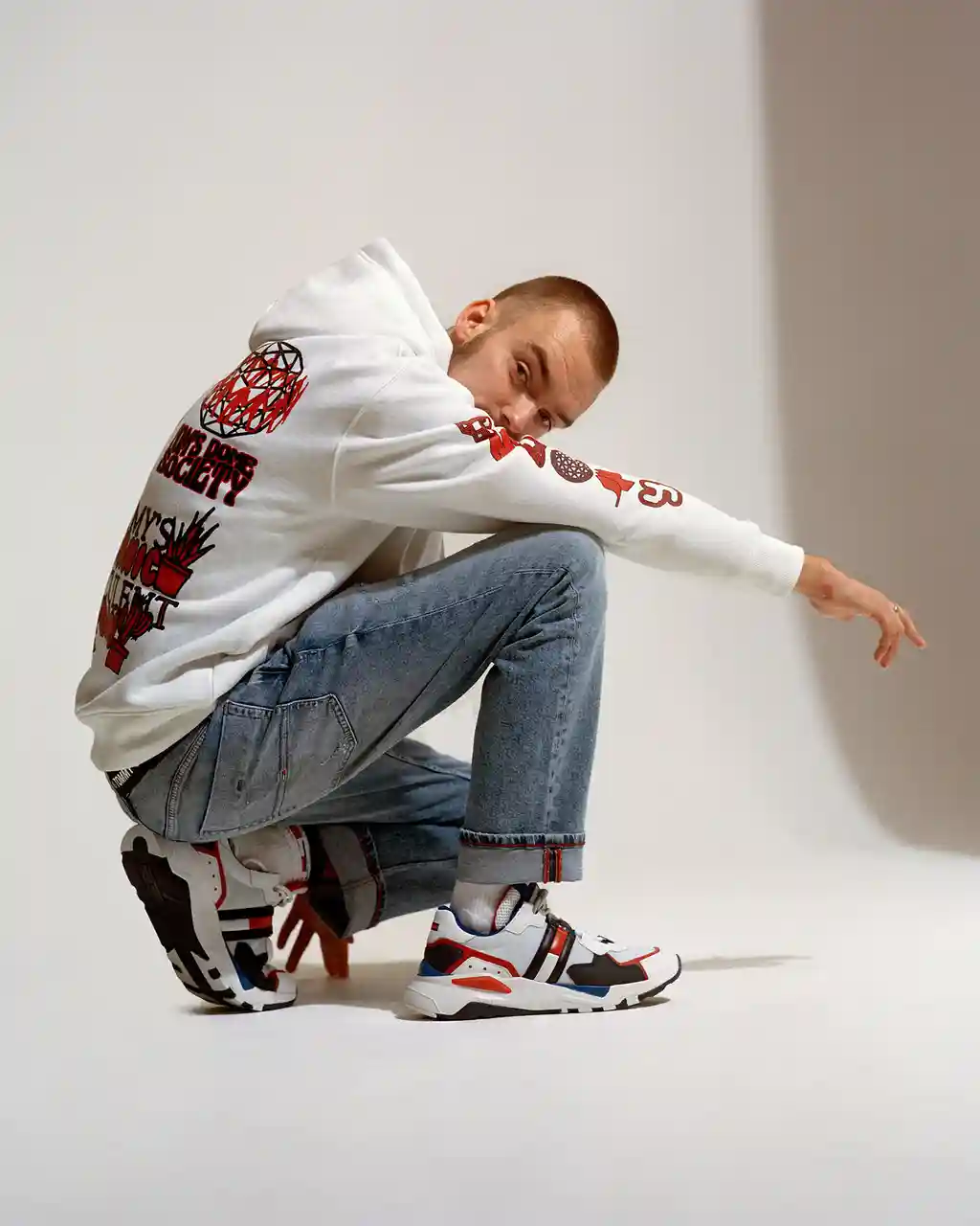 We tapped up Beijing-born, London-based photographer Sirui Ma to shoot the rising stars all dressed up – with nowhere to go – wearing the latest drop; a selection of vibrant T‑shirts and hoodies designed by Toby Evans of newly-formed graphic design outlet Studio Zome, and Jonny Banger, the brains behind now cult bootleg label Sports Banger.