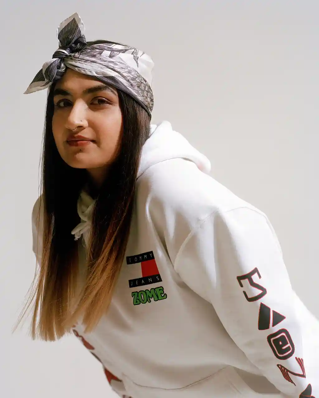 We asked photographer Sirui Ma to capture Pinty and Naina all dressed up in the latest garms from Tommy’s Drop Shop. Scroll down to see the T-shirts and hoodies designed by Toby Evans, the graphic design genius behind Studio Zome, and Jonny Banger, founder of bootleg fashion label Sports Banger.