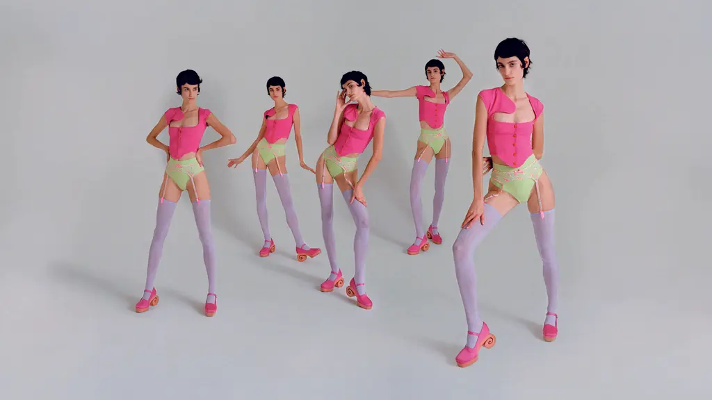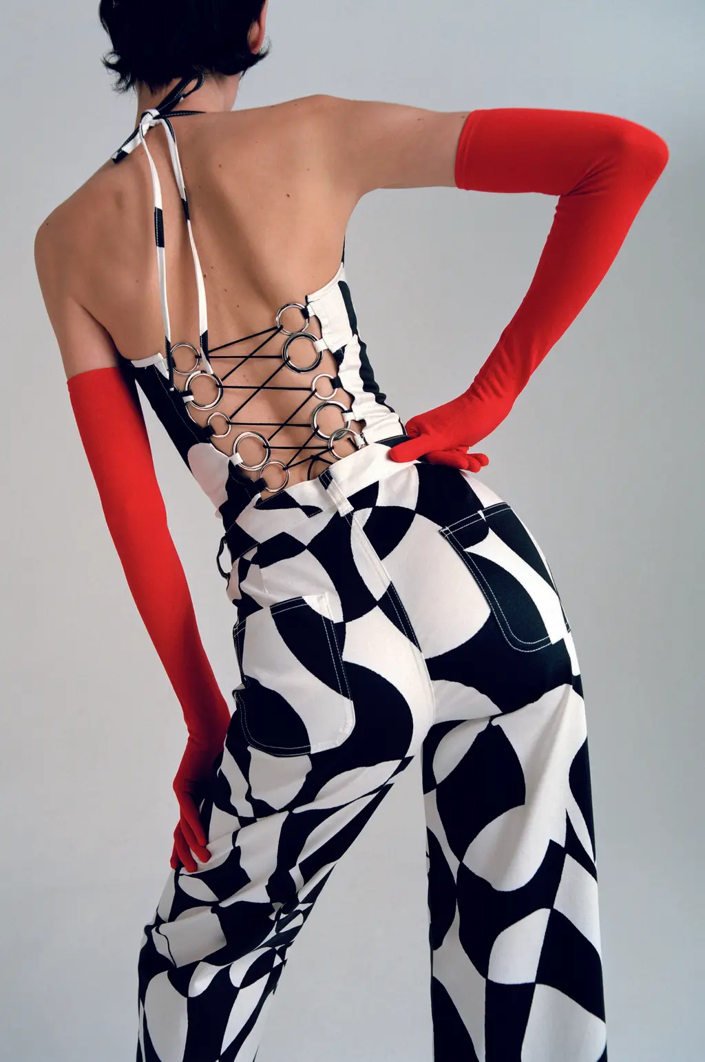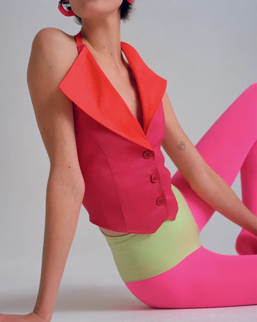 Clearly, creating pieces that pop is a winning formula for the designer. Since then, joy, childlike innocence and kitsch with an edge have all been key themes in McGillivary’s practice. From hot pink corsets and halter-neck dresses covered in fiery optical illusion prints, to button-up vests with exaggerated lapels and plenty of room for cleavage, McGillivary has carved out a reputation for thinking up enticing, lust-for-life garments.