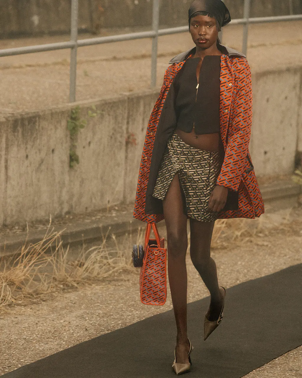 The motif also provides ample opportunity for experimentation with colour, and the collection’s palette oscillates wildly from muted, autumnal earth tones, to eye-catching fluro hues. These highlighter shades dazzle most memorably in a series of A‑line minis – modelled by Bella and friends – whose matching satin platforms wouldn’t look out of place on Clueless’s Cher Horowitz. Accessories come in all shapes and sizes, from sensible, folio-style day bags, to the tiniest of cross-body pochettes. These too are emblazoned with La Greca, and can be altered and added-to thanks to colour-clashing modular pockets, shoulder straps and customisable accessories.