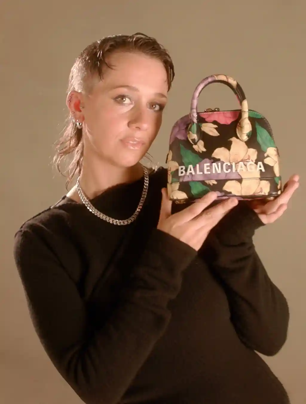 “I’m very much inspired by the club and going out and wearing outrageous things. My identity is very masc, I can do trainers and a binder, and I feel comfortable. But if I’m going to do femme then I really do it, and this bag is just cute, what can I say? I wear all black everything but if I’m ever going to wear colour, it’s going to be a little accent like this.”