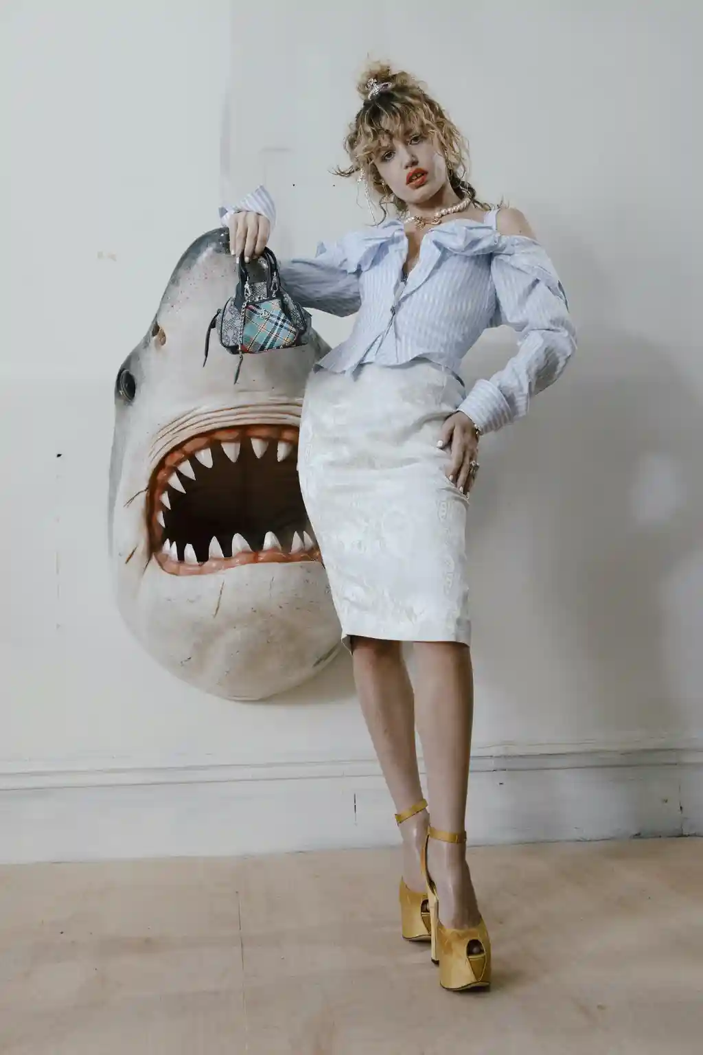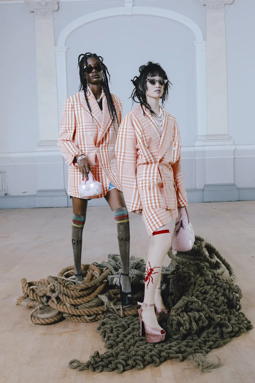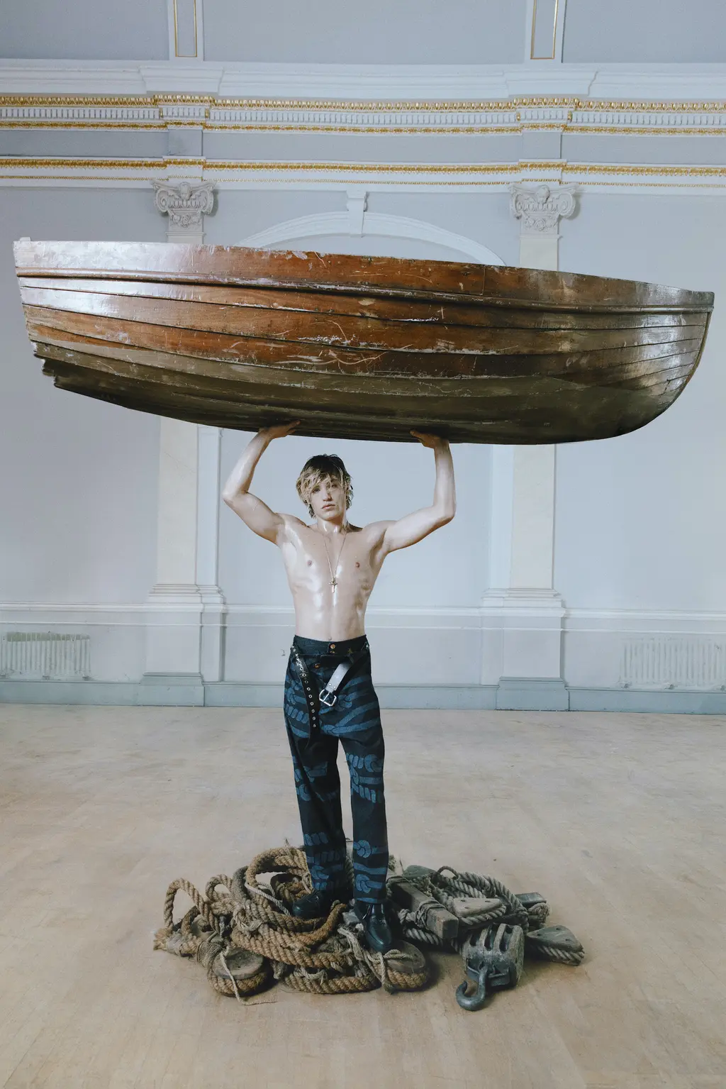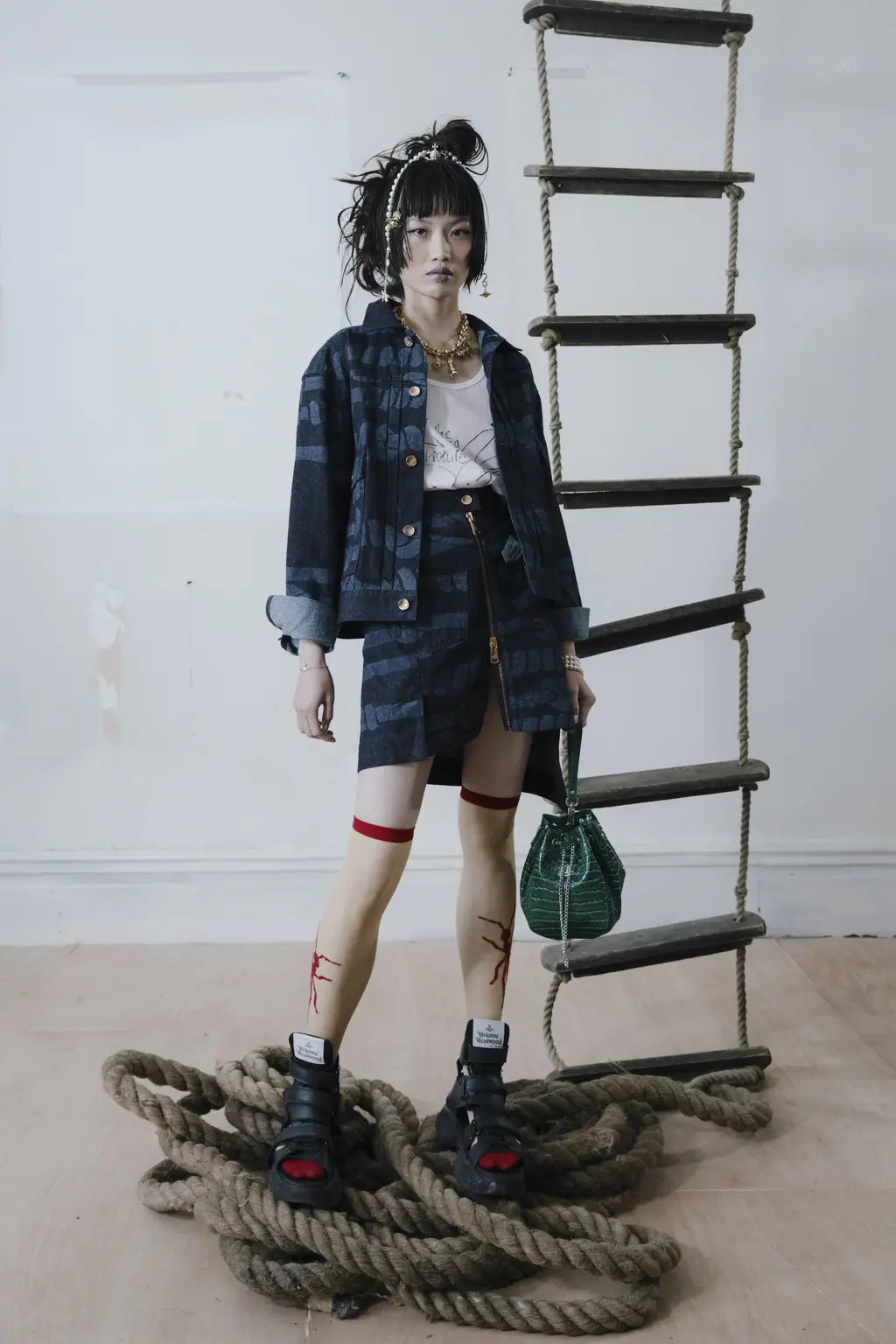 The digital presentation ran with a decidedly nautical theme peppered with references to Westwood’s SS98 collection Tied To The Mast, which saw models come down the catwalk in distressed corsets, striped, flared trousers and Elizabethan updos. In Save Our Souls, models were propped up against shark heads, stood atop piles of mooring rope and even posed with paddle boats lifted up above their heads.