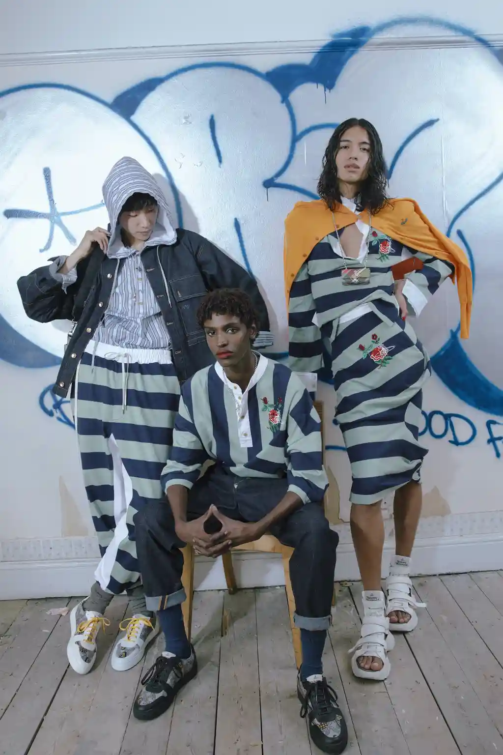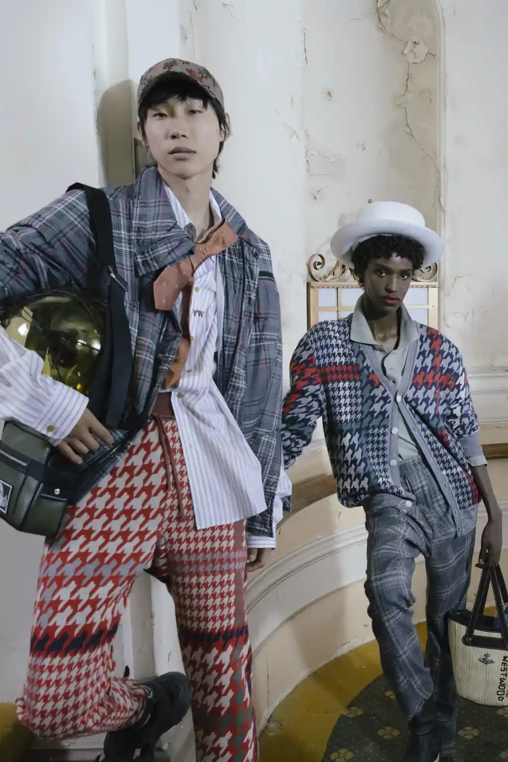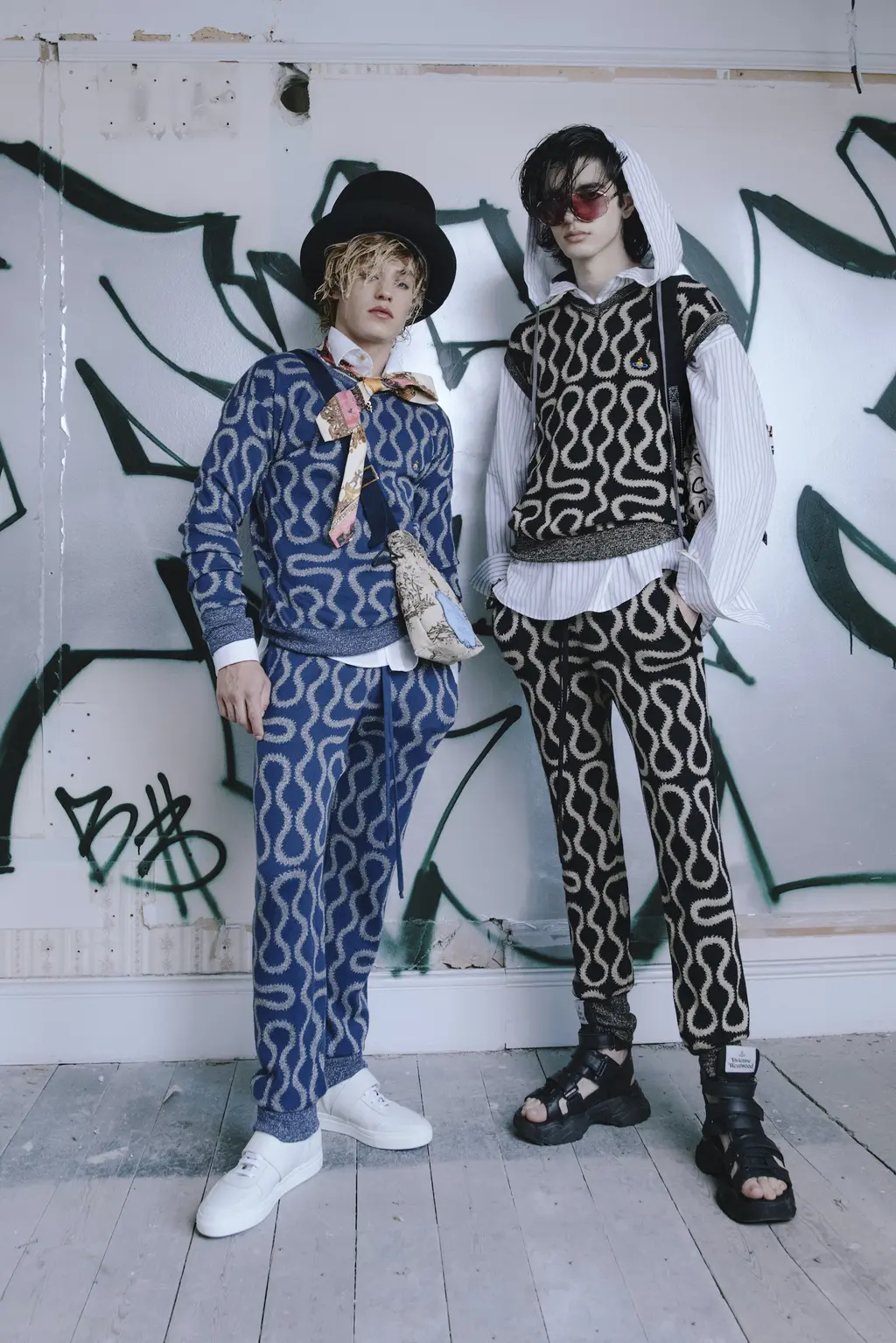 Stripes wound their way around jersey trousers and matching rugby-style tops, while tartan and dogtooth adorned suiting, knitted vests and cardigans. Rope patterns were stretched out across shirts, denim and knitwear alike, inspired by Westwood’s punk roots, English pirates and the havoc they could wreak across faraway shores.