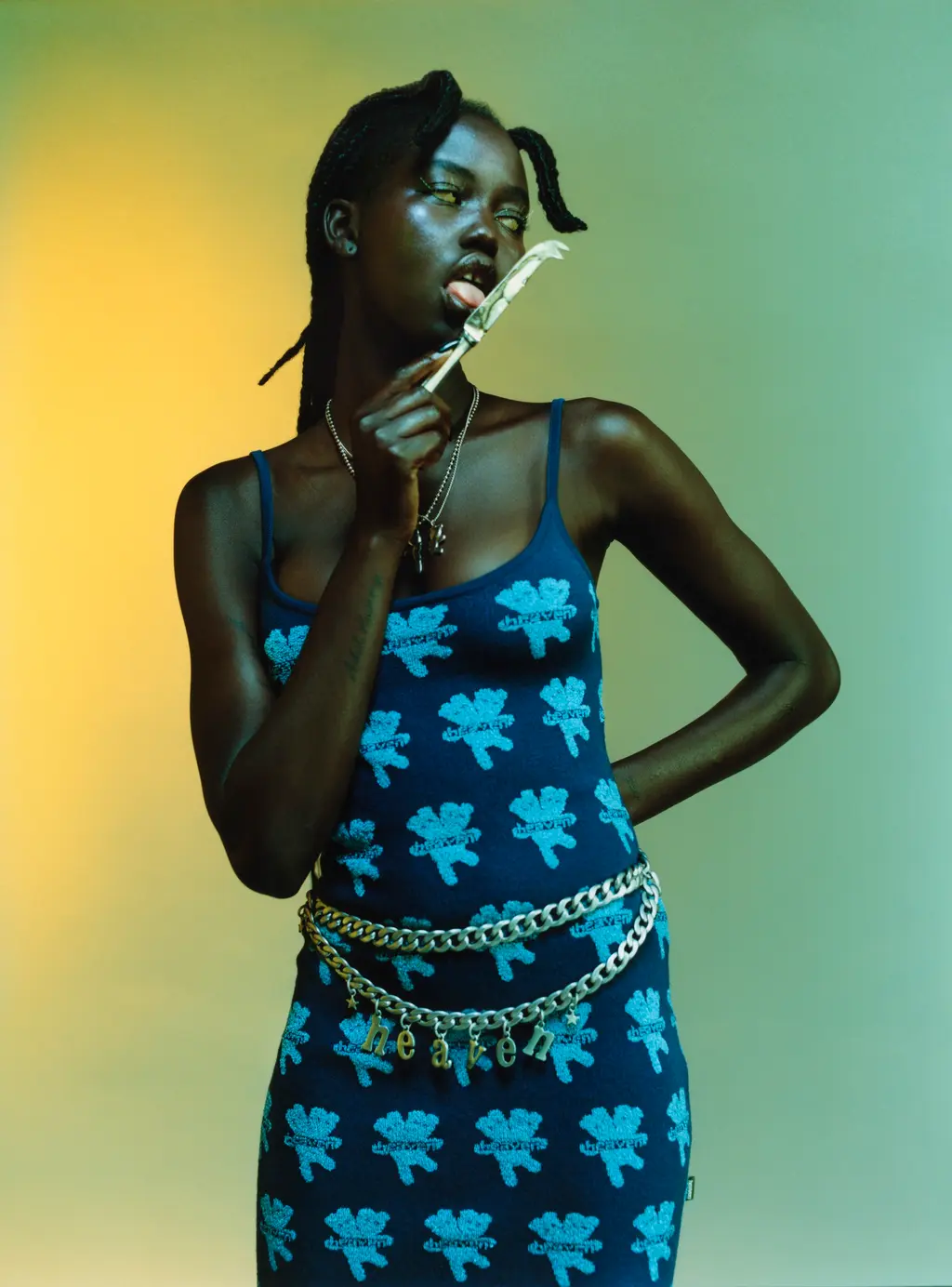 HAIR Shiori Takahashi at Streeters MAKE-UP Anne Sophie Costa at Streeters PROSTHETICS ARTIST Jordan Glanc at Streeters MANICURIST Edyta Bekta at Ofsubstance SET DESIGNER Alice Kirkpatrick at Streeters TALENT Adut Akech and Iris Law EXECUTIVE PRODUCER Joy Hart PRODUCTION CO-ORDINATOR Nerea Wallis PHOTOGRAPHER’S ASSISTANTS Alexa Hogan, Jordan Lee, Joe Reddy and Abena Appiah STYLIST’S ASSISTANTS Borys Korban and Hollie Williamson HAIR ASSISTANT Aya Kuraoka MAKE-UP ASSISTANT Hiromi Ilzuka SET DESIGNER’S ASSISTANT Sophie-Mai Wiggins PRODUCTION ASSISTANTS Sean Morrow and Simon Biu