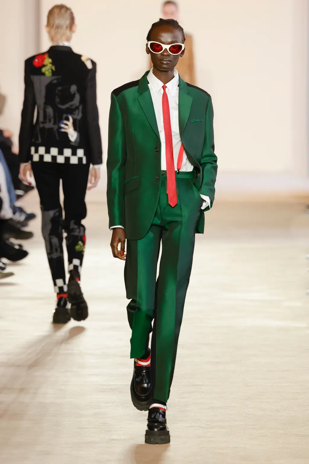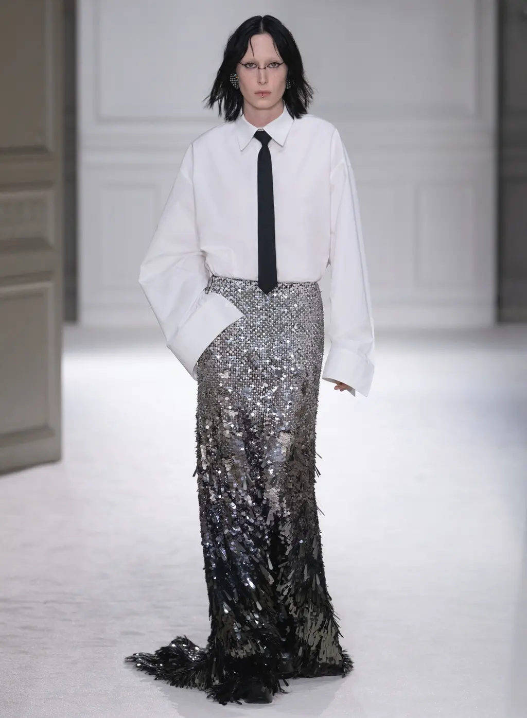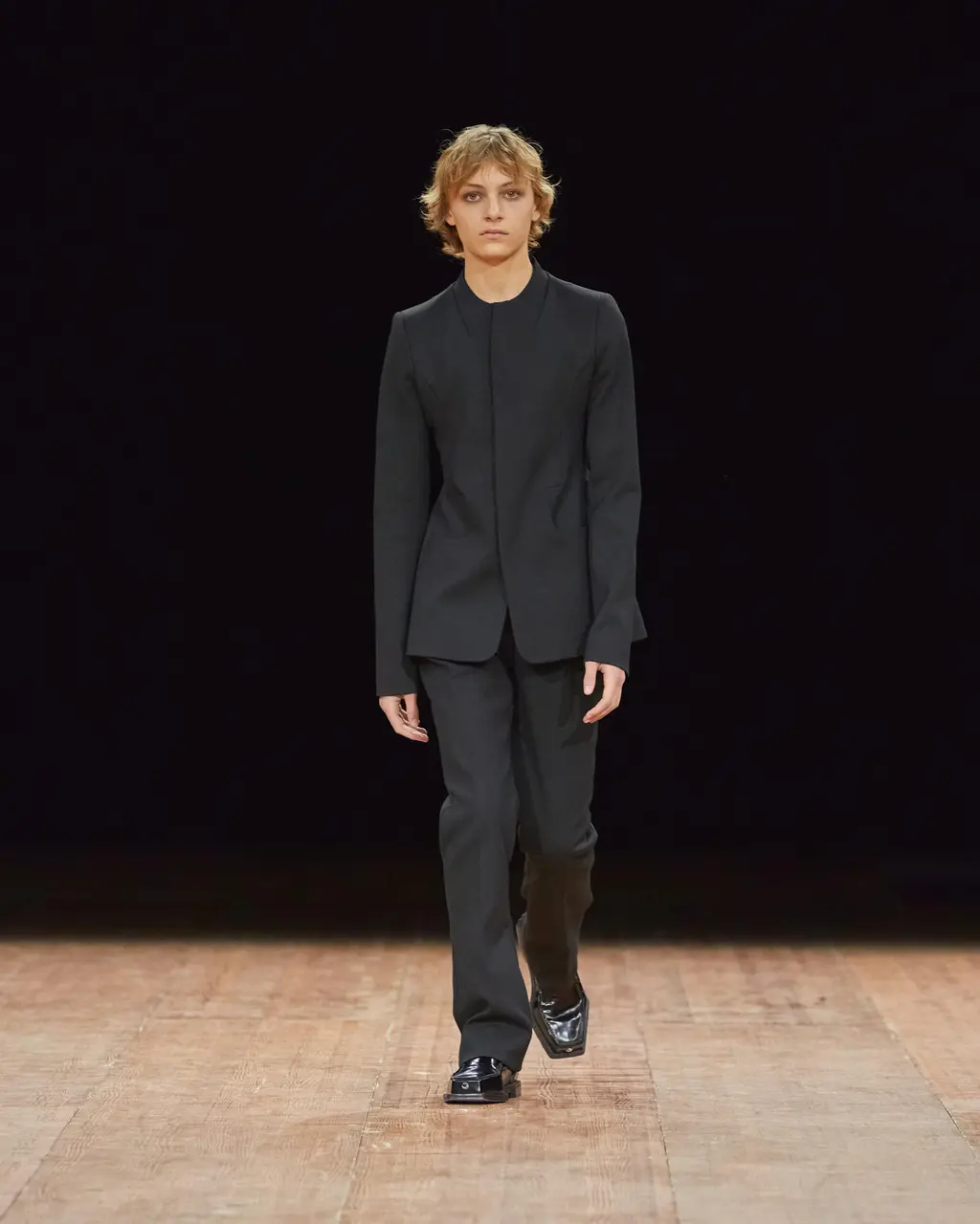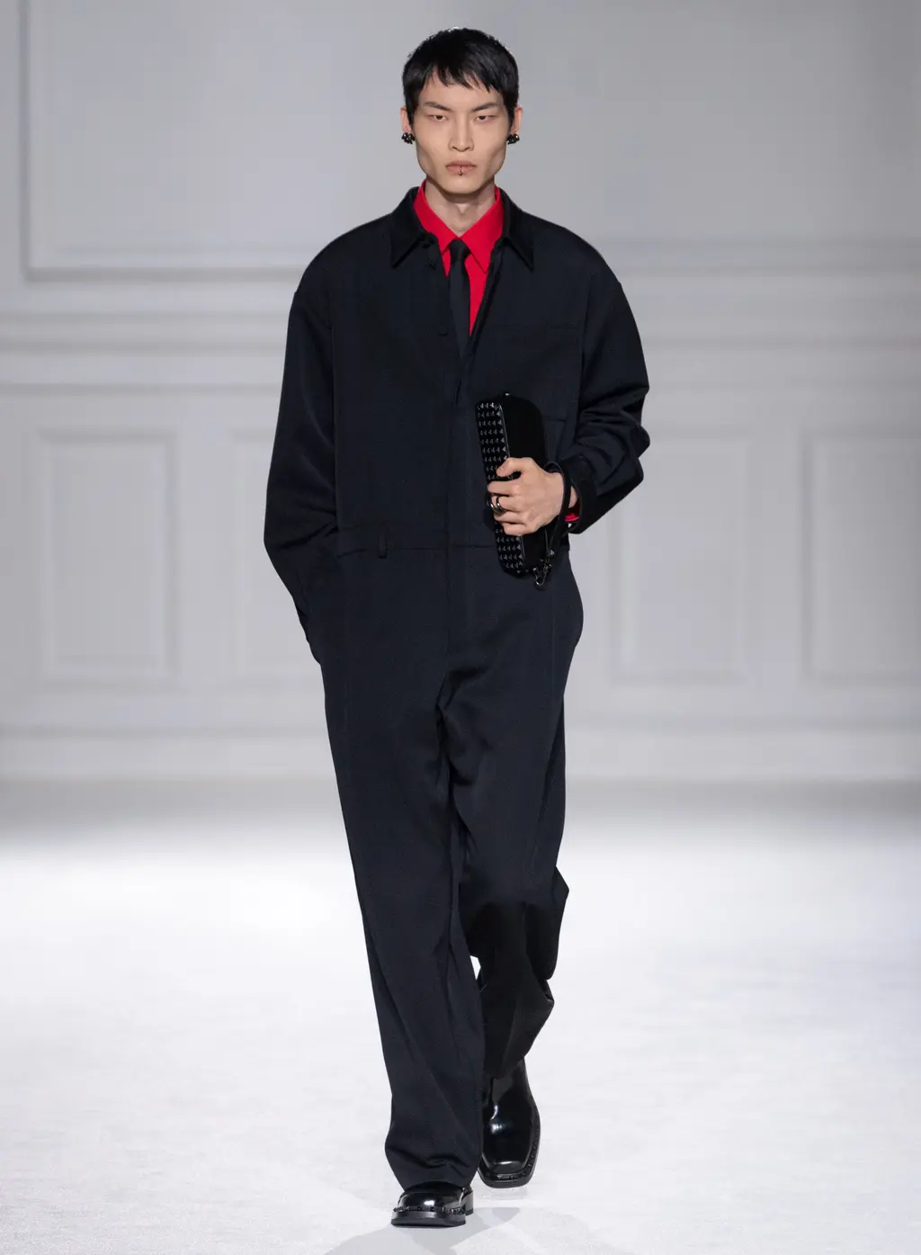 Exactly what it says on the tin: black tie, appropriated through a punky lens. The opening model had a Metallica tattoo and a lip piercing, setting the tone for Pierpaolo Piccioli’s remixed reading of formalwear. This wasn’t just an invitation to a fancy event (although if you are looking for something to wear to a posh shindig, there were more than a few looks to choose from). This was an invitation to re-imagine what black tie could be: for the daytime, the nighttime, the masculine and the feminine.