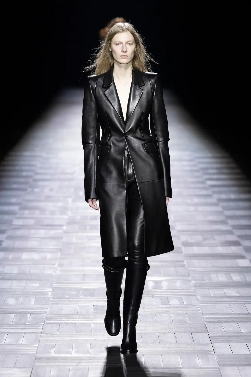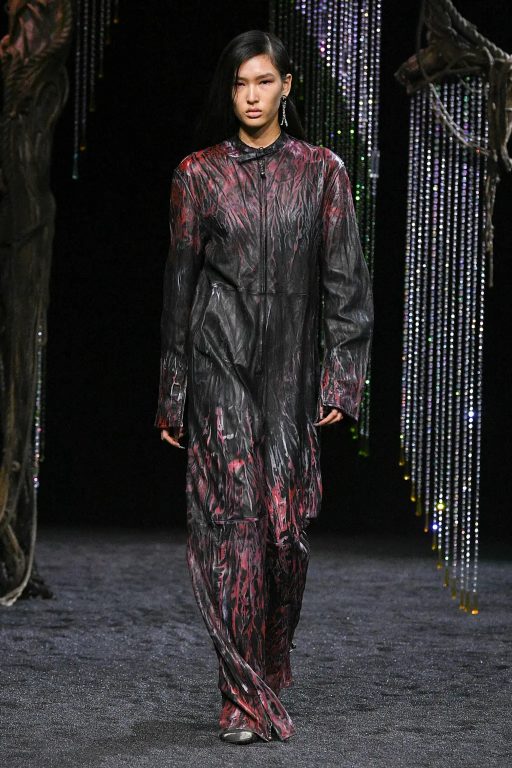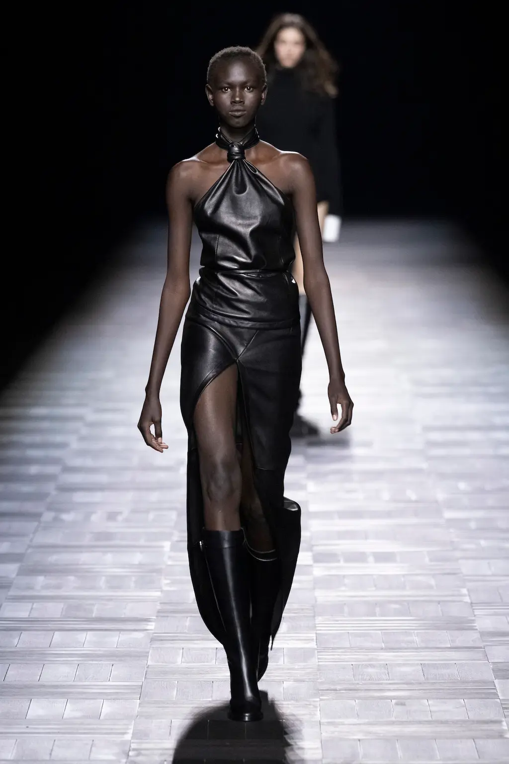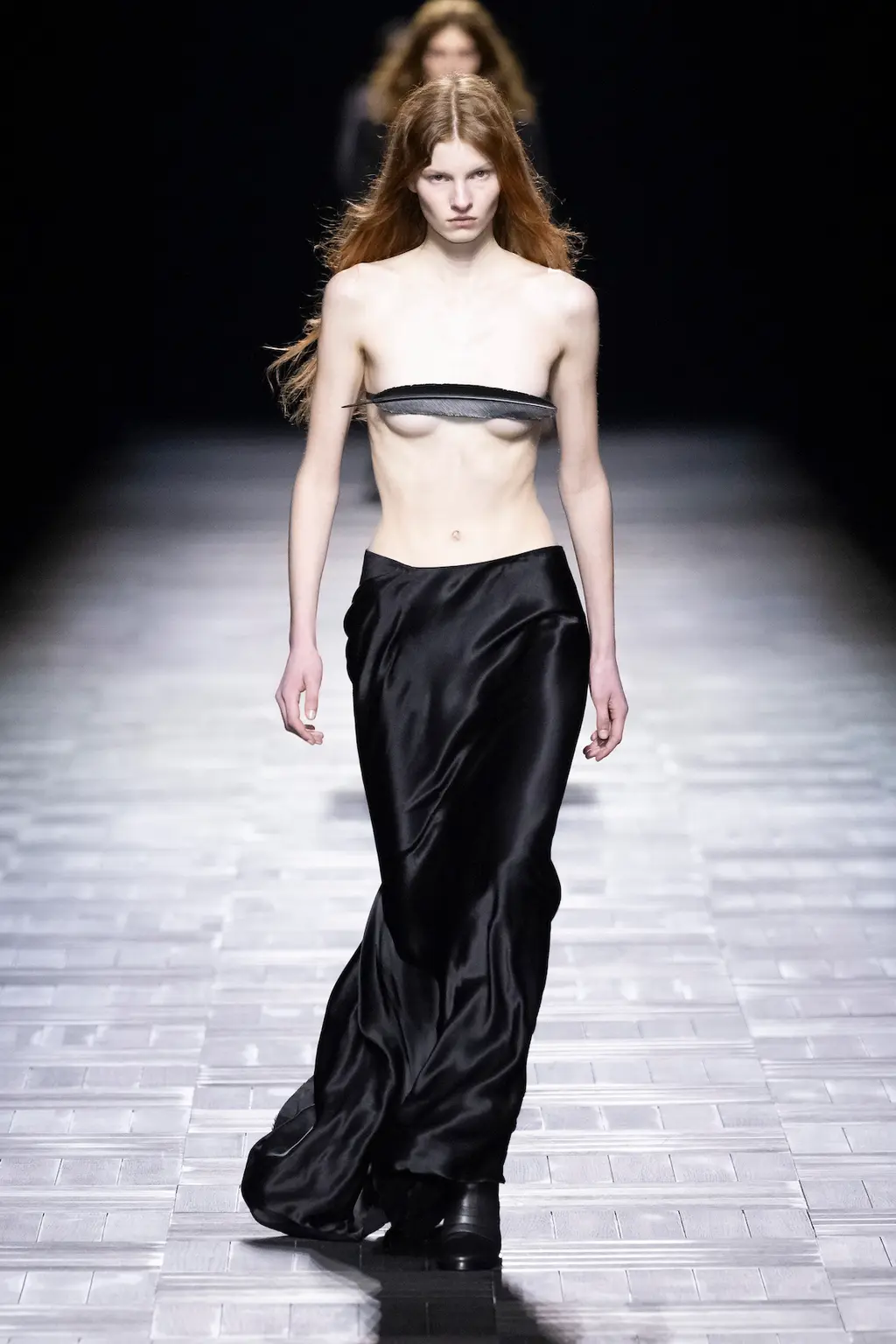 Sexy – to be expected, given that de Saint Sernin’s own namesake brand has referenced S&M and homoerotica, and championed a gender-blurring agenda with fabulous men in fabulous miniskirts. It’s a contrast to Ann Demeulemeester’s monumental sartorial history that’s mystical, bewitching, darkly romantic and even aggressive at times. But de Saint Sernin didn’t stray too far from the blueprint, starting with a monochrome palette on a lot of leather: trousers, trenches, gloves, blazers. The designer’s saucy wink to his signature style came most brazenly when women wore tops with just a feather covering their nipples, and sheer dresses that wrapped around the body. Besides those more arty pieces, de Saint Sernin’s debut did retain Demeulemeester’s wearability in the shirts, jumpers and eveningwear, and felt a little pulsating, more underground, as opposed to up in the midnight sky, flying across a full moon with Patti Smith.