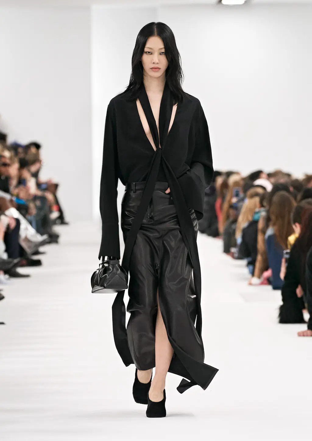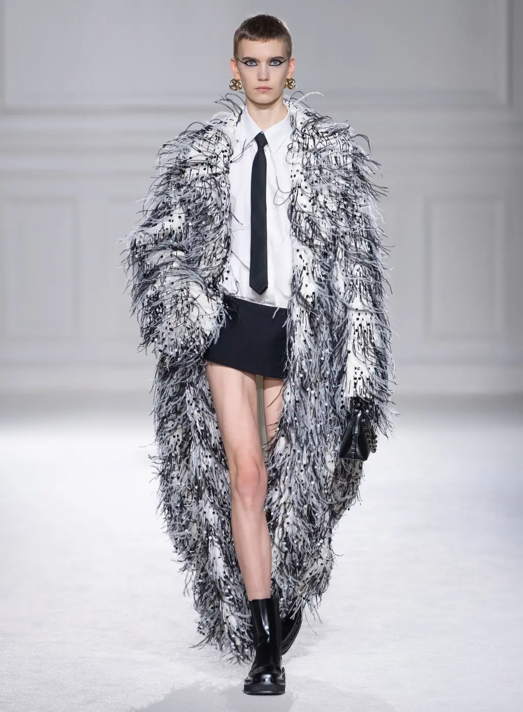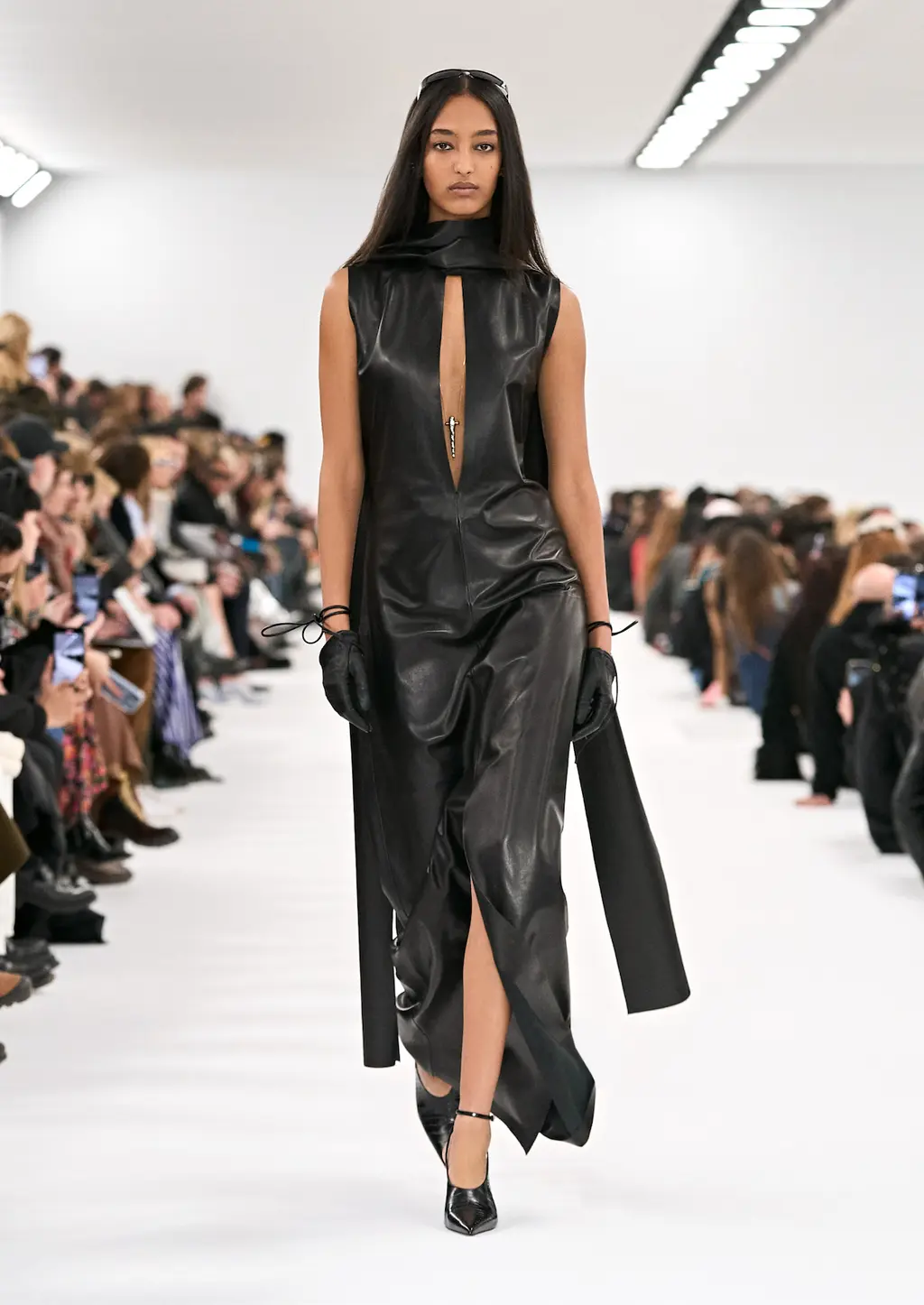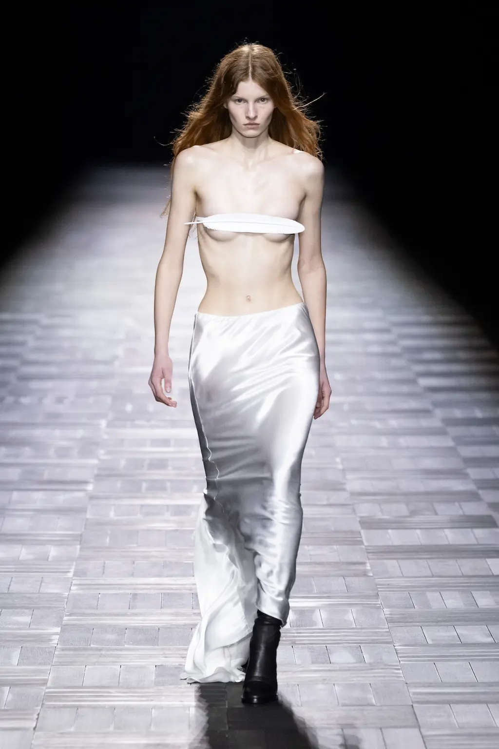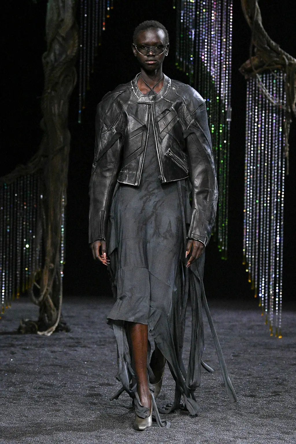 Sexy – to be expected, given that de Saint Sernin’s own namesake brand has referenced S&M and homoerotica, and championed a gender-blurring agenda with fabulous men in fabulous miniskirts. It’s a contrast to Ann Demeulemeester’s monumental sartorial history that’s mystical, bewitching, darkly romantic and even aggressive at times. But de Saint Sernin didn’t stray too far from the blueprint, starting with a monochrome palette on a lot of leather: trousers, trenches, gloves, blazers. The designer’s saucy wink to his signature style came most brazenly when women wore tops with just a feather covering their nipples, and sheer dresses that wrapped around the body. Besides those more arty pieces, de Saint Sernin’s debut did retain Demeulemeester’s wearability in the shirts, jumpers and eveningwear, and felt a little pulsating, more underground, as opposed to up in the midnight sky, flying across a full moon with Patti Smith.