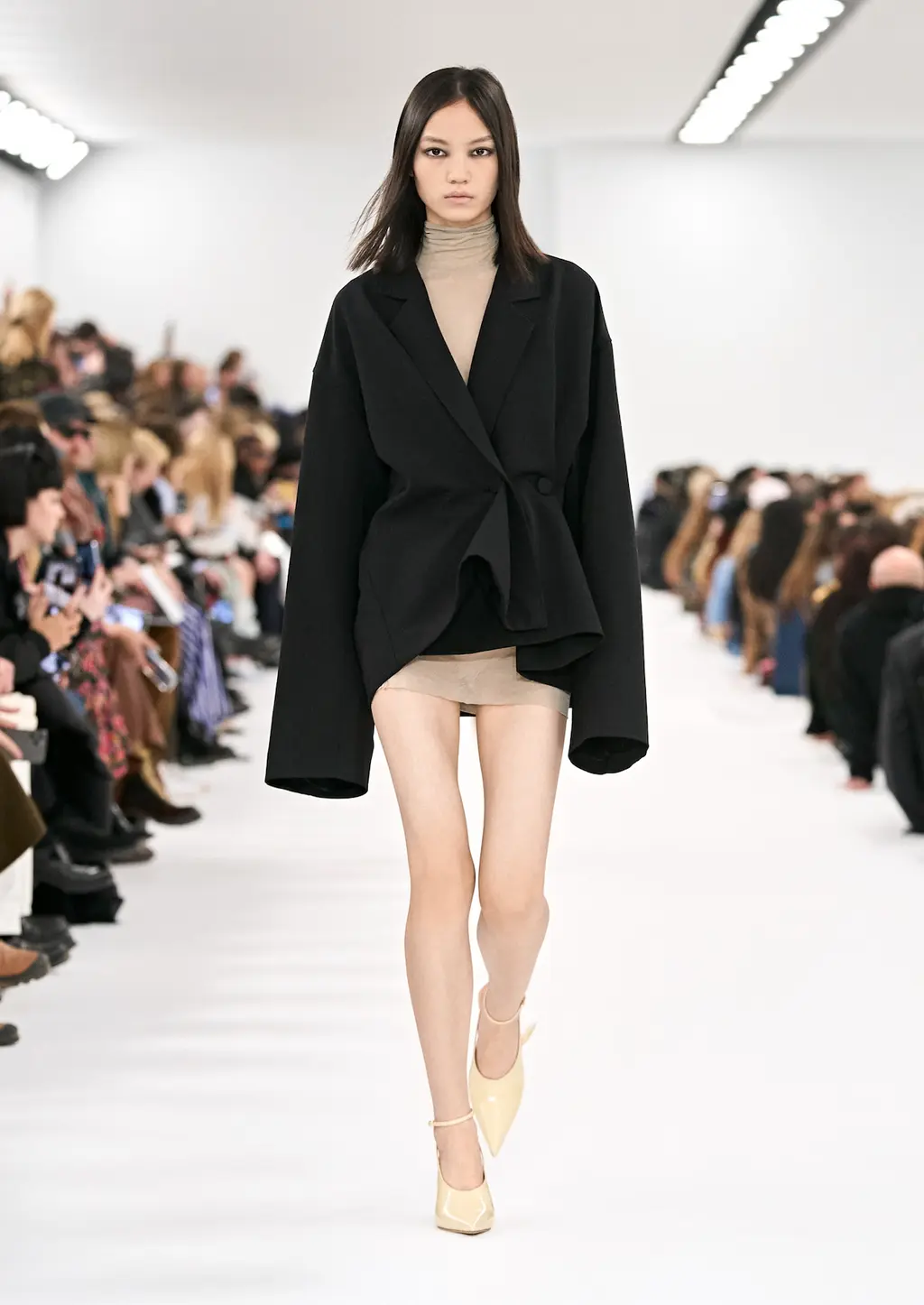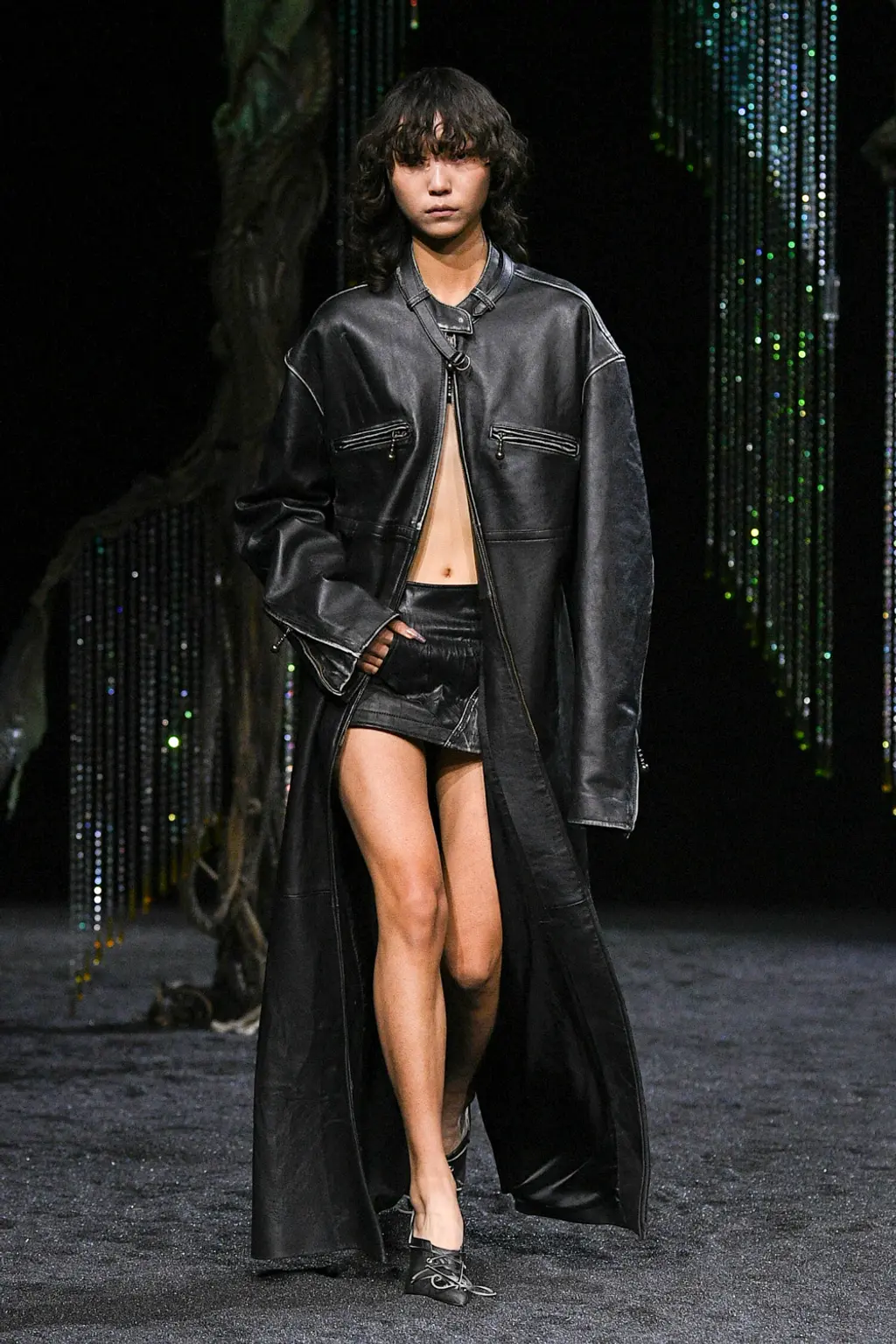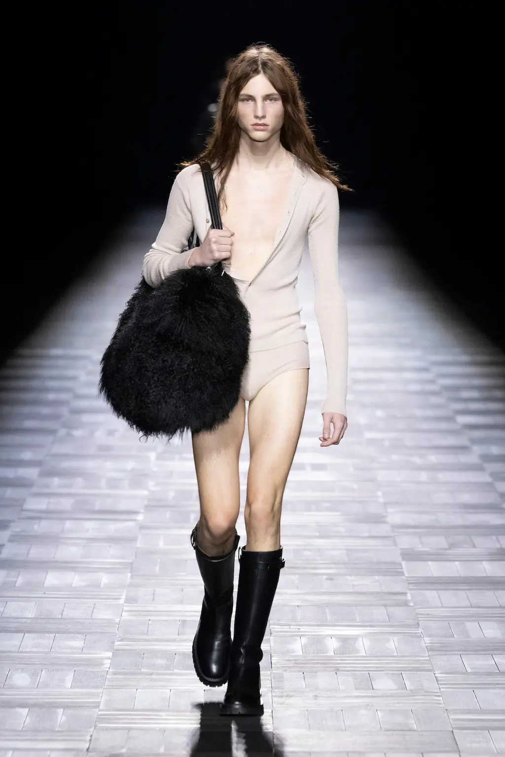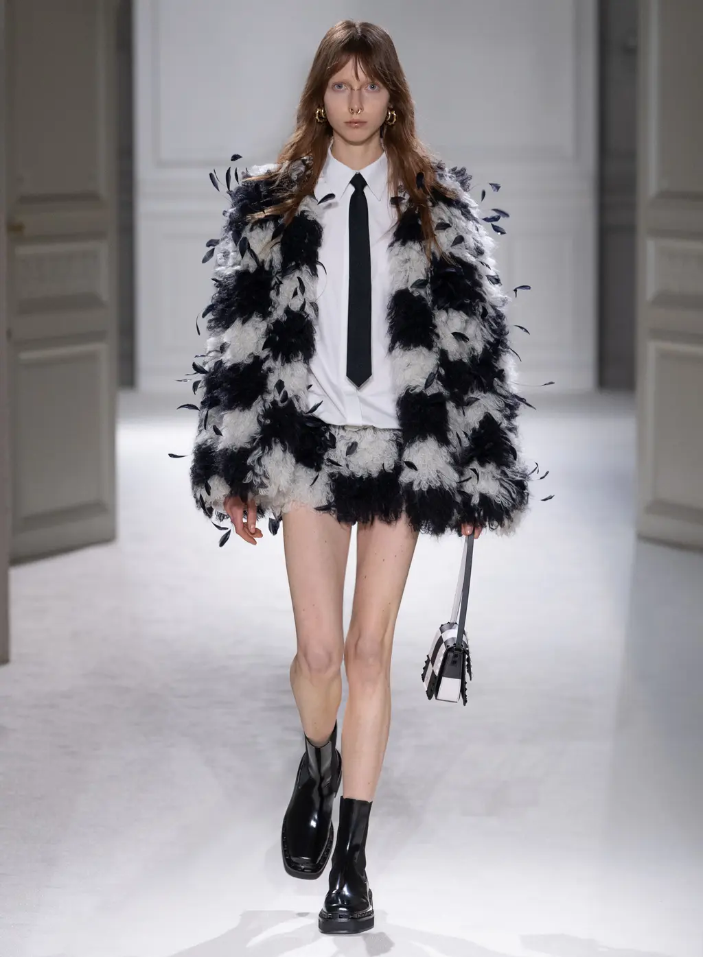 Sexy – to be expected, given that de Saint Sernin’s own namesake brand has referenced S&M and homoerotica, and championed a gender-blurring agenda with fabulous men in fabulous miniskirts. It’s a contrast to Ann Demeulemeester’s monumental sartorial history that’s mystical, bewitching, darkly romantic and even aggressive at times. But de Saint Sernin didn’t stray too far from the blueprint, starting with a monochrome palette on a lot of leather: trousers, trenches, gloves, blazers. The designer’s saucy wink to his signature style came most brazenly when women wore tops with just a feather covering their nipples, and sheer dresses that wrapped around the body. Besides those more arty pieces, de Saint Sernin’s debut did retain Demeulemeester’s wearability in the shirts, jumpers and eveningwear, and felt a little pulsating, more underground, as opposed to up in the midnight sky, flying across a full moon with Patti Smith.