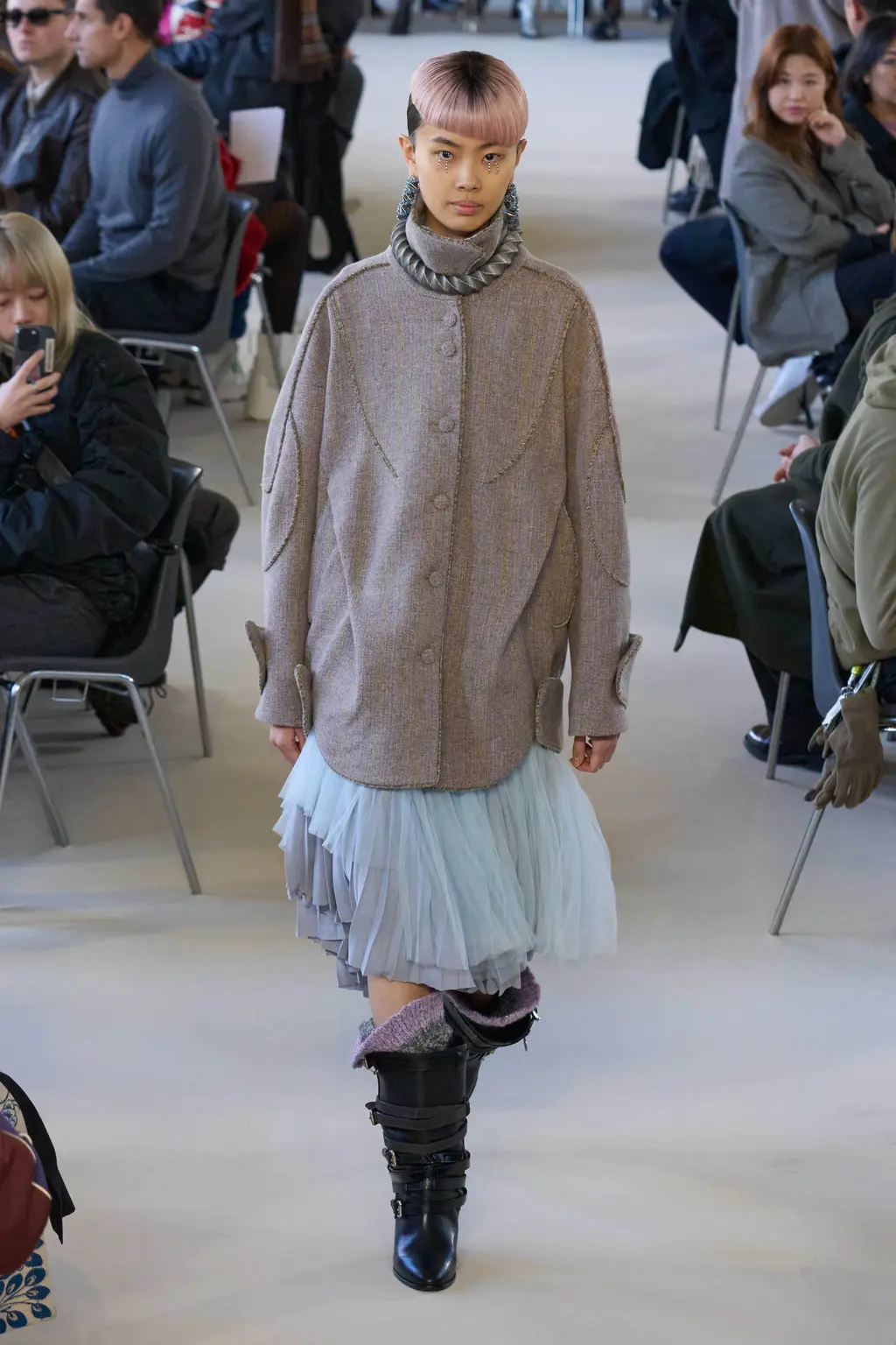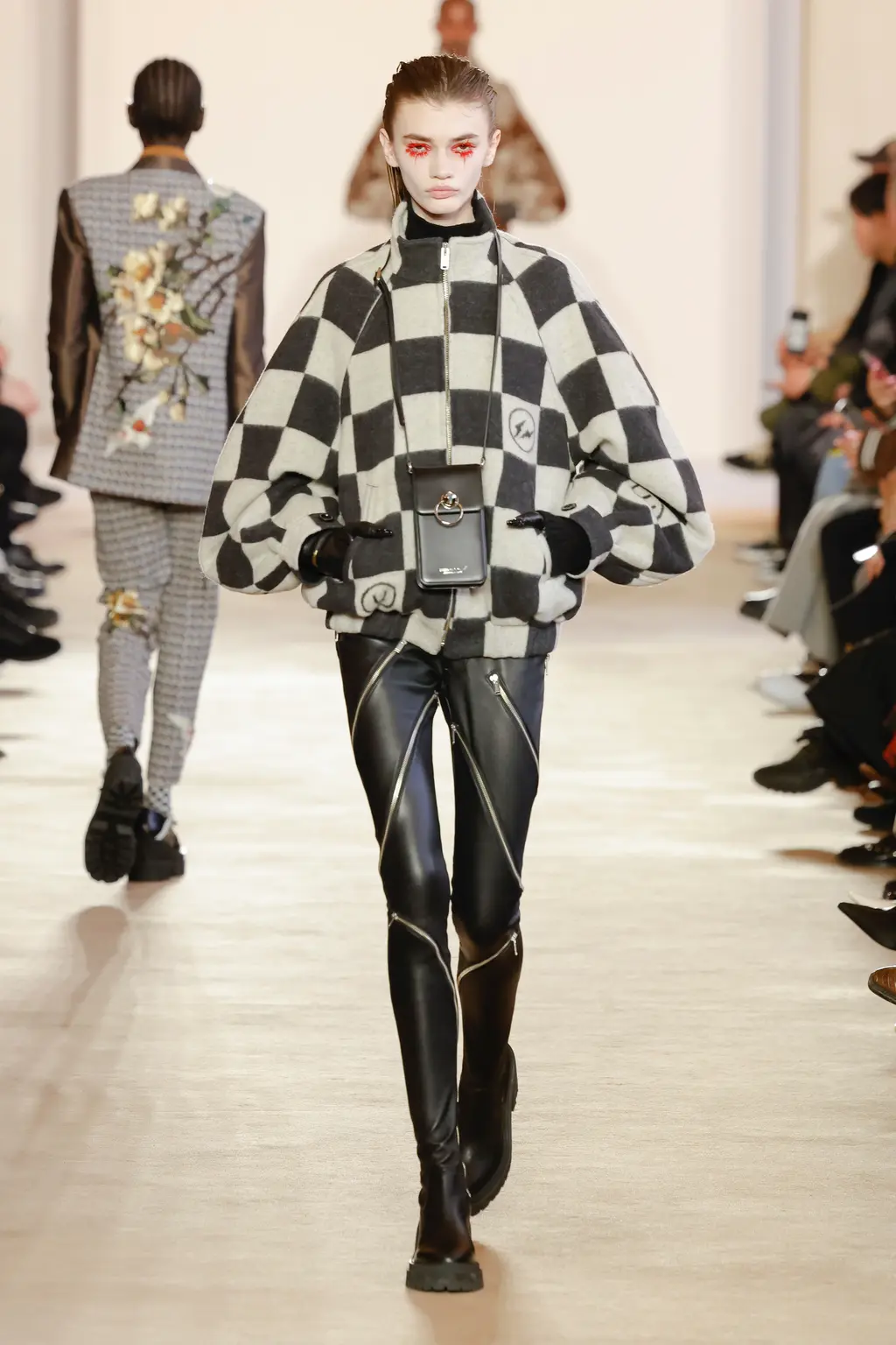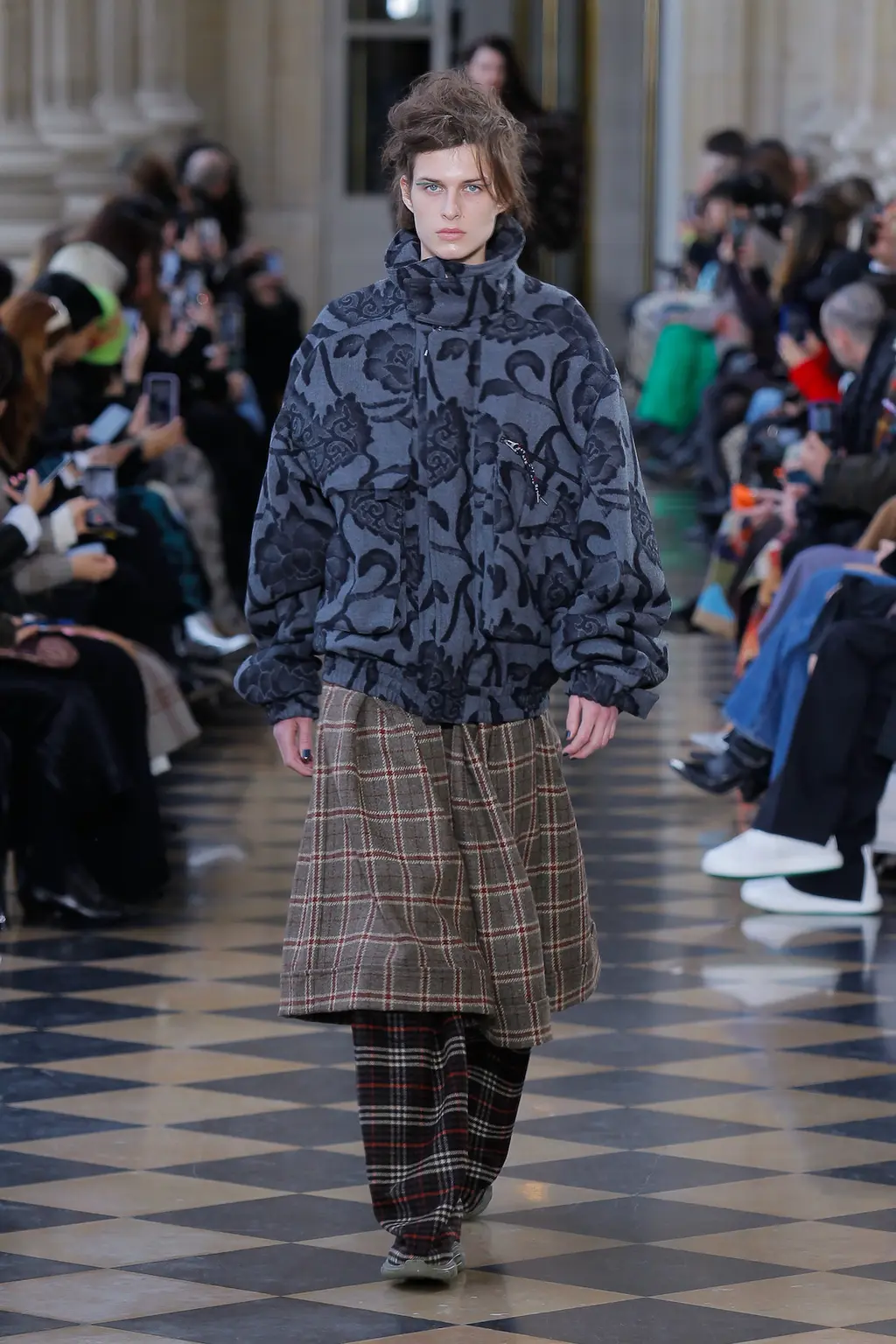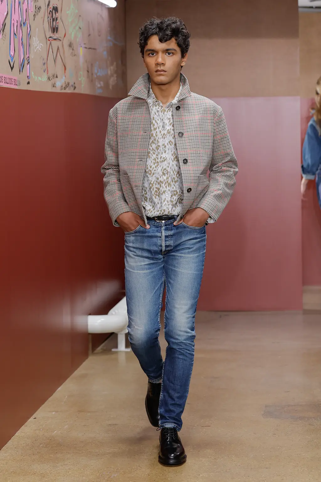 Coventry, 1979. Lots of three-button suits, skinny ties and subculture. Even the socks featured the black-and-white check of English record label 2 Tone. Takahashi was paying tribute to the late Terry Hall, lead singer of The Specials, who passed away in December. And the ode was extended to the jackets, which featured the lyrics Enjoy Yourself (It’s Later Than You Think) on the back, as well as the soundtrack, which saw several Specials tracks mixed by FRGMT’s Hiroshi Fujiwara (who, in 1994, released a single with Hall, and whose name we clocked on some of the looks). Extra poignancy was added by the fact that the tracks were mixed with music by innovative ambient composer Manuel Göttsching, who also died in December, and whose record, E2 – E4, also featured a chequered design referenced by Takahashi. No longer a paean to staying out late by a 21-year-old Terry Hall, Enjoy Yourself (It’s Later Than You Think) became a meditation on life and death. To “staying in the pink” – something Takashi appears to be doing very well.
