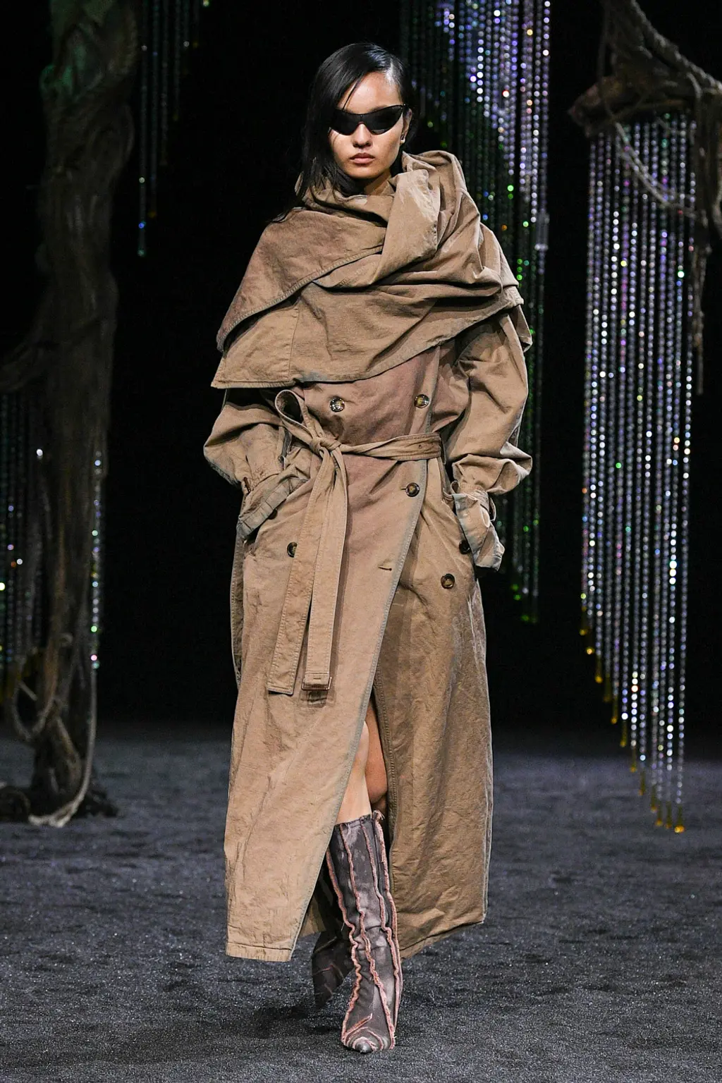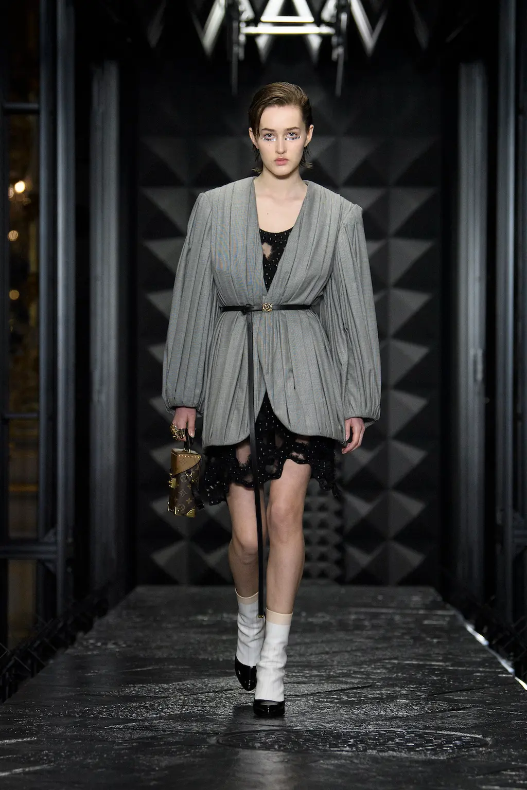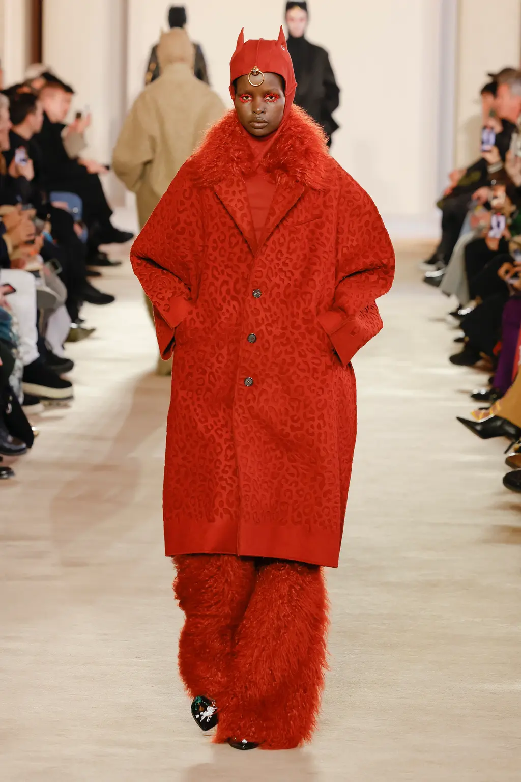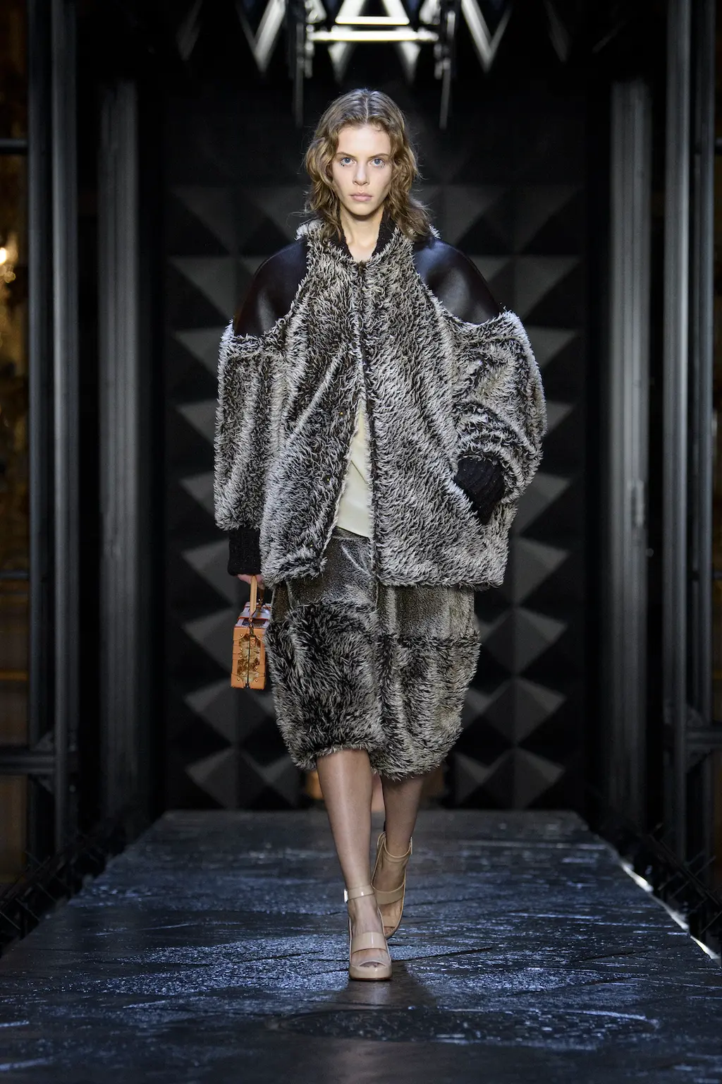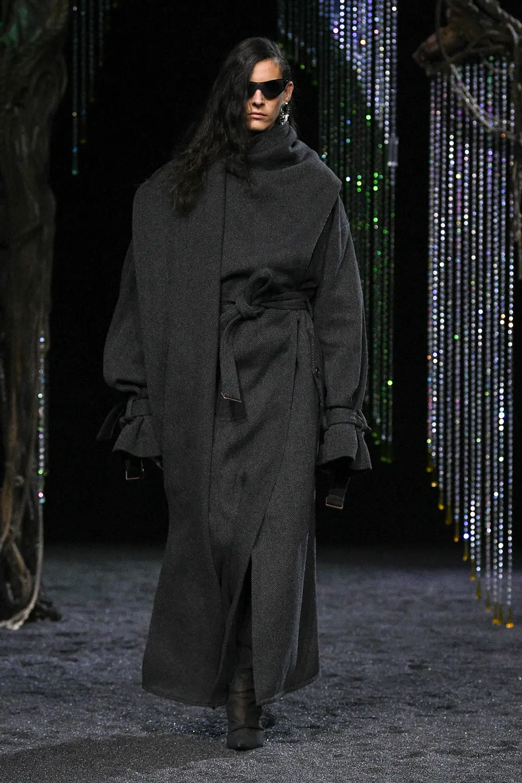 Opening with some really simple pieces of caping (apparently inspired by Little Red Riding Hood), followed by an actual hood (trimmed with faux fur to Rapunzel effect), the collection was indebted to fables, particularly those of 17th century poet Jean de la Fontaine, and even more particularly, his telling of The Wolf and the Lamb (in which the wolf, err, eats the lamb). This time the antagonists were humans and technology. But they just have easily been the brand and its more theatrical impulses. Which will win? Tonight, it was impulses: the Boston Dynamics robot-dogs, which often pulled the eye away from the fashion. But ultimately it will be the clothes, which feels as though they exist in and engage with the modern world perhaps better than anyone else is doing today