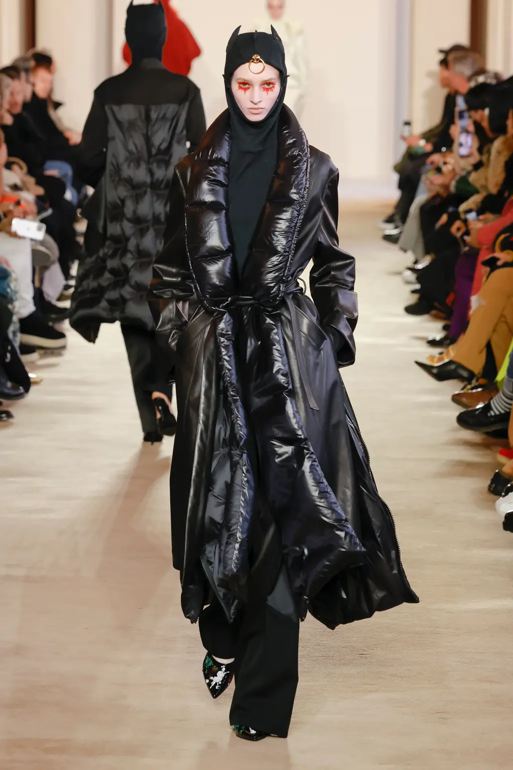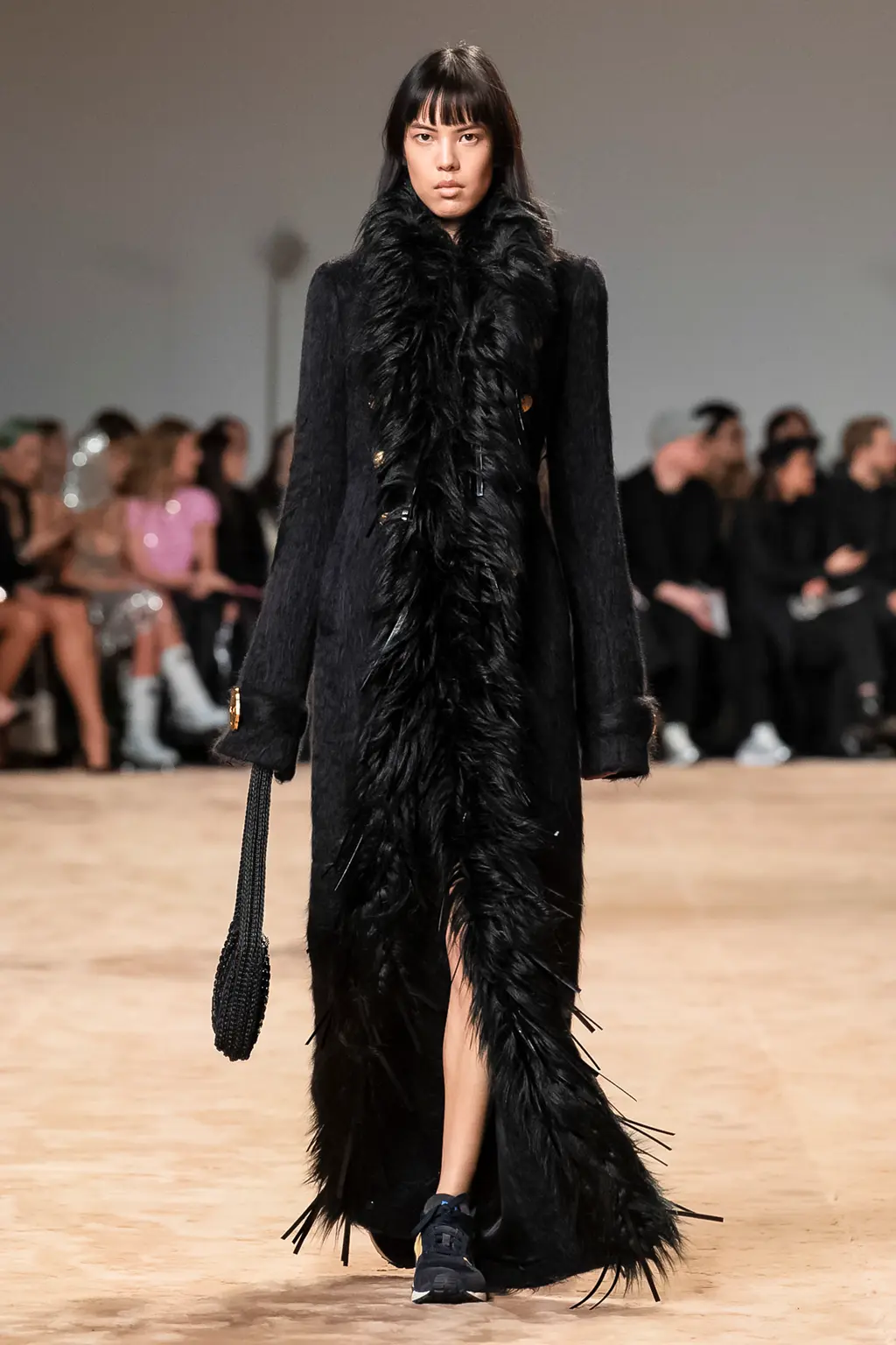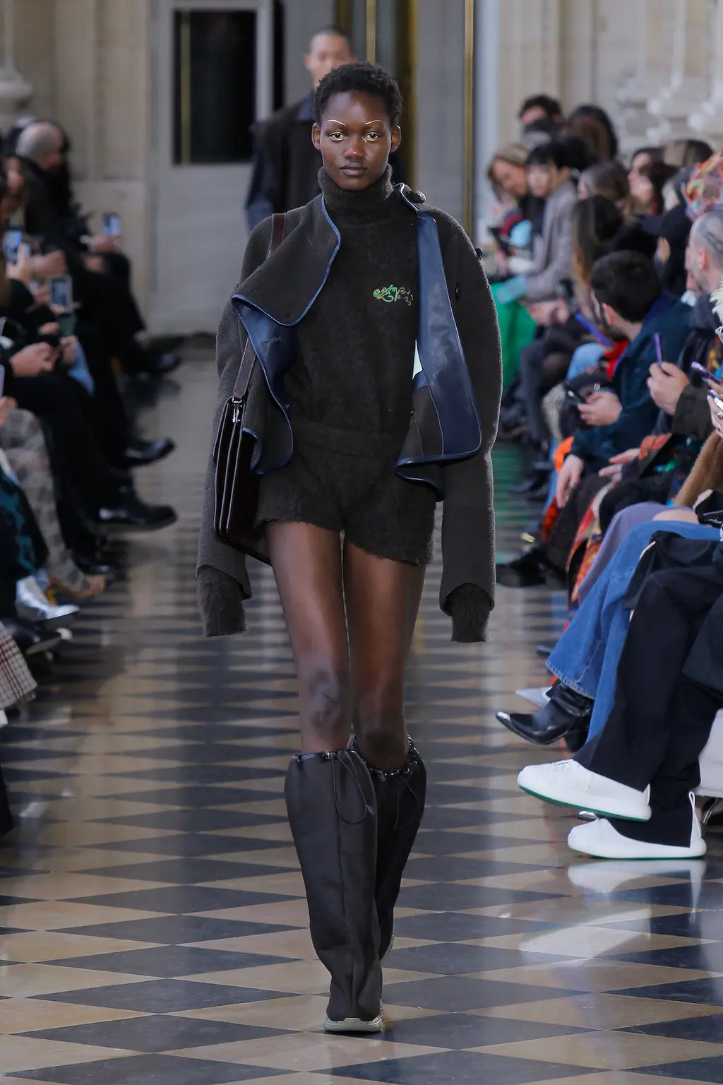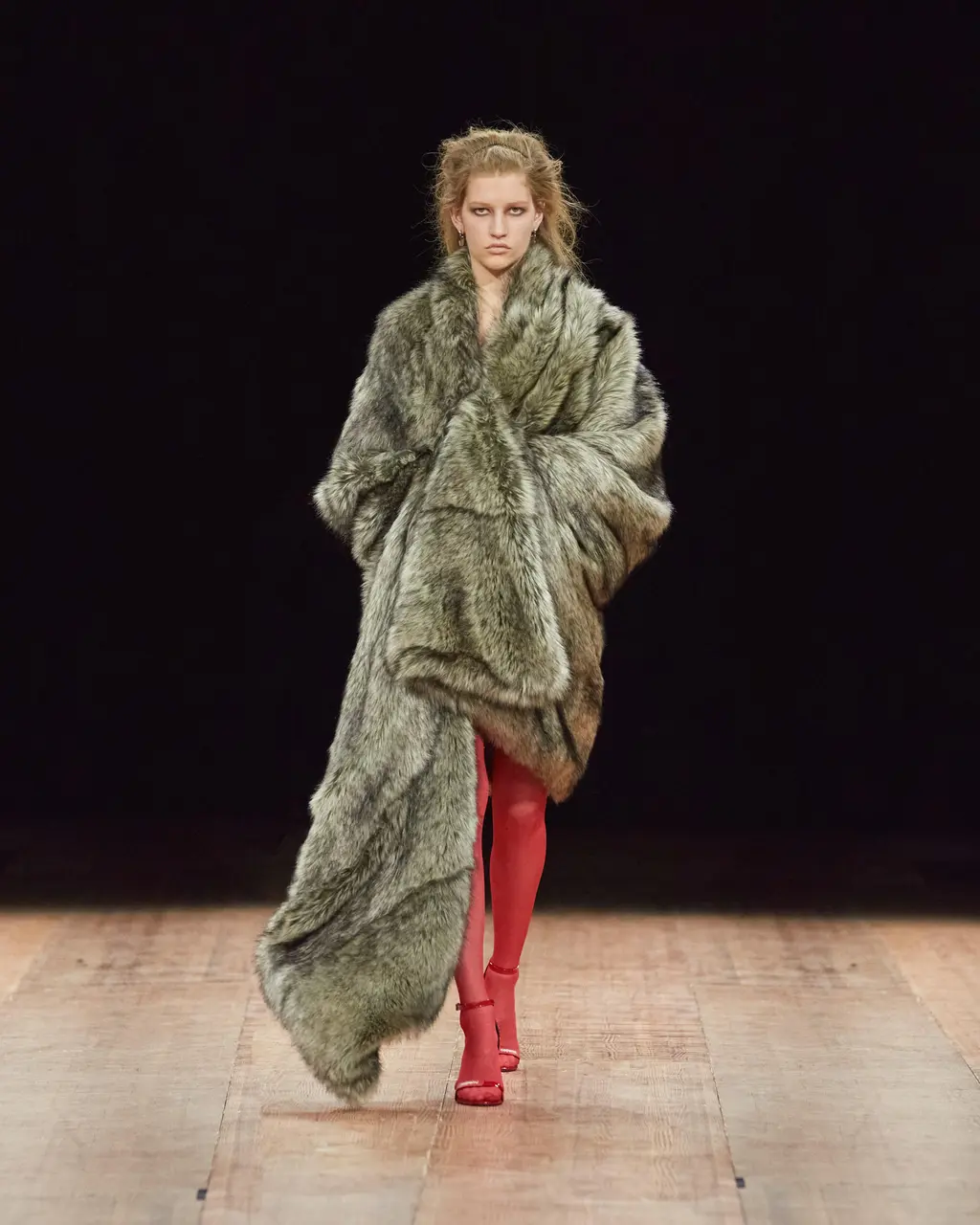Opening with some really simple pieces of caping (apparently inspired by Little Red Riding Hood), followed by an actual hood (trimmed with faux fur to Rapunzel effect), the collection was indebted to fables, particularly those of 17th century poet Jean de la Fontaine, and even more particularly, his telling of The Wolf and the Lamb (in which the wolf, err, eats the lamb). This time the antagonists were humans and technology. But they just have easily been the brand and its more theatrical impulses. Which will win? Tonight, it was impulses: the Boston Dynamics robot-dogs, which often pulled the eye away from the fashion. But ultimately it will be the clothes, which feels as though they exist in and engage with the modern world perhaps better than anyone else is doing today