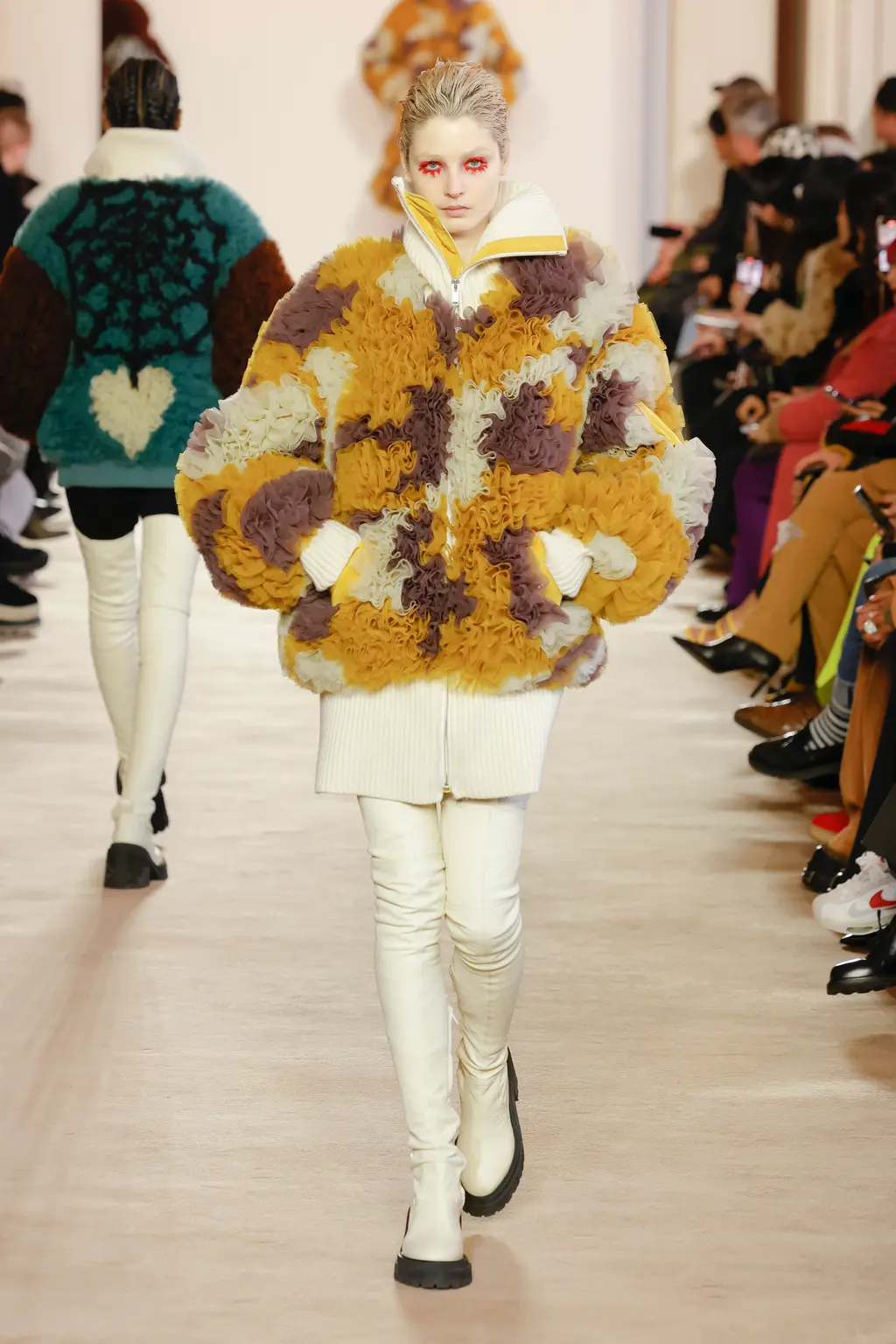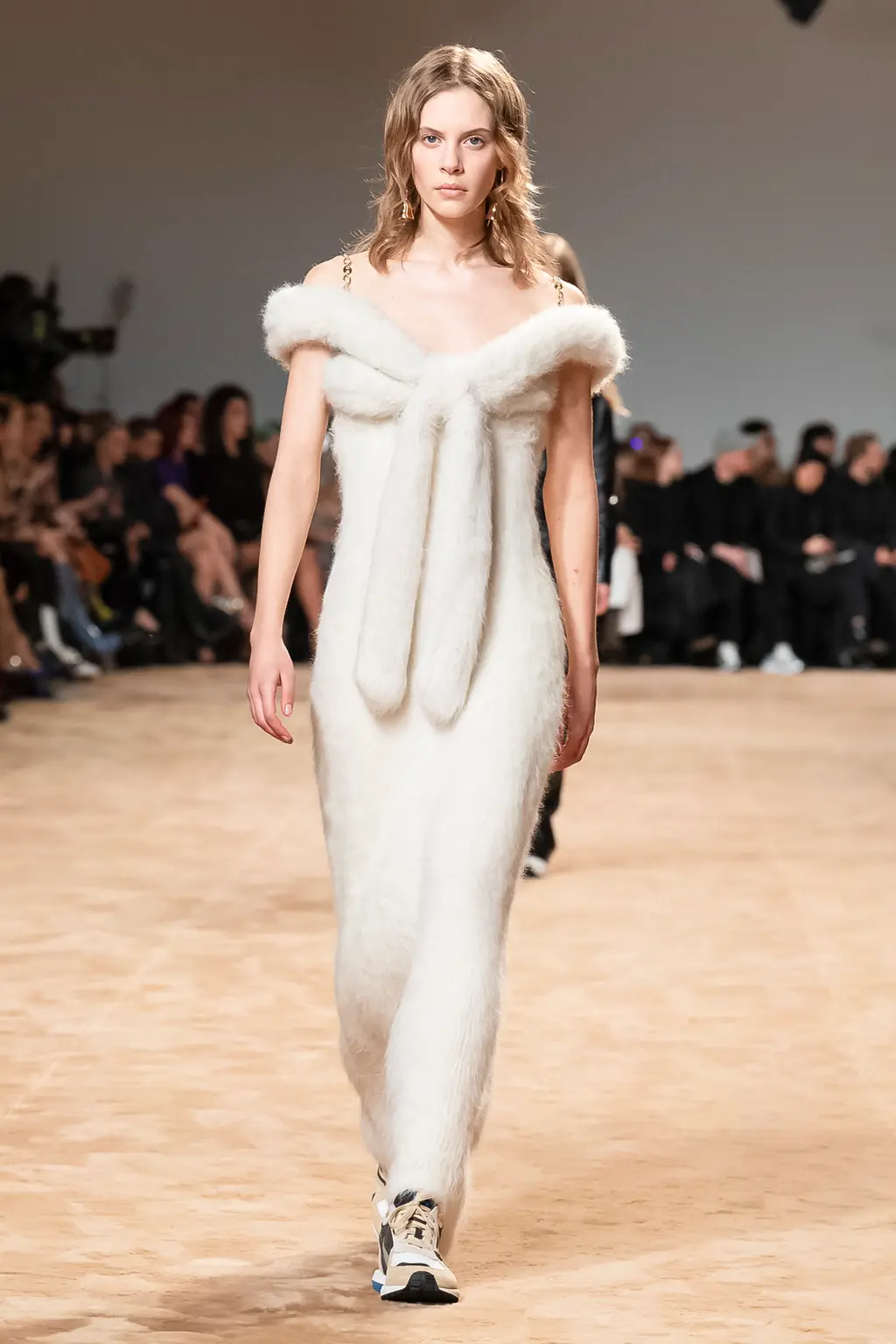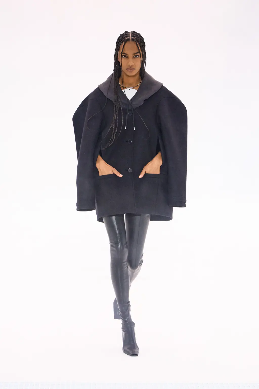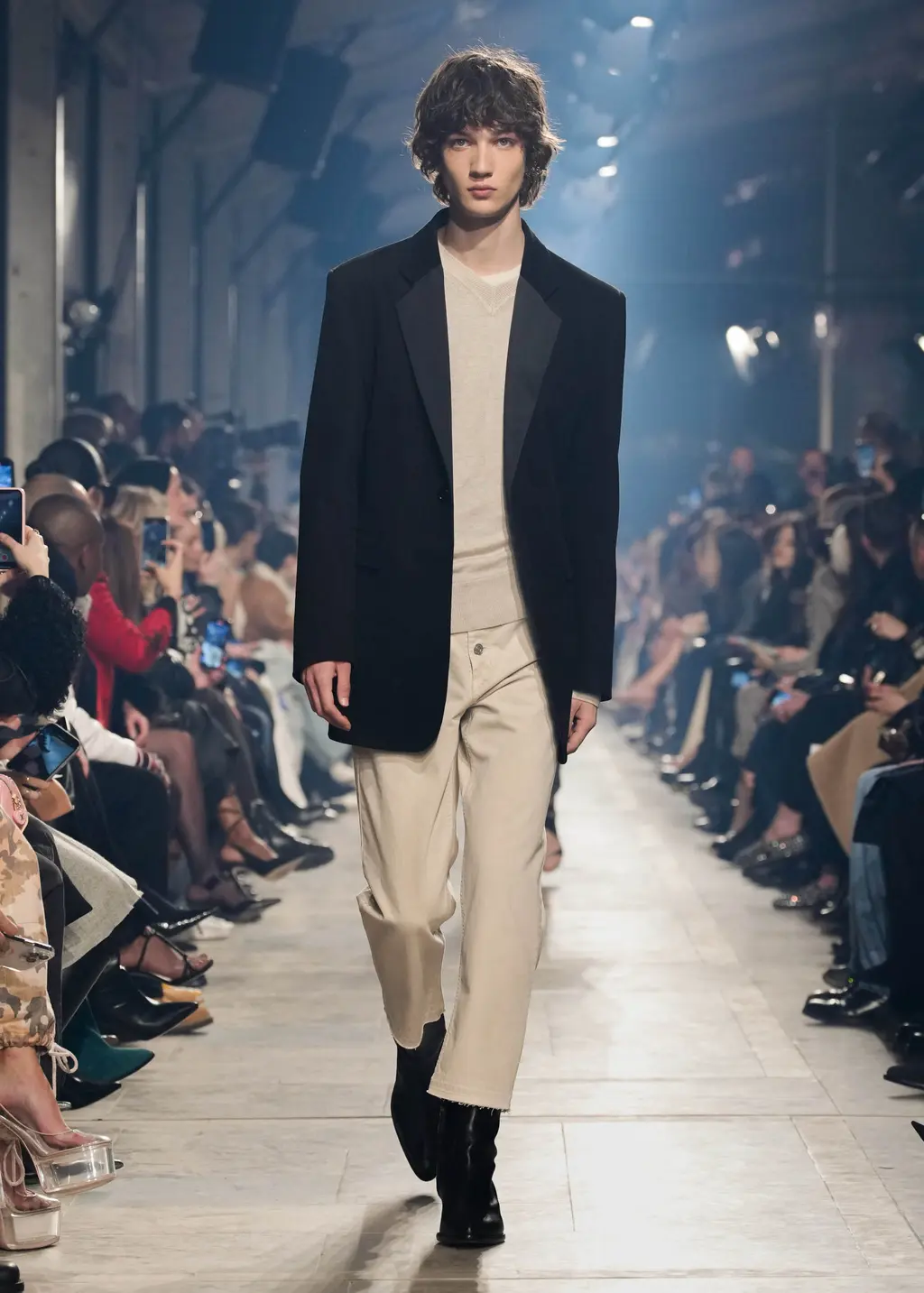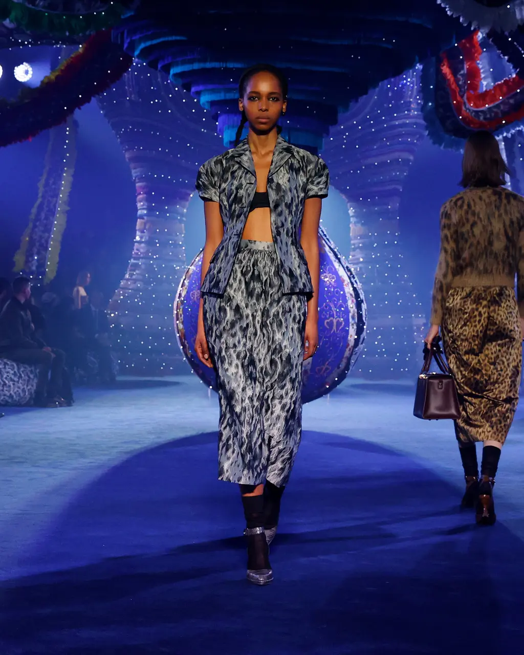 Opening with some really simple pieces of caping (apparently inspired by Little Red Riding Hood), followed by an actual hood (trimmed with faux fur to Rapunzel effect), the collection was indebted to fables, particularly those of 17th century poet Jean de la Fontaine, and even more particularly, his telling of The Wolf and the Lamb (in which the wolf, err, eats the lamb). This time the antagonists were humans and technology. But they just have easily been the brand and its more theatrical impulses. Which will win? Tonight, it was impulses: the Boston Dynamics robot-dogs, which often pulled the eye away from the fashion. But ultimately it will be the clothes, which feels as though they exist in and engage with the modern world perhaps better than anyone else is doing today