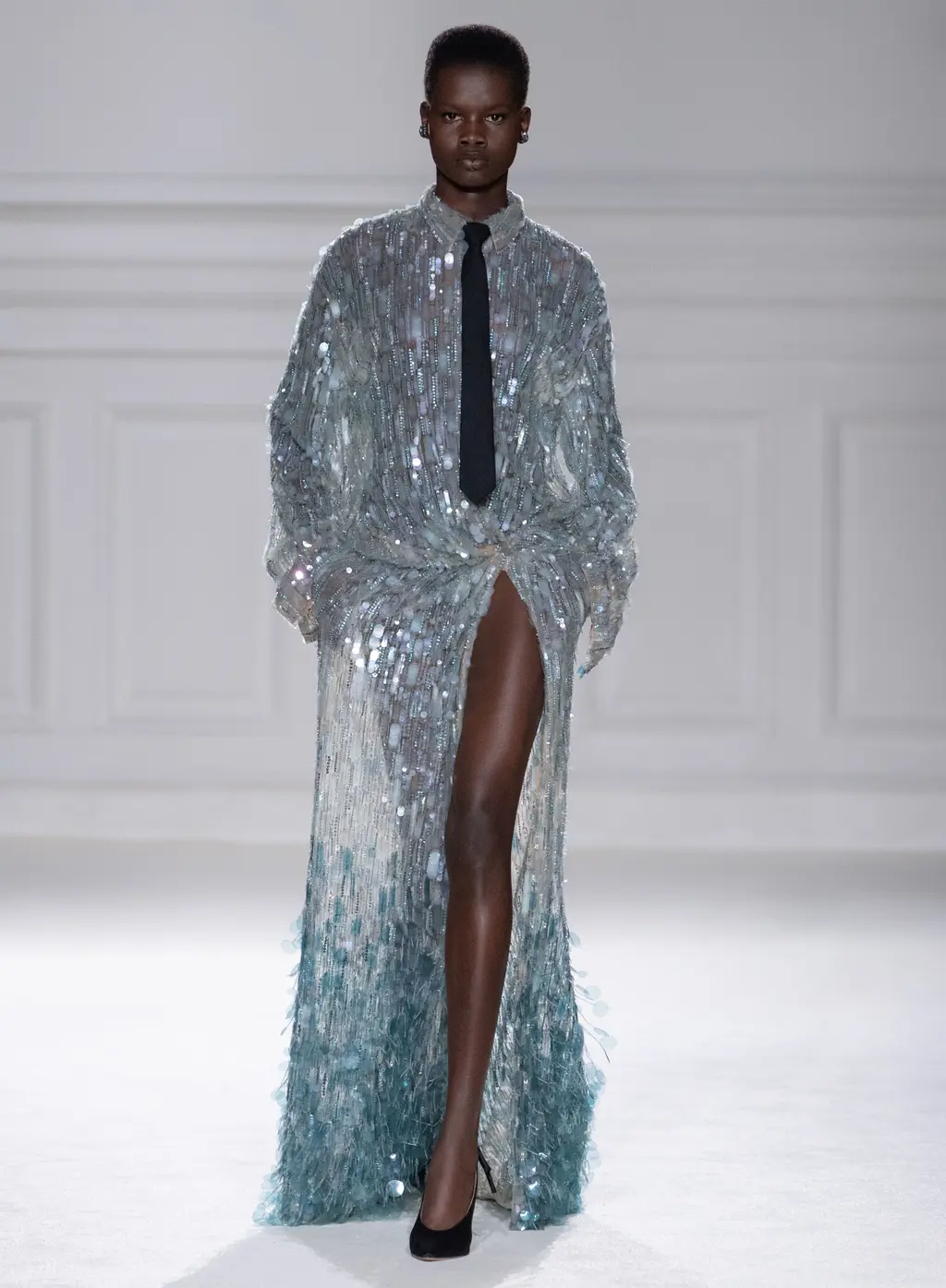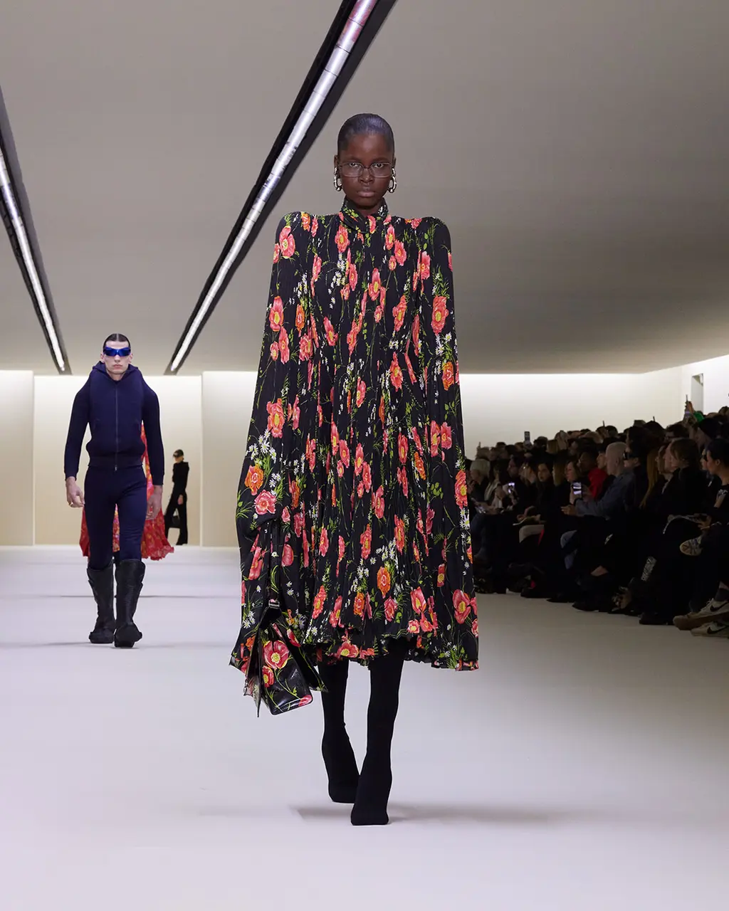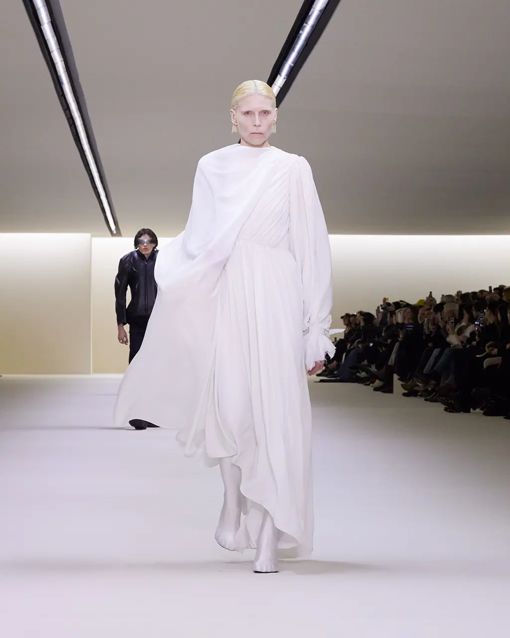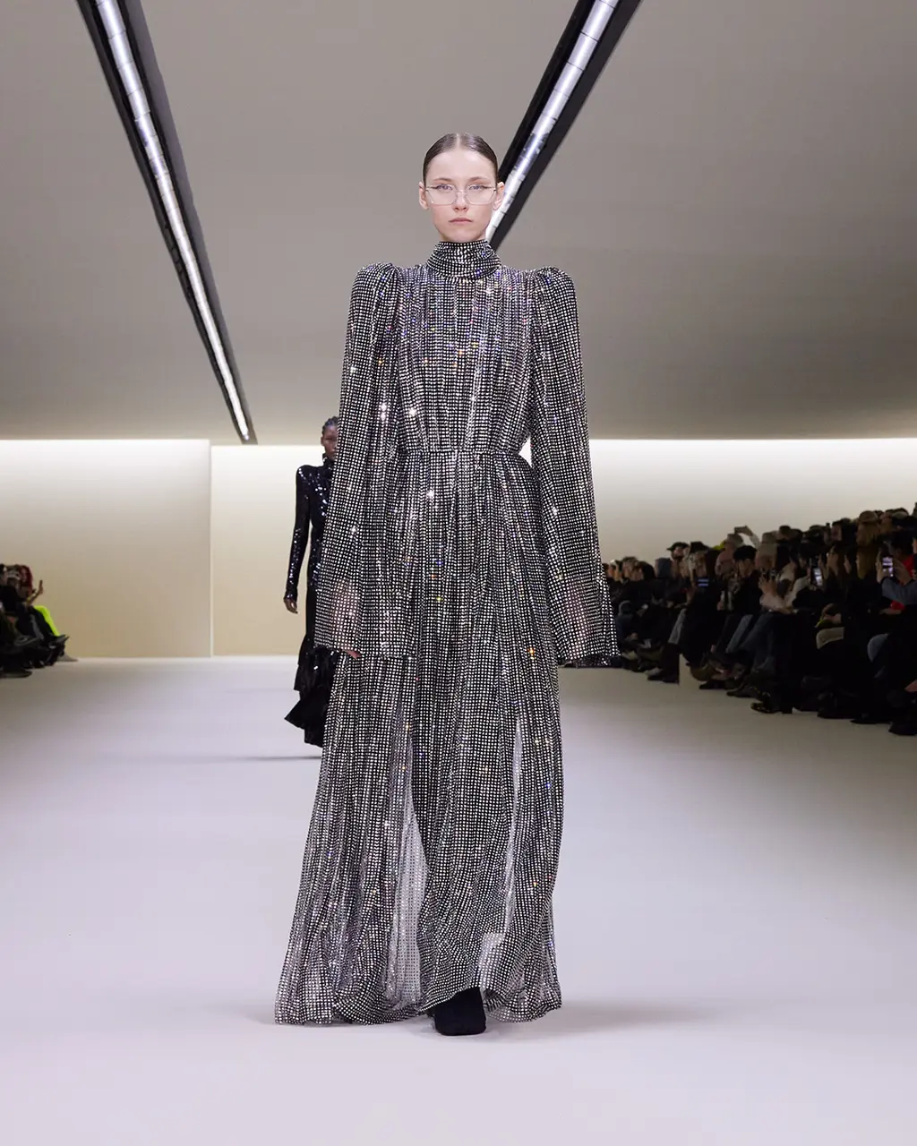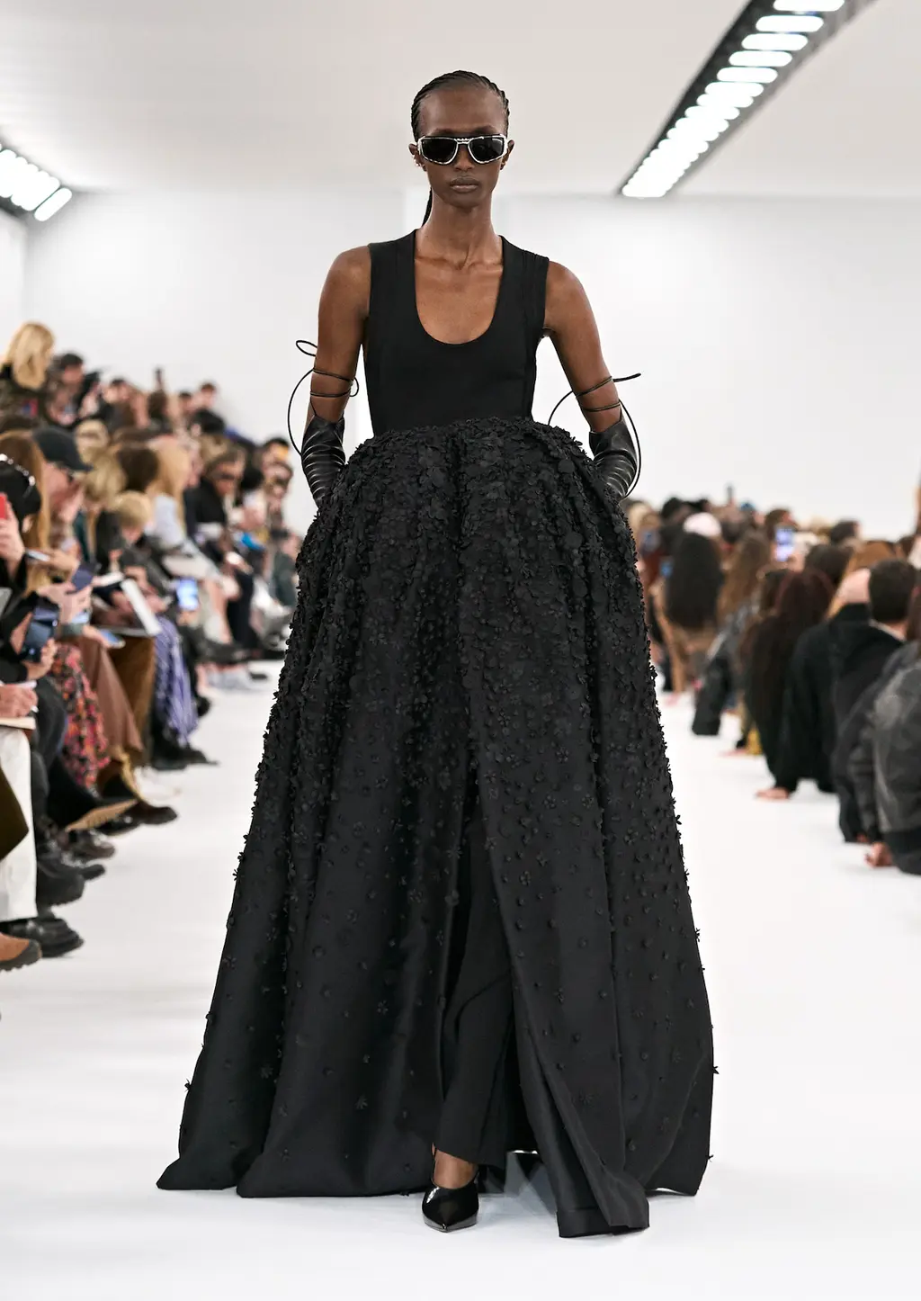 As laid out in the link above, “the emphasis is on my love for the craft of making clothes now,” something creative director Demna confirmed in the show notes, writing: “fashion to me can no longer be seen as an entertainment, but rather as the art of making clothes.” Demna has been such a huge part of that shift to fashion as entertainment over the last decade, beginning with his work at Vetements, and continuing throughout his time at Balenciaga, via celebrity packed campaigns and spectacle-driven shows. Yet, he’s always remained a master maker of clothes, with his couture collections a particular highlight. If the collection on display here felt comparatively simple, it was the intention. And while some of the more business-as-usual Balenciaga-fare (the jackets and hoodies) felt exactly that, the quite staggering floor-length gowns showed what can be achieved when focusing solely on the clothes.
