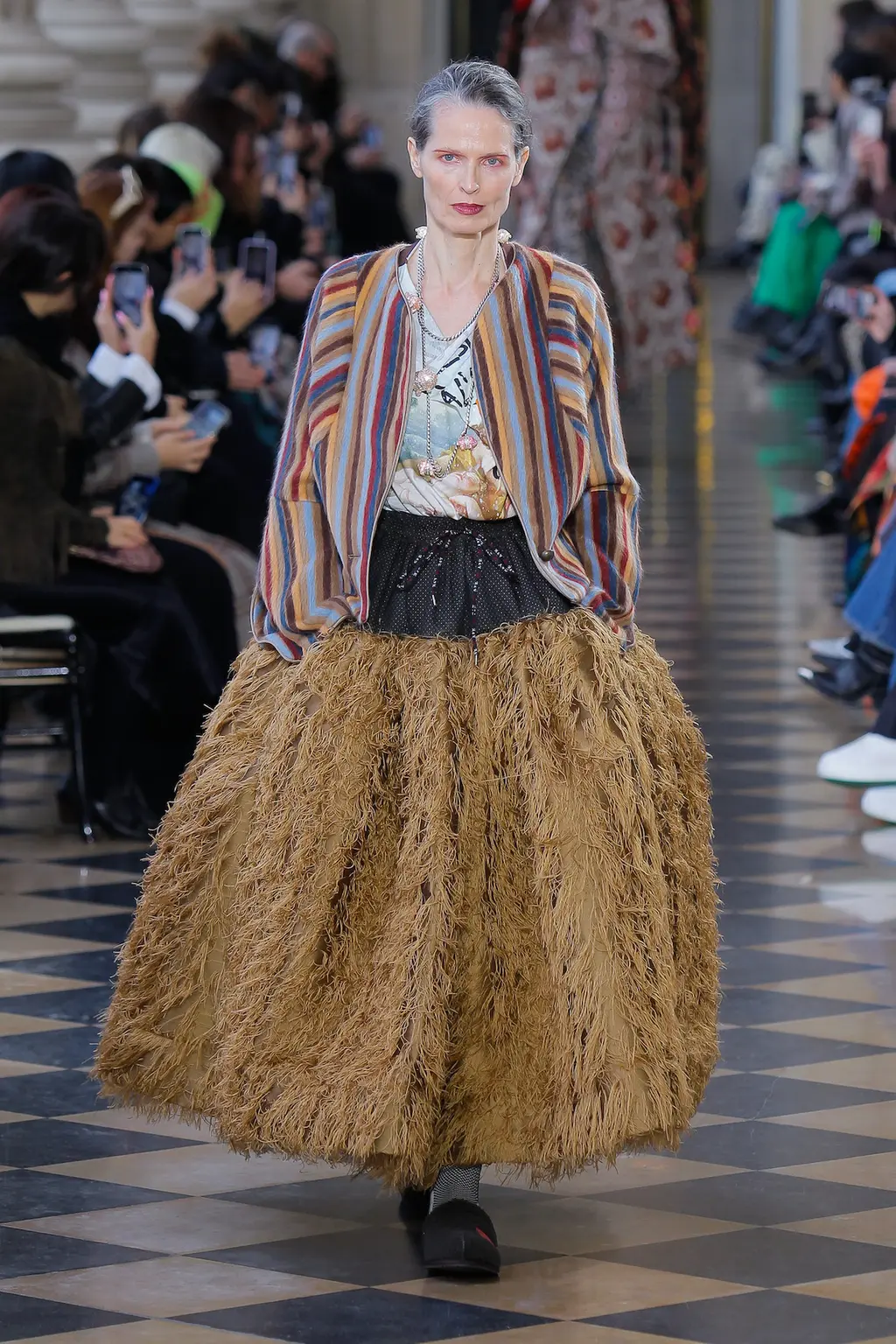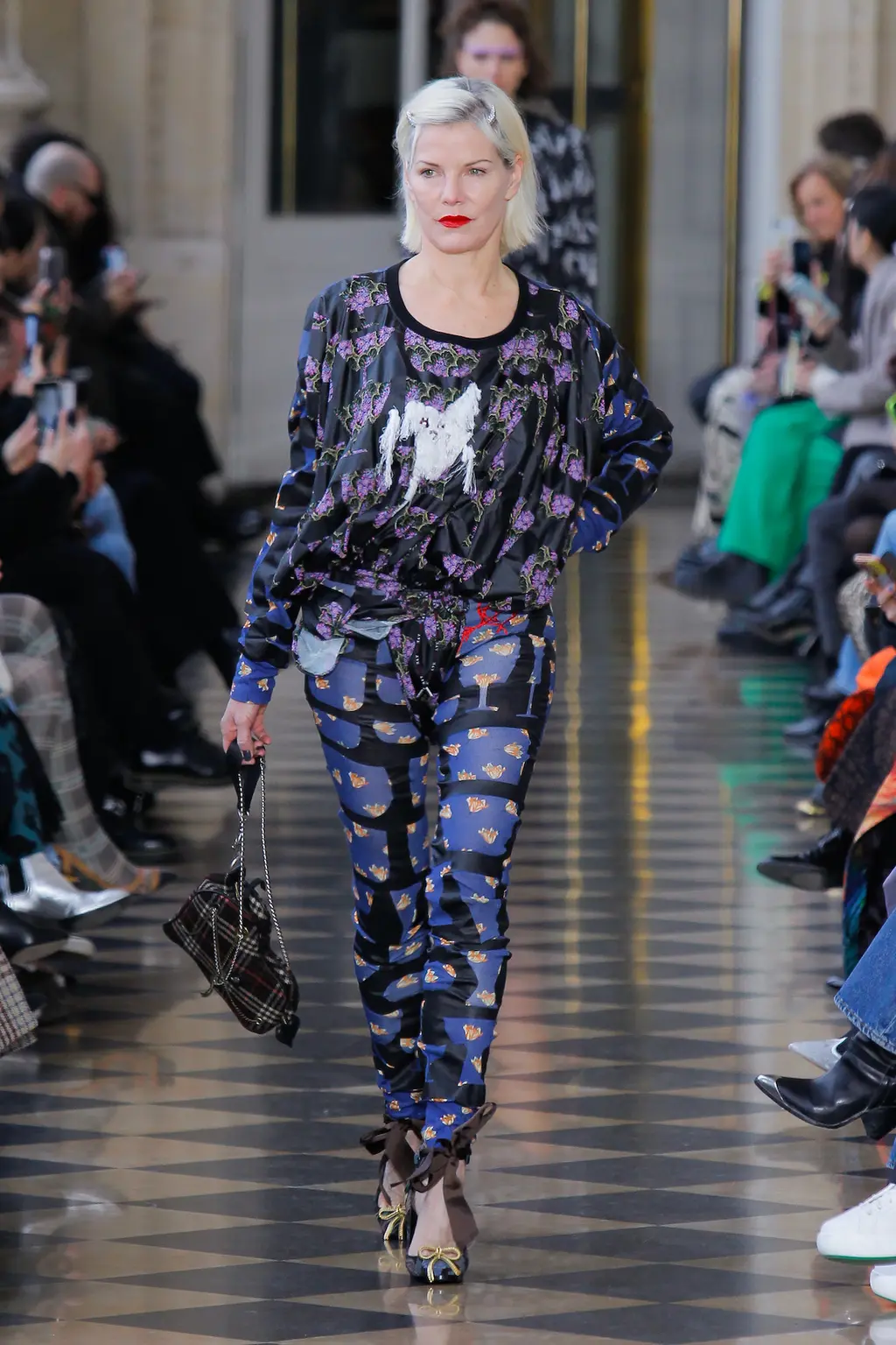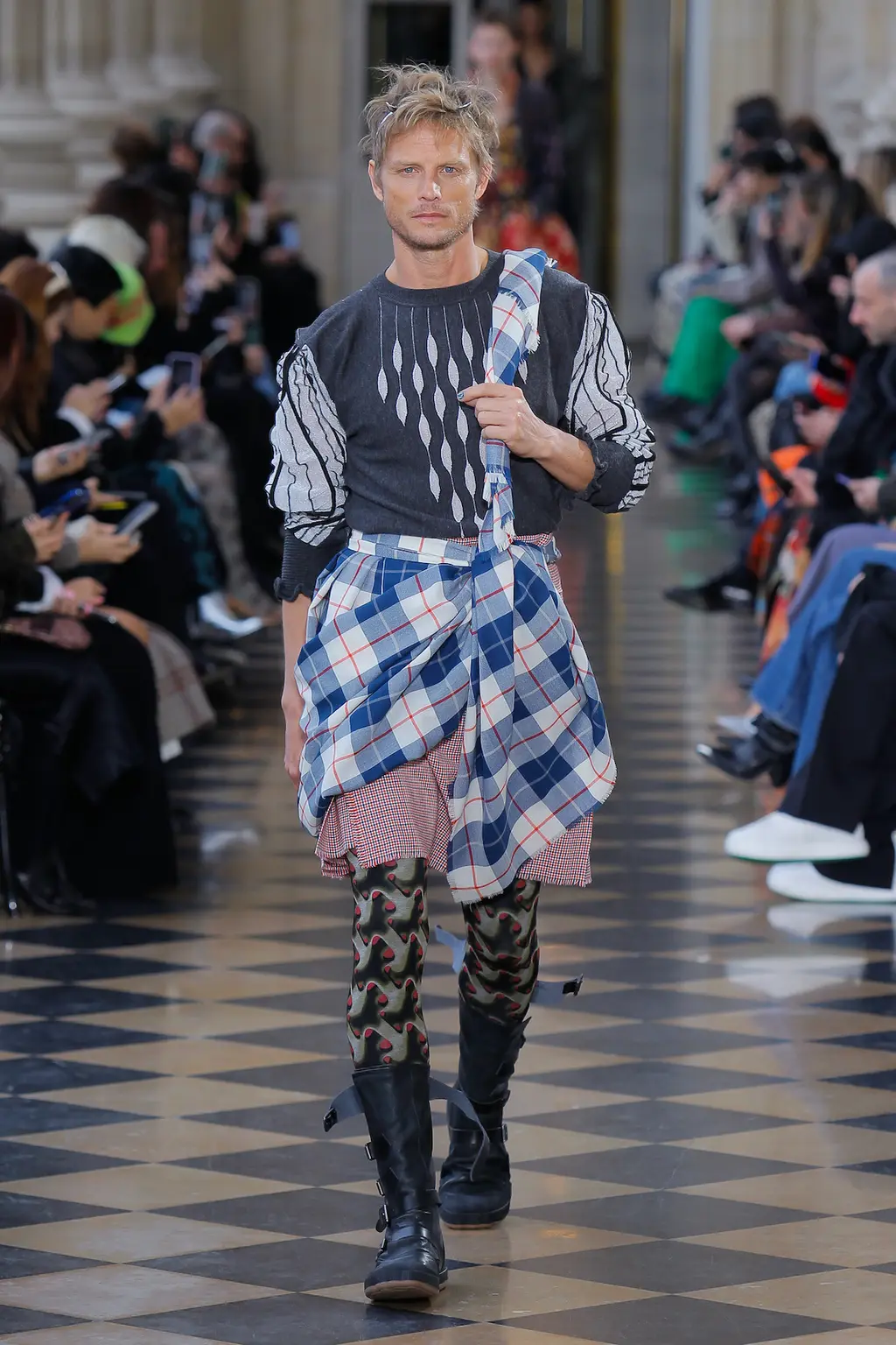 Very moving, with the opening look featuring a top with Vivienne’s image, next to the initials A and V inside a heart. It felt in many ways like a tribute to Vivienne by her husband Andreas, with muse Sara Stockbridge appearing twice and several looks indebted to the designer’s archive: the tweed, the tartan, the corsets, the punkish dog collars and petticoat skirts, many made with antique fabrics collected by Vivienne. What was particularly touching, however, was how Andreas it all felt, too: from the cheeky use of AC/DC’s T.N.T. to the butch fluidity, layering, lederhosen and long johns.