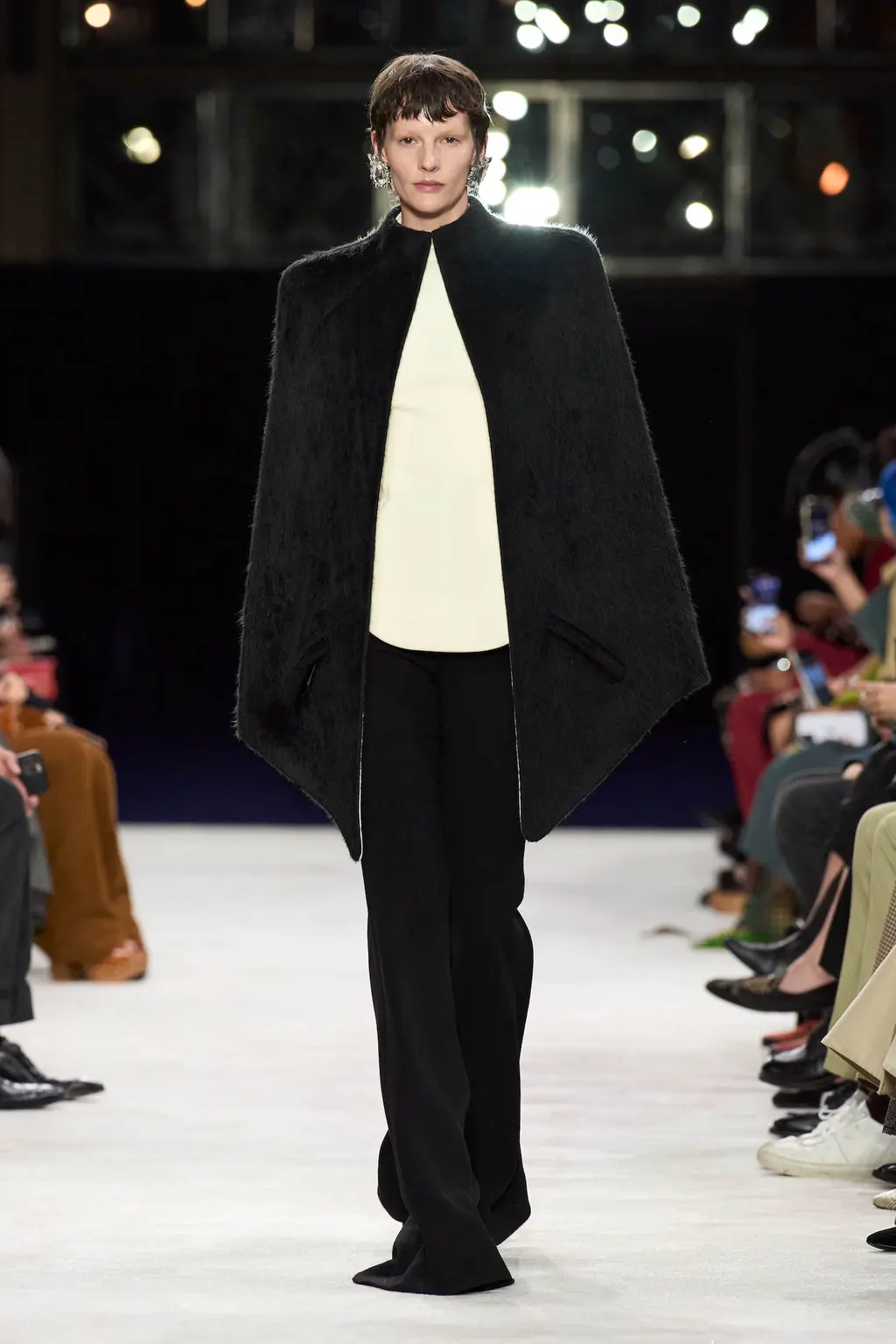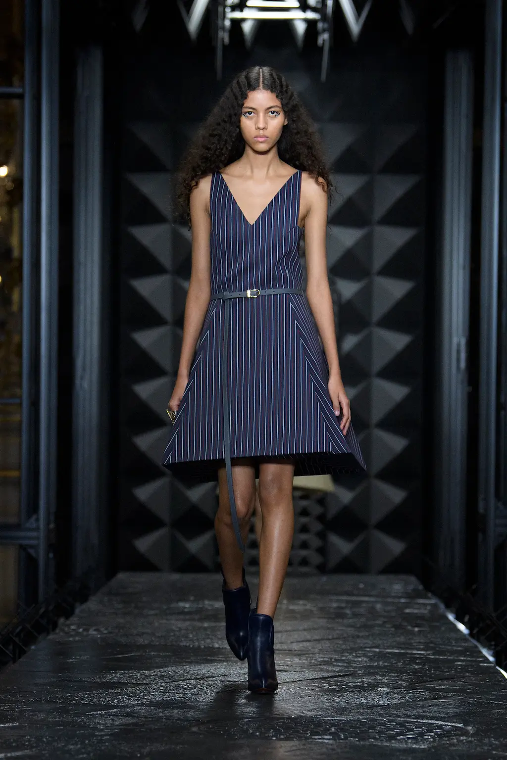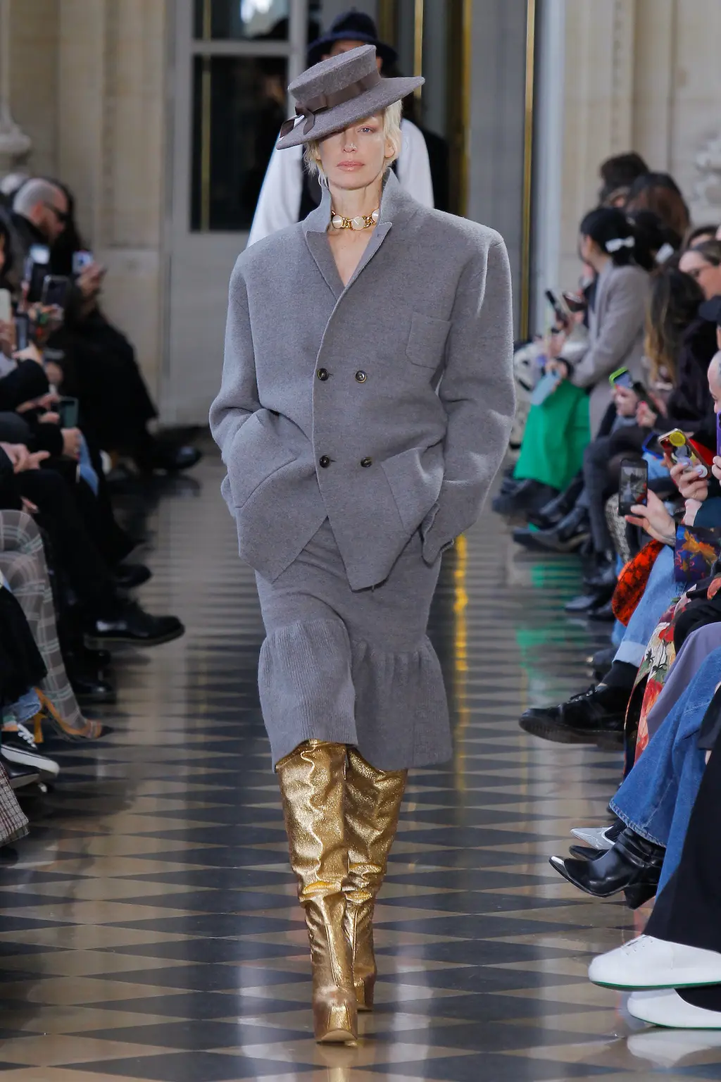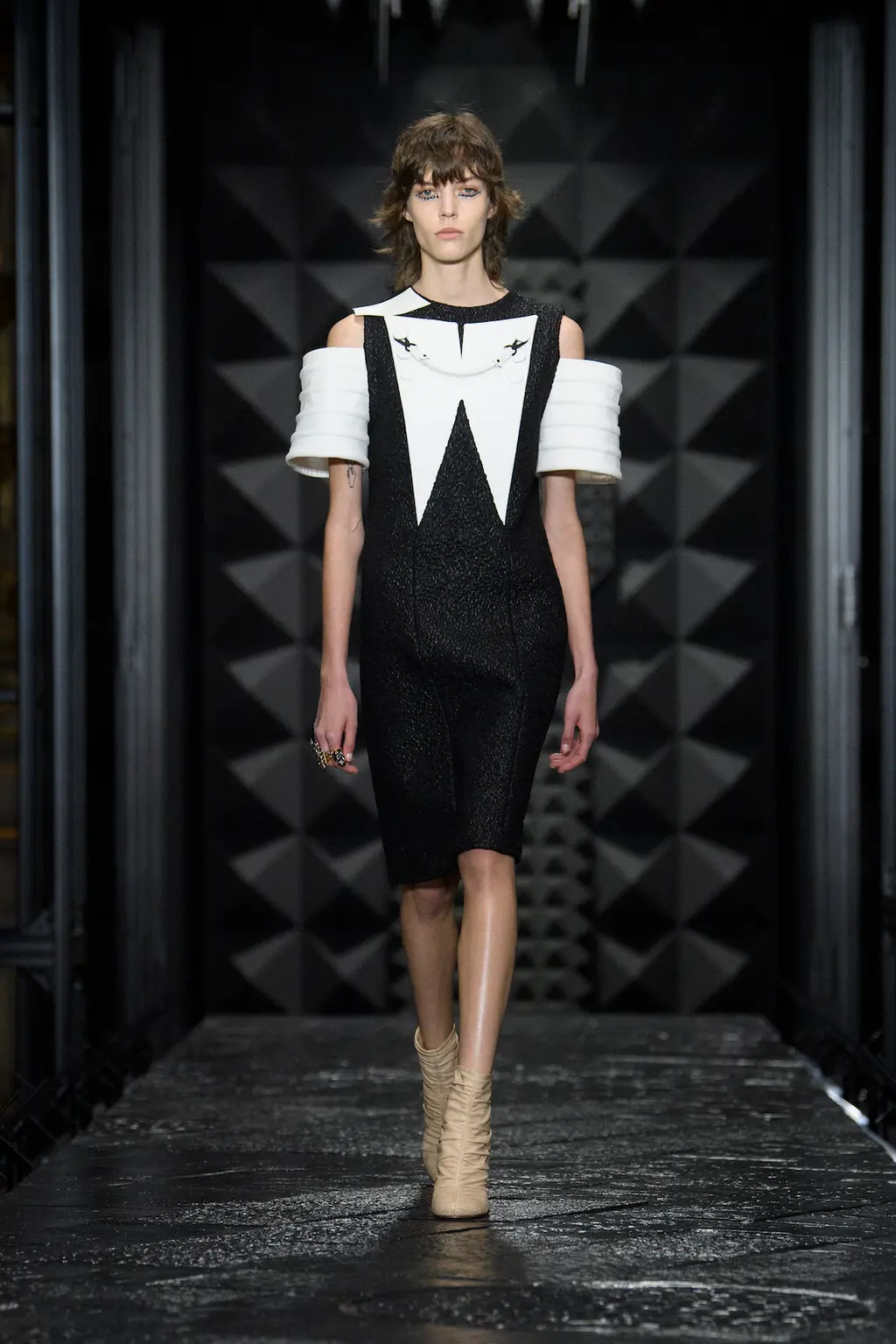 We noticed shapes, and lots of ‘em: a semi-circle bib, bulbous sleeves, sharp triangular lapels and a razor-sharp hem on a dress that was piped to stick out like a box. It felt wonderfully odd and typical of creative director Nicolas Ghesquière, all angular, A‑line and off-beat. But really, the creative director was questioning the enigmatic quality of French style that you can’t quite put your finger on – you know, je ne sais quoi.