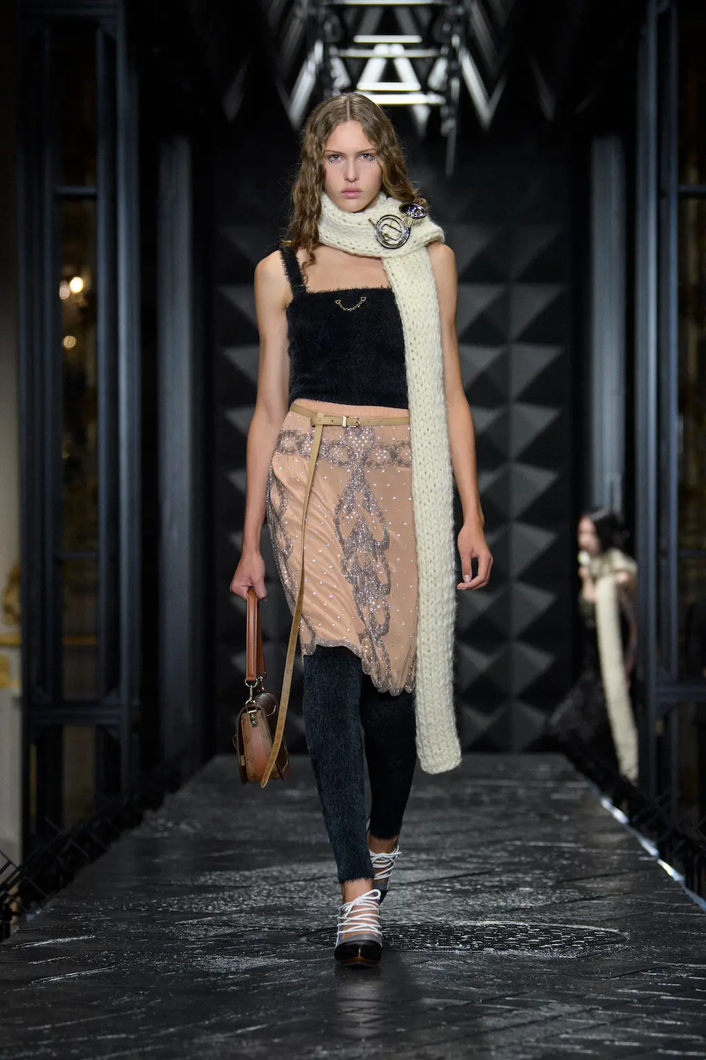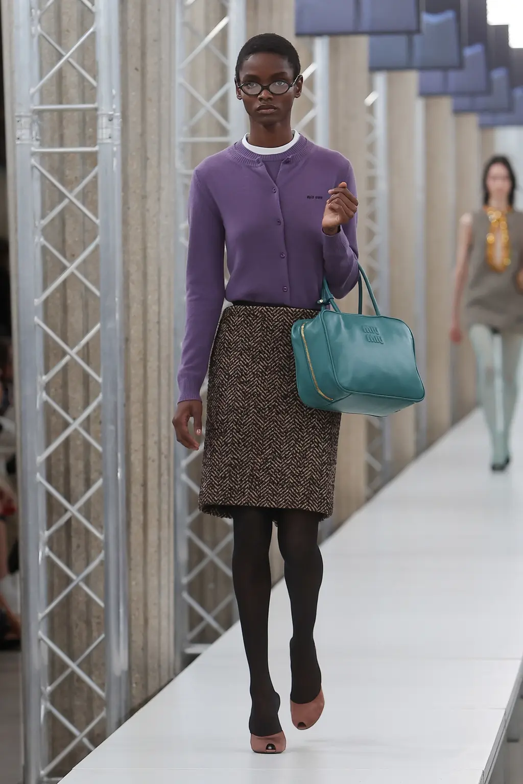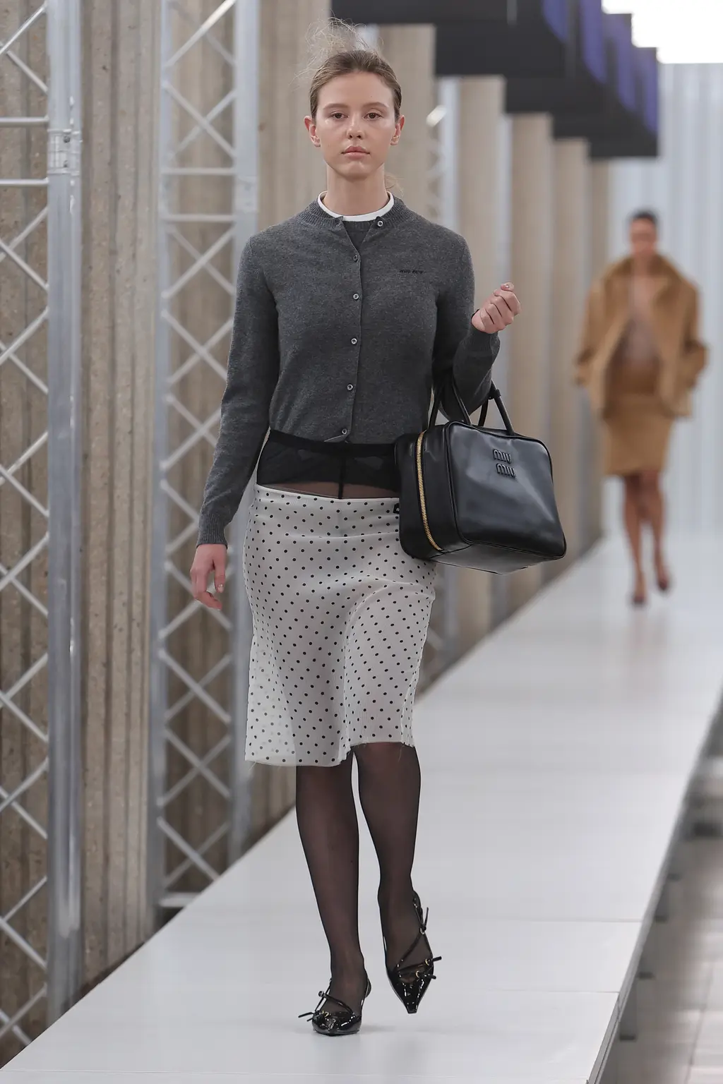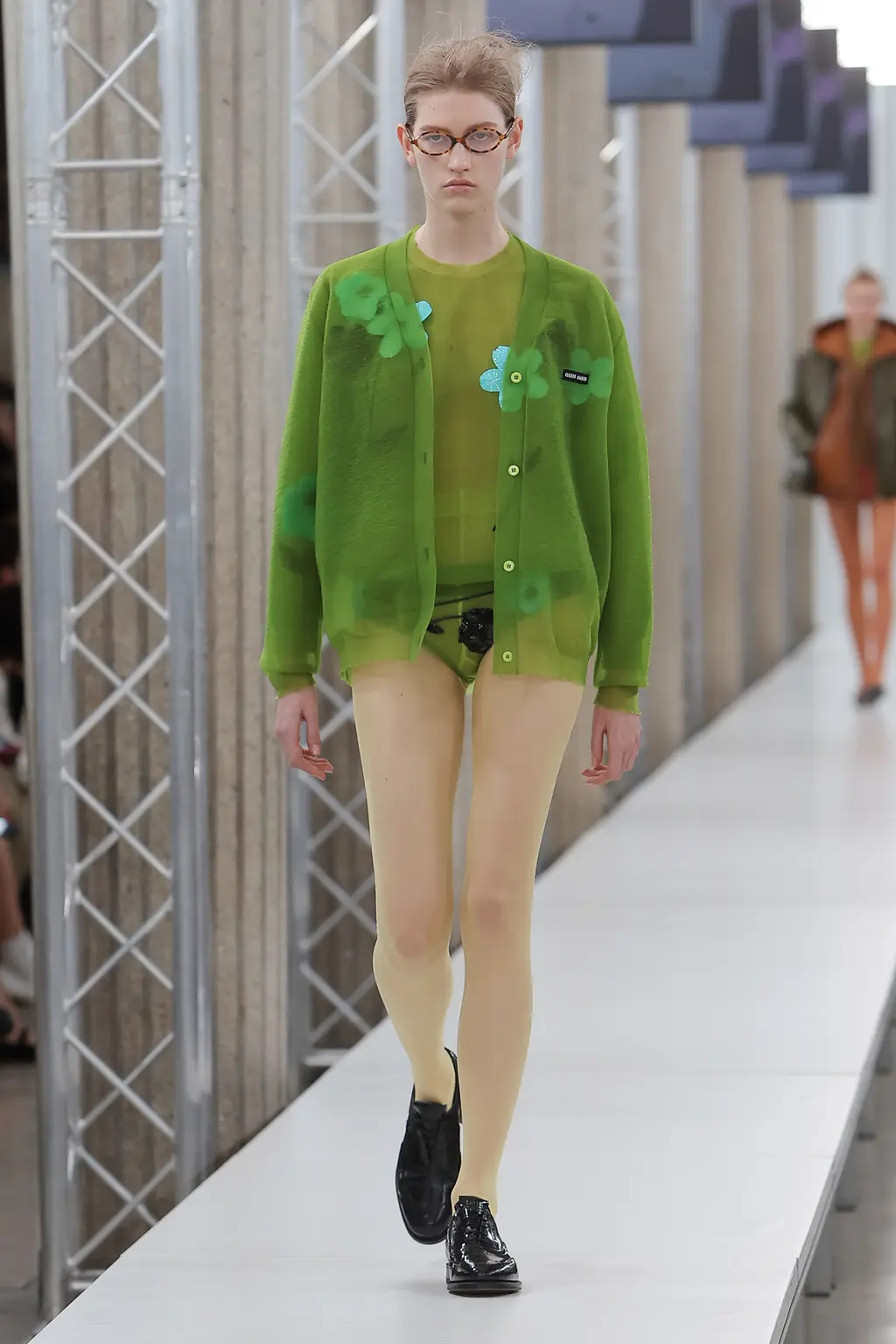 This was a Miu Miu collection for the die-hard fans: a little bit granny, sometimes romantic, subtly sexy and very, very cool. There was a hurriedness to the first few looks, with Mia Goth’s hair poking out as though she’d stumbled into the office after a long night out, tights tucked into her cardigan (see: frazzled British woman). Then, perhaps as a nod to the quintessential FBW Bridget Jones, there was a sheer nude top just like the one the Londoner wore to the office in the 2001 film.