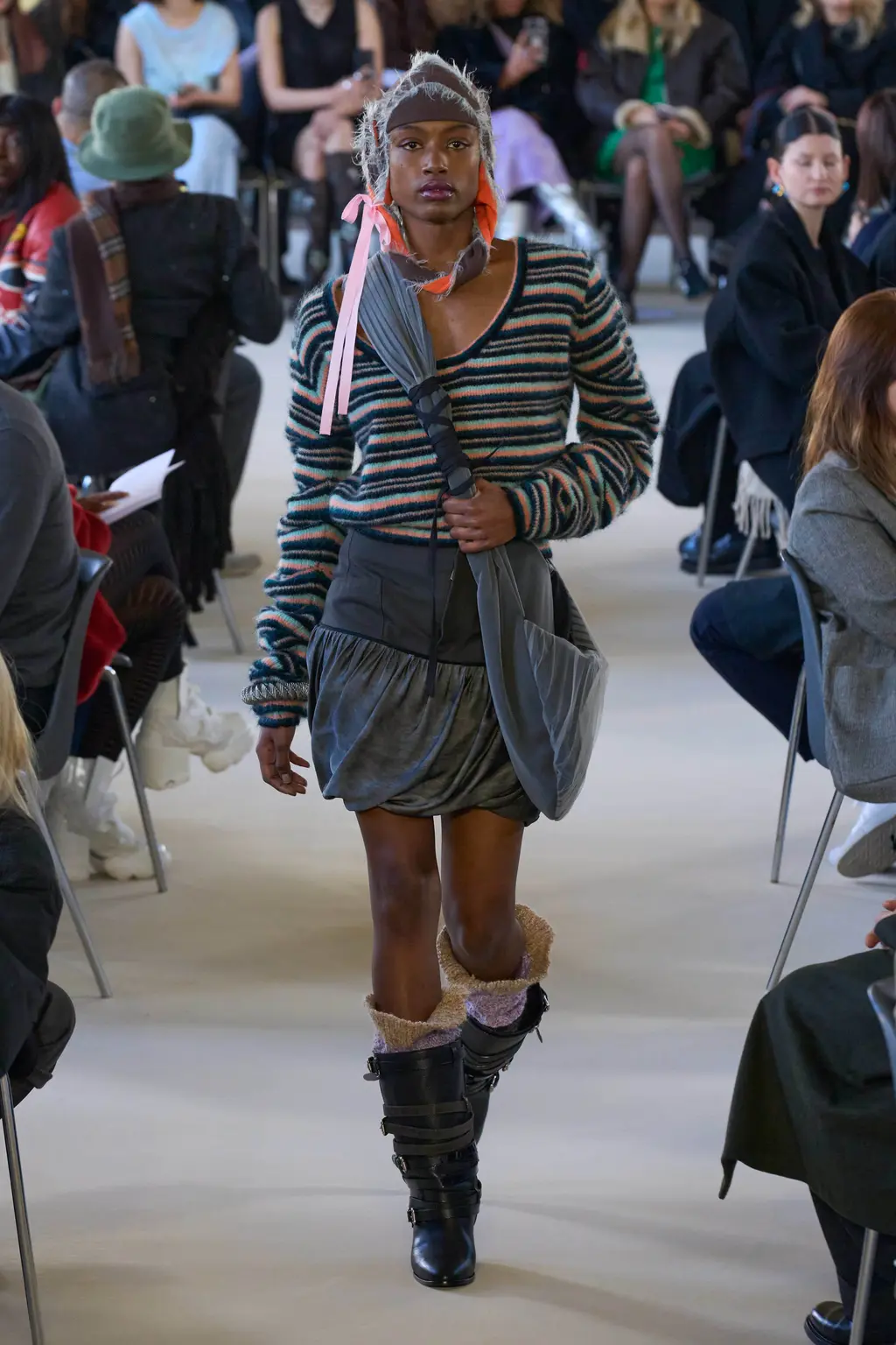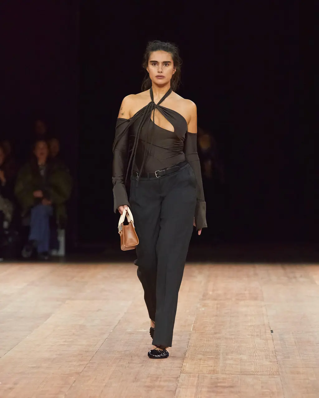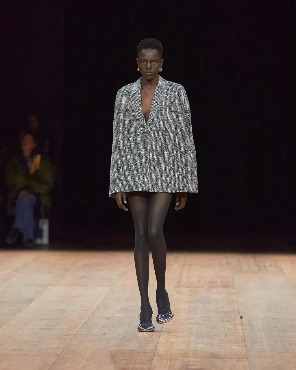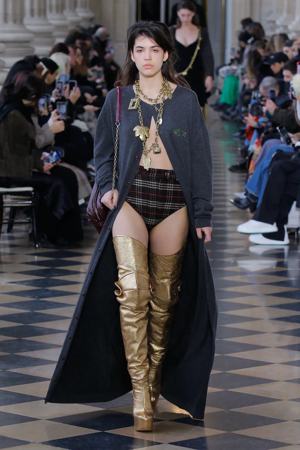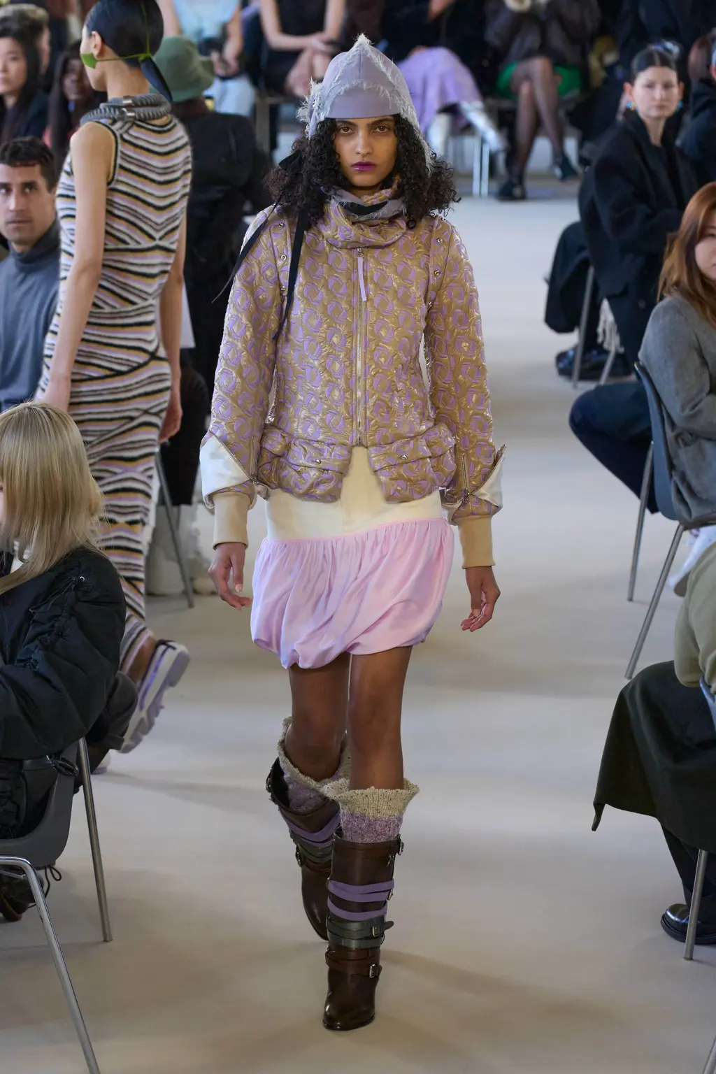 This was a Miu Miu collection for the die-hard fans: a little bit granny, sometimes romantic, subtly sexy and very, very cool. There was a hurriedness to the first few looks, with Mia Goth’s hair poking out as though she’d stumbled into the office after a long night out, tights tucked into her cardigan (see: frazzled British woman). Then, perhaps as a nod to the quintessential FBW Bridget Jones, there was a sheer nude top just like the one the Londoner wore to the office in the 2001 film.