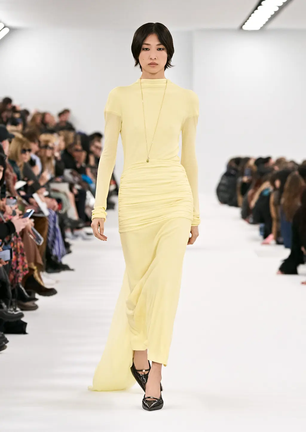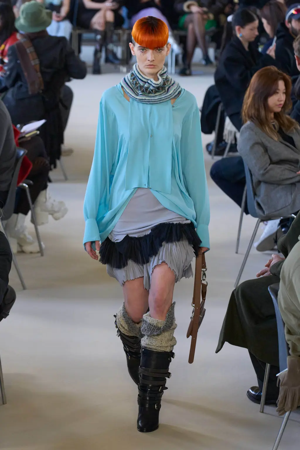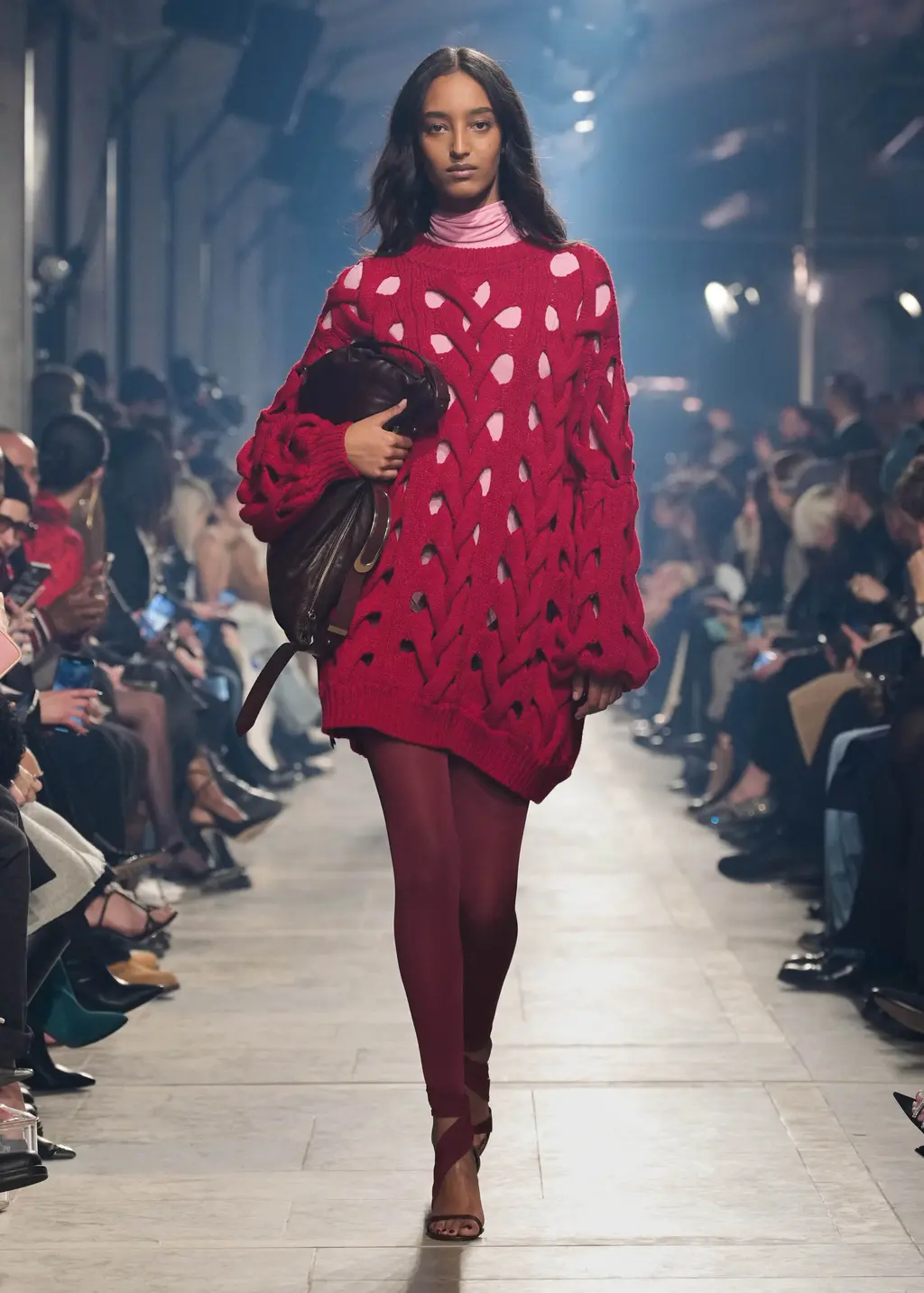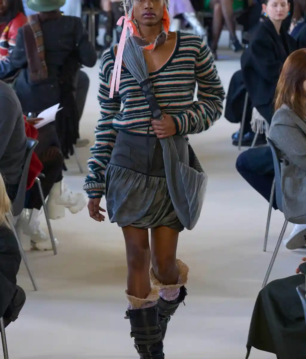 This was a Miu Miu collection for the die-hard fans: a little bit granny, sometimes romantic, subtly sexy and very, very cool. There was a hurriedness to the first few looks, with Mia Goth’s hair poking out as though she’d stumbled into the office after a long night out, tights tucked into her cardigan (see: frazzled British woman). Then, perhaps as a nod to the quintessential FBW Bridget Jones, there was a sheer nude top just like the one the Londoner wore to the office in the 2001 film.