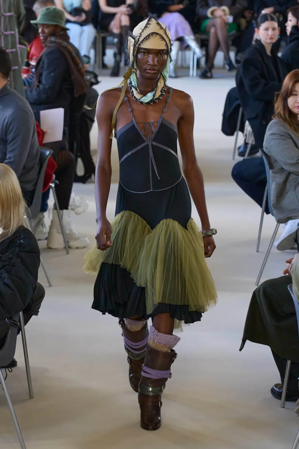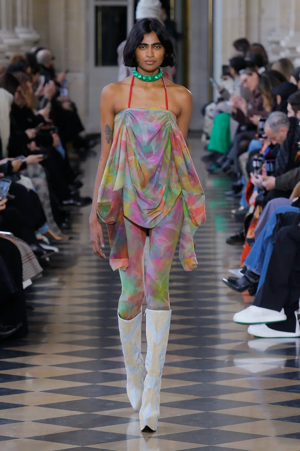 Staged in a gymnasium in Paris, twin-sister duo Laura and Deanna Fanning’s AW23 @kikokostadinov collection was playful and pretty with a tomboyish edge, packed with zippered jackets, layered pants and a series of tulle adorned, ballet-esque dresses in sherbet hues. They also debuted a new multi strap boot silhouette, the Leila, which is sure to be a mega hit. Brooke McCord
