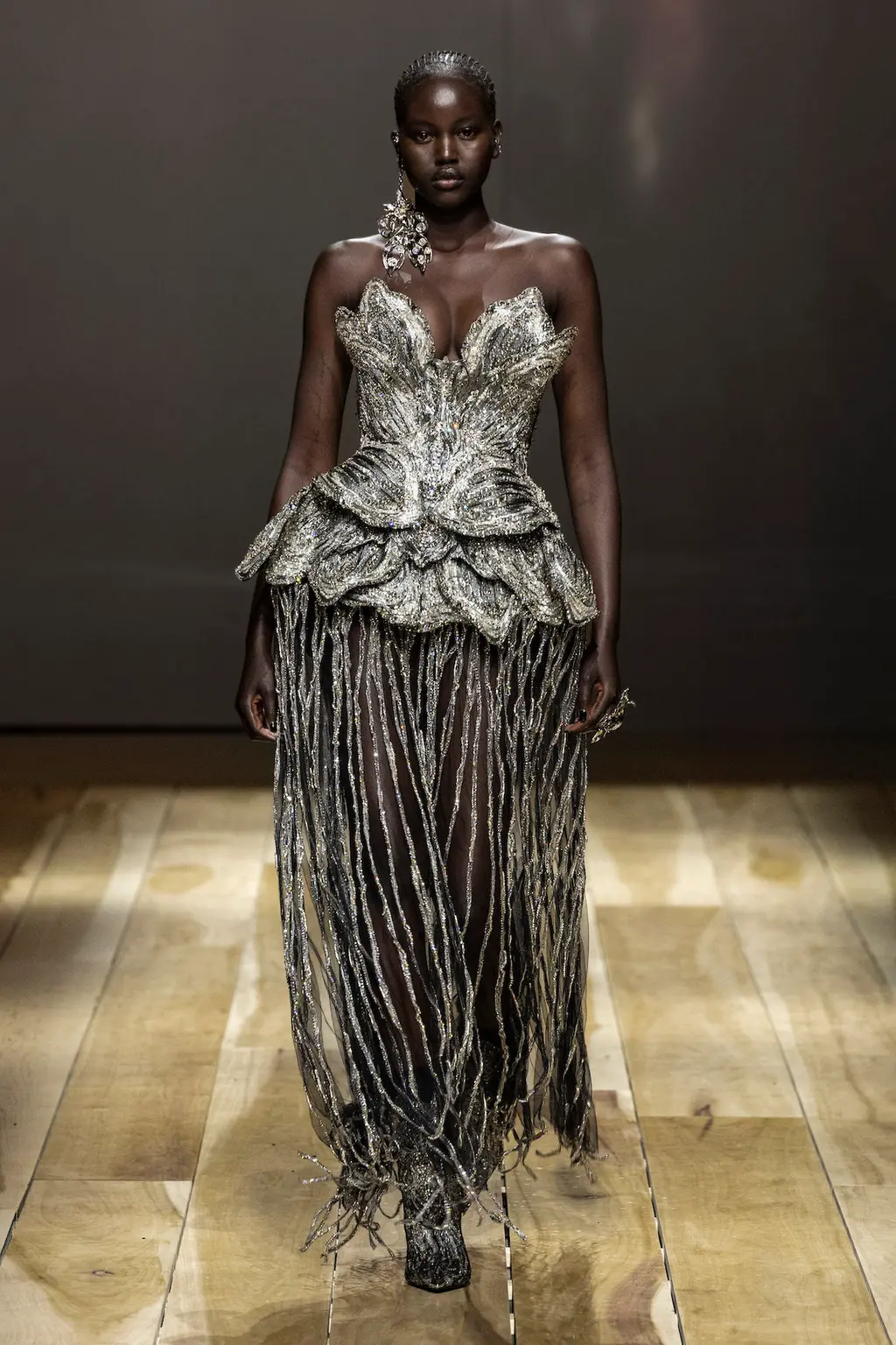 McQueen’s creative director, Sarah Burton, has long been fixated on nature, whether it’s the romance of rolling hills in the country, or the drama and short life cycle of British blooms. This season, she looked at the anatomy of humans, using the orchid as a springboard.