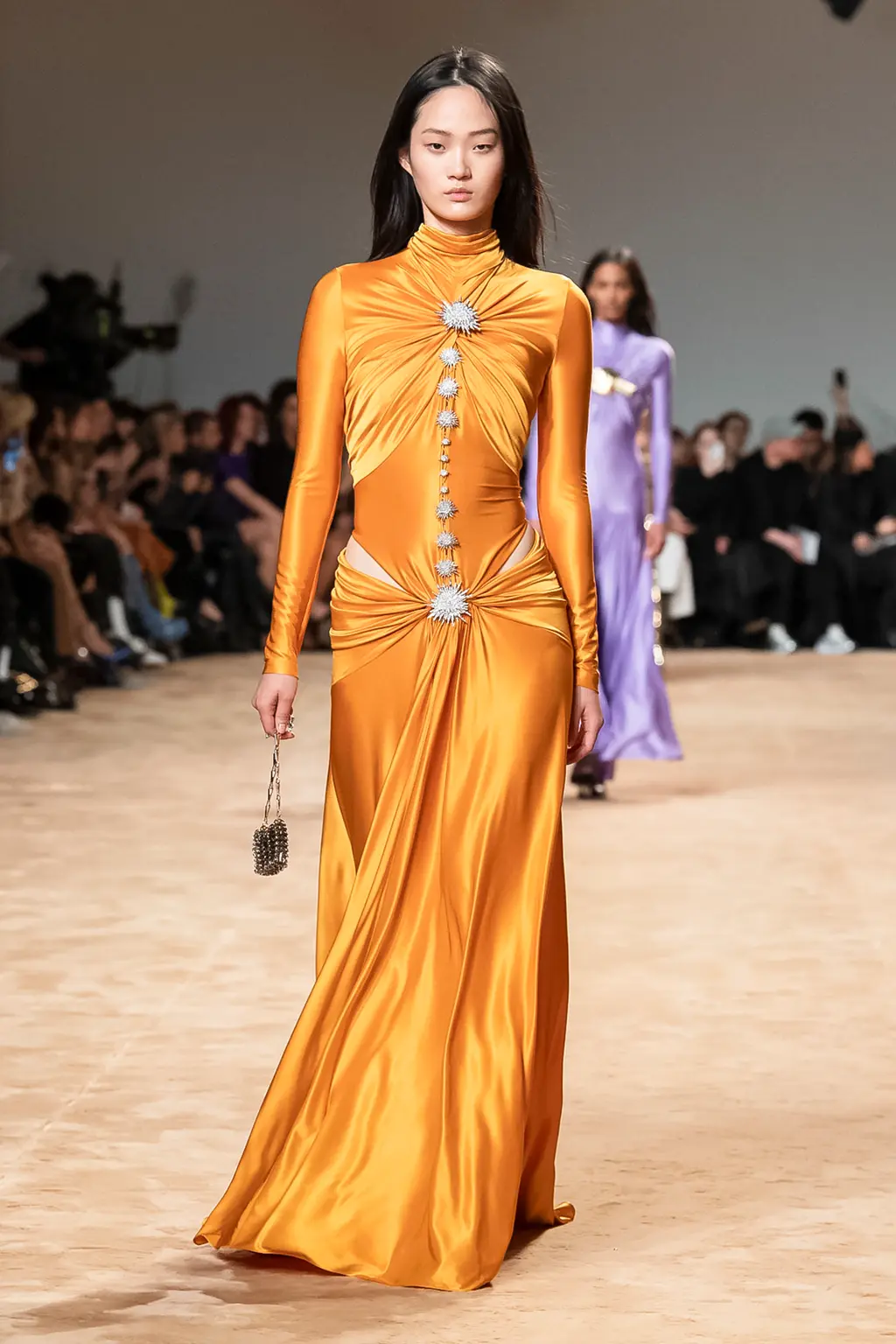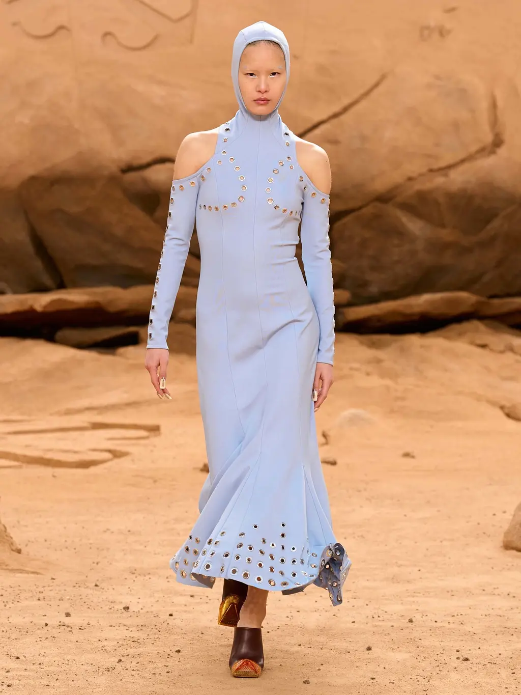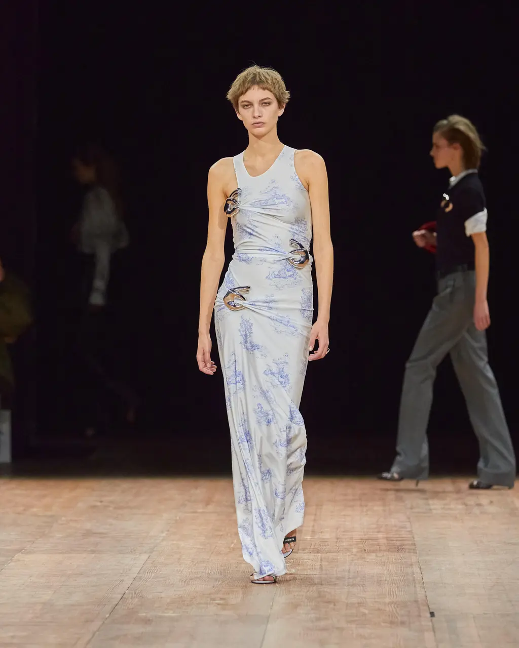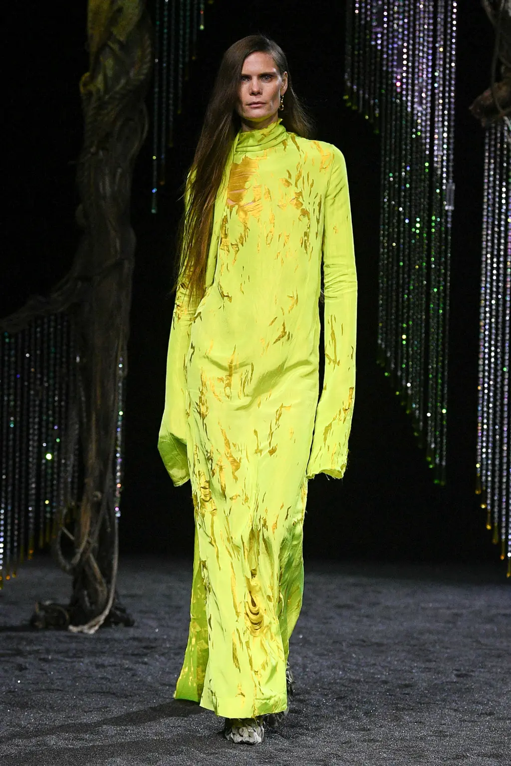 It felt very much like a tribute to the late designer by current artistic director Julien Dossena. The colours, the shapes, the proportions. How the clothes move as they’re worn, from the fur-imitating wool of the opening looks (Rabanne loved working with unusual materials and techniques), to the dresses printed with the works of Salvador Dalí, a friend and compatriot of the designer. Not to mention how they sound, rustling up the runway, whooshing and shimmering thanks to those great metallic decorations-cum-armour that the house is known for. The show finished with five archive pieces, set to audio snippets of Rabanne’s voice. Like the Jetsons reference we made in our Courrèges report below, they still look as futuristic as anything we have now.