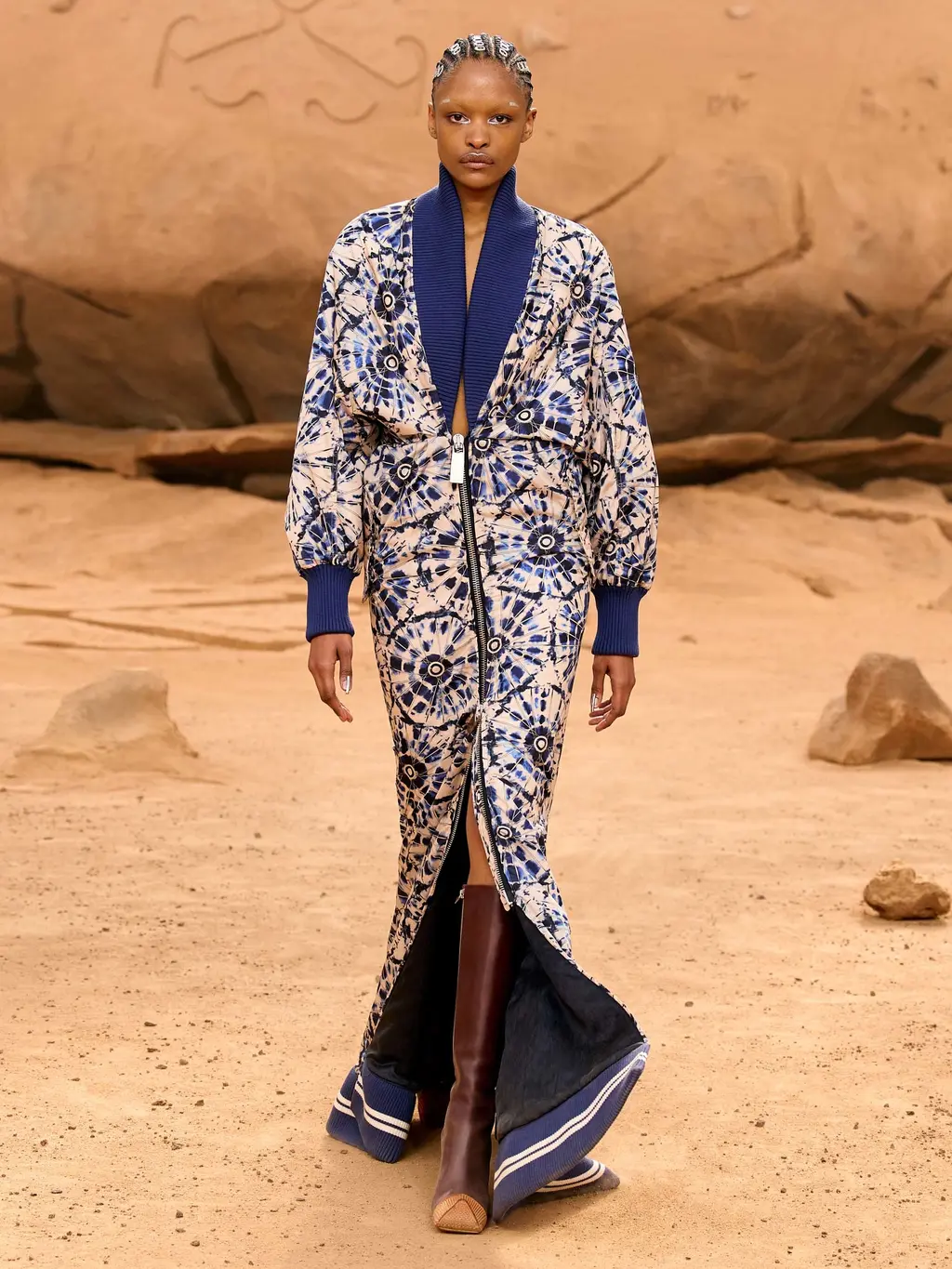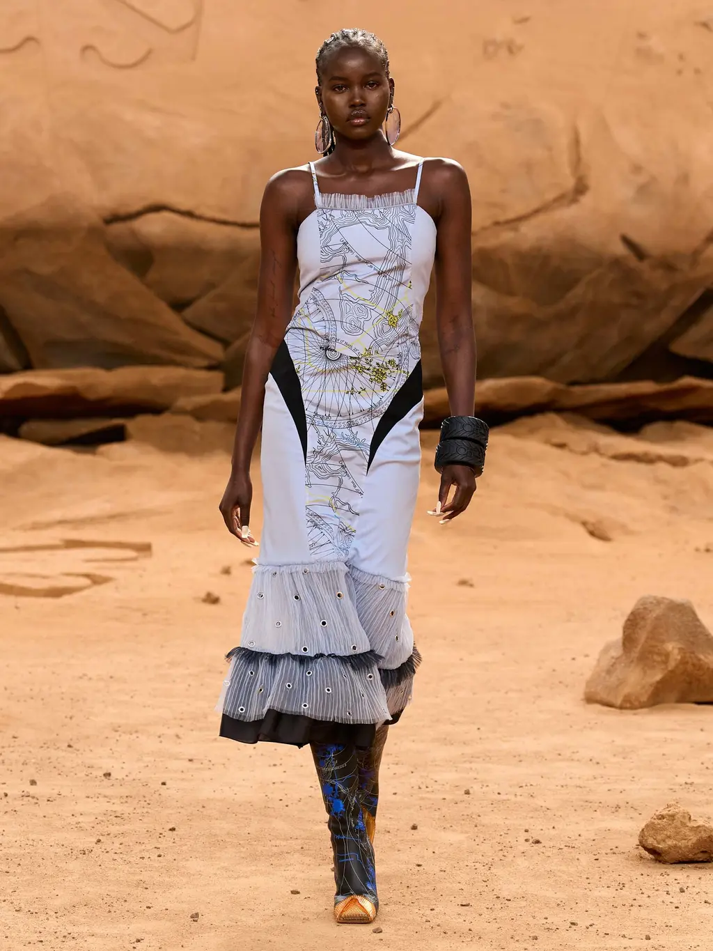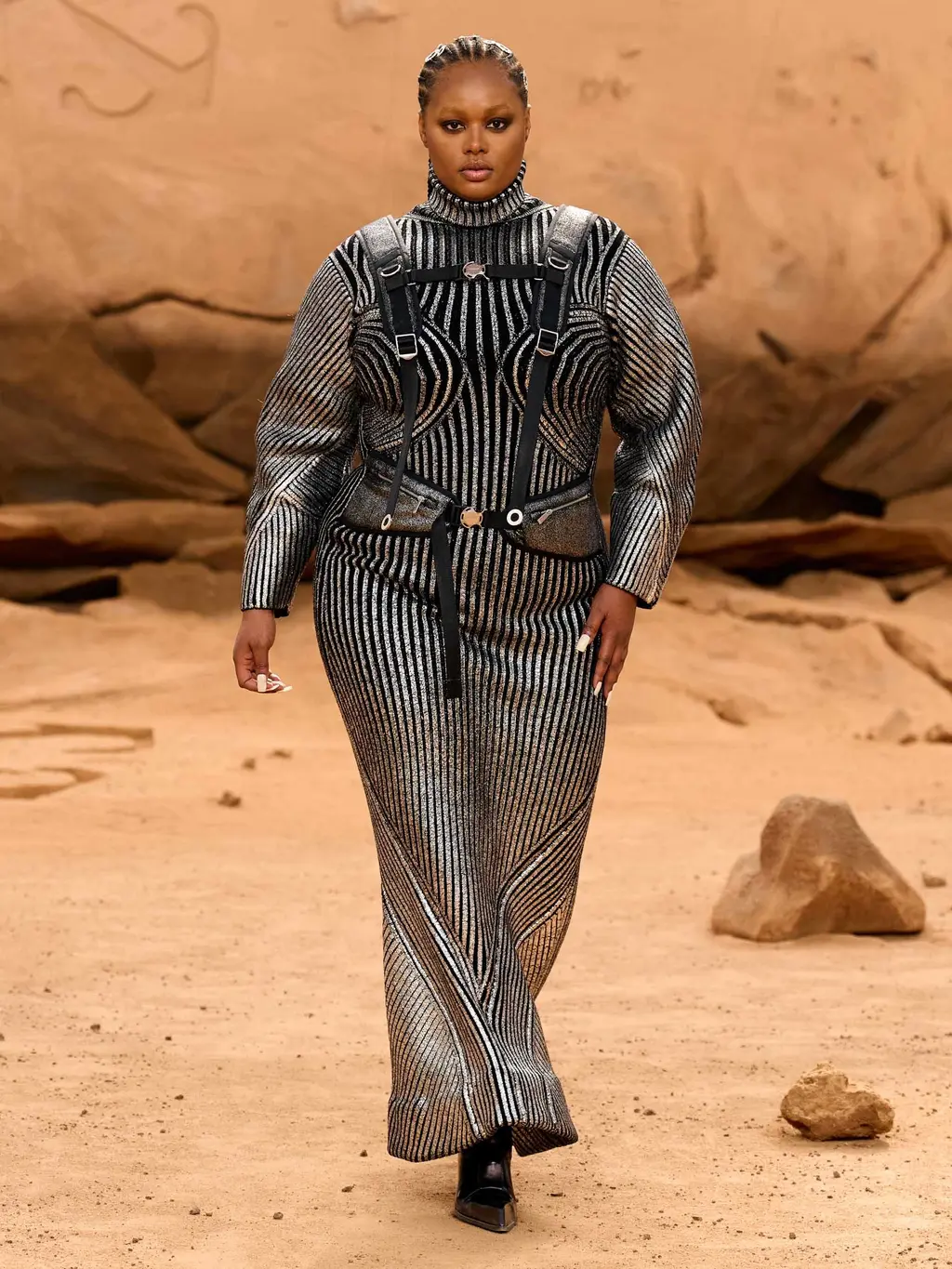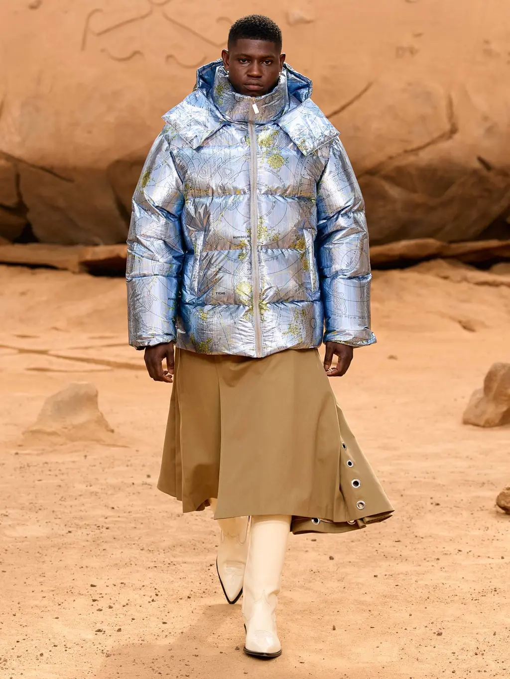 Well, the sci-fi feel continued there. Not in a naff, costume‑y way (you’ll be relieved to hear there were no Spock ears). But a way that tried to envision a new future now. Something that feels intrinsic to the path that Off-White charted under its late founder Virgil Abloh. These were clothes for a brave new world, led by stylist and Dazed editor Ib Kamara, who became Art & Image Director just under a year ago. And you felt his influence most keenly on some of the West African-inspired looks (Kamara was born in Sierra Leone), which felt like a fantastically fresh take on the sci-fi genre.
