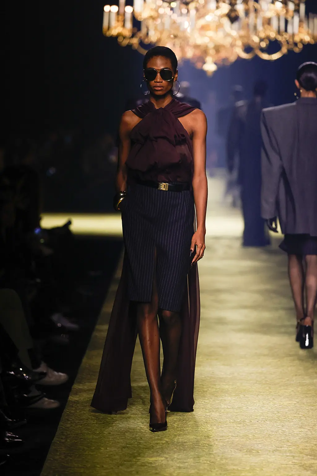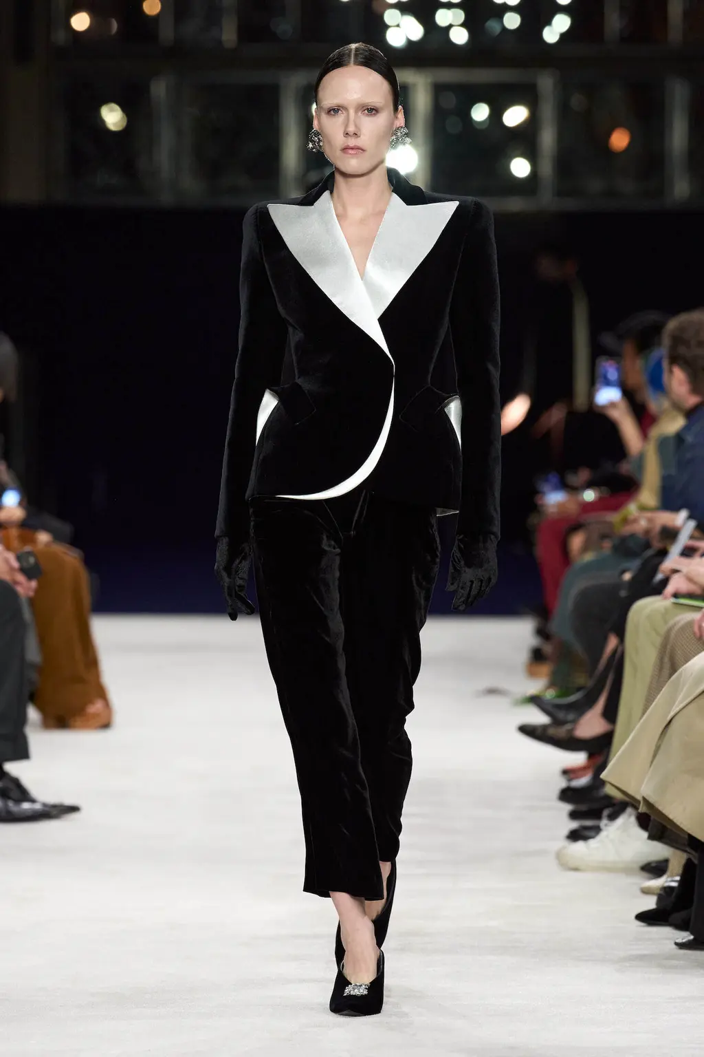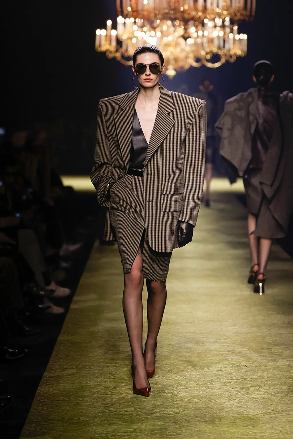 Beautiful, dramatic, exciting. All straight pencil skirts and sheer stockings, angular shoulders that could take your eye out. Even the pocket squares looked sharp. The bold new blazer shapes were what drew the eyes, but there were so many details to wax lyrical about: not least the long scarves that flowed gently behind the models, a soft counterpoint to the hard angles of the tailoring. A brief tartan interlude added a shock of colour. But it was all black everything till the end, met with a standing ovation in some parts of the room.
