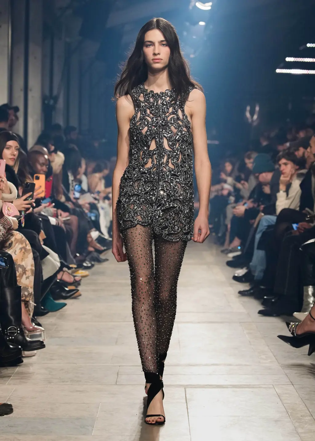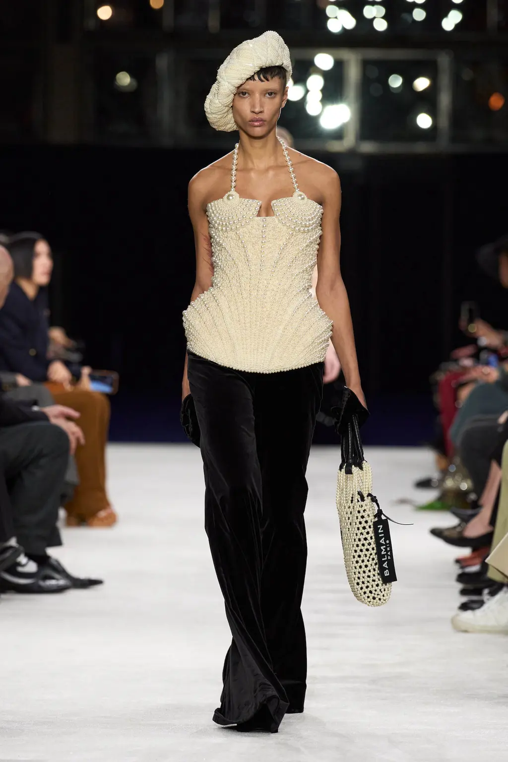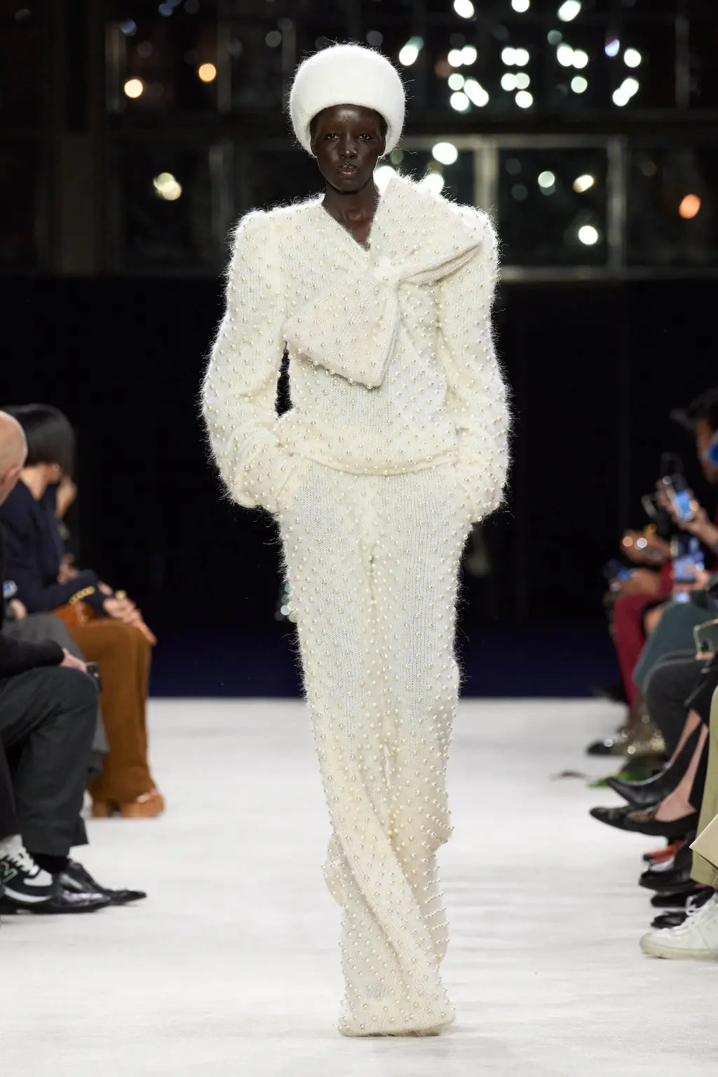 It did, actually. This collection was all about stripping Balmain back to the house’s most essential tailoring elements: the silhouette (think: cinched waists, strong shoulders and plenty of volume), the pattern (that maze-like symbol worn by many guests in attendance), and the finishing touches (not least, the pearls, bows and polka dots that adorned this collection’s looks). Of course it still felt luxurious and ornamented, but in a way that felt very true to the history of the brand, too.