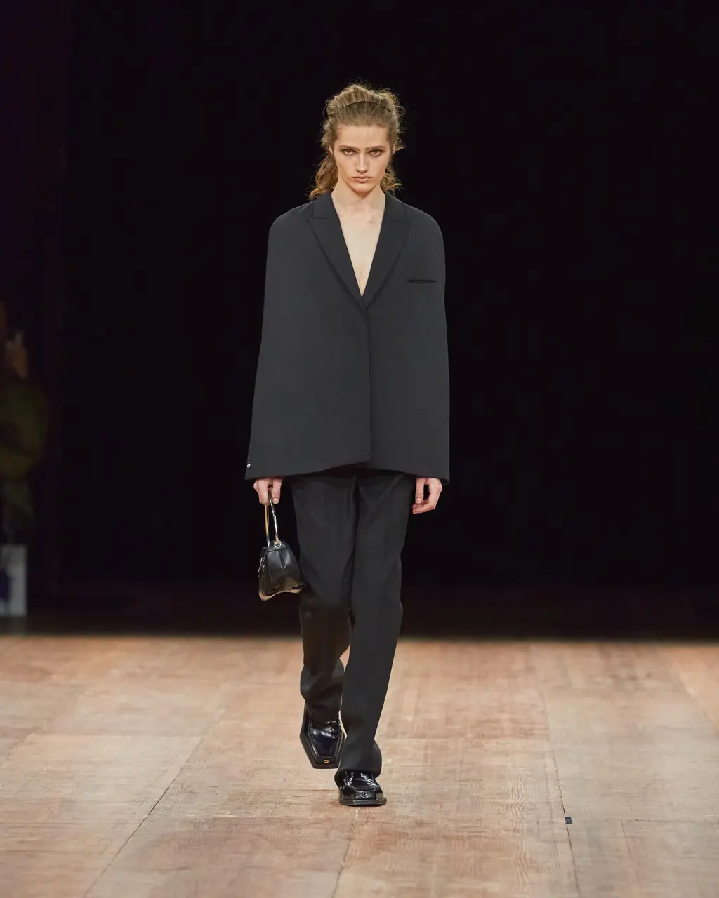 Every so often, the more salacious looks (deep V‑neck halter dresses, sheer, revealing knickers and sexy secretary specs) were spliced with some very sensible looks: a hoodie, leggings, jackets and trainers that wouldn’t feel out of place on most British high streets. It felt like Mrs. Prada was observing everyday spaces, such as workplaces, libraries and schools, providing clothes that an average person can wear on an average day. If Mia Goth was stumbling into work a little hungover, by the time Emma Corrin closed the show in embroidered knickers and a high-neck jumper, they were ready to hit the town once again. All in a day’s work, eh?