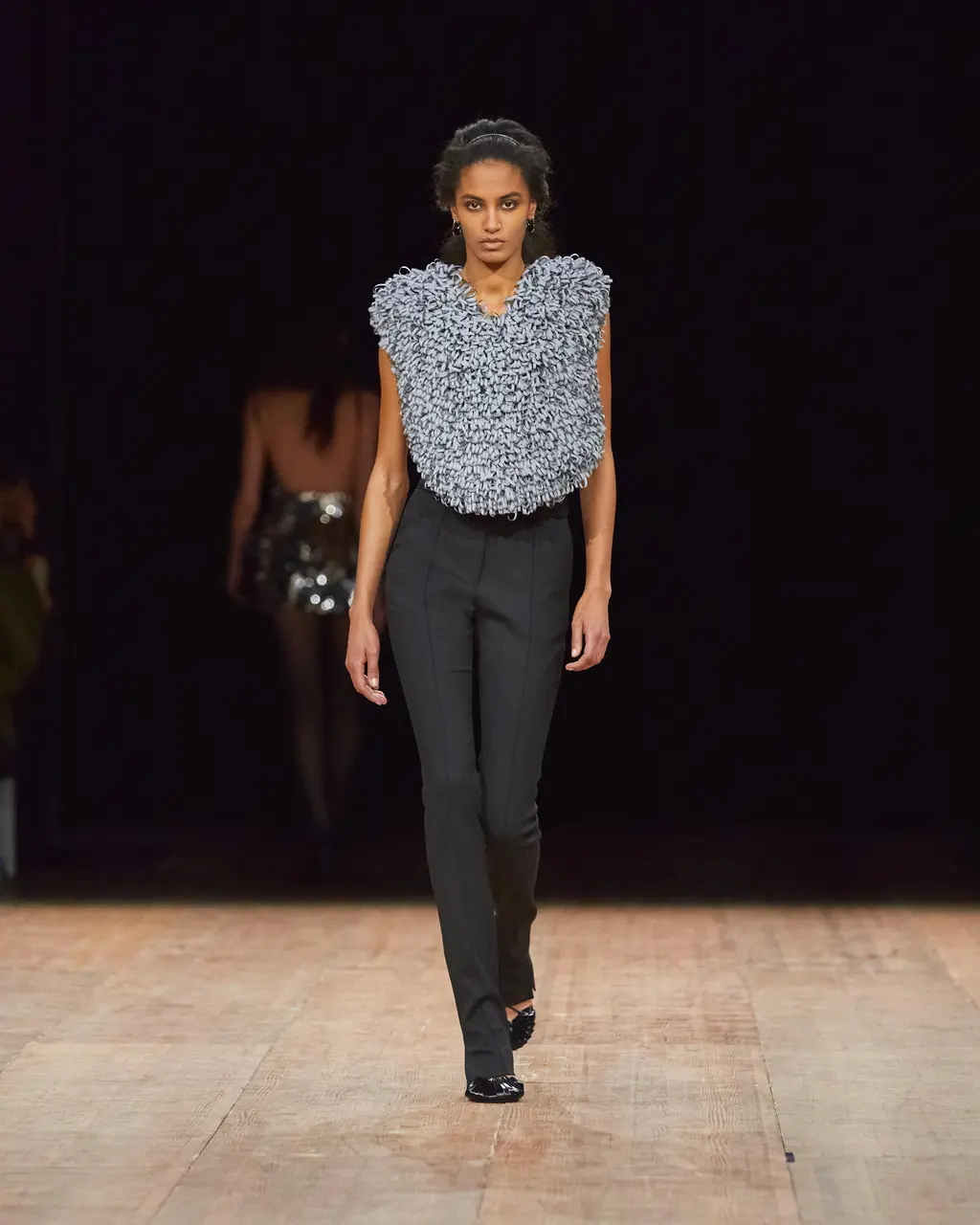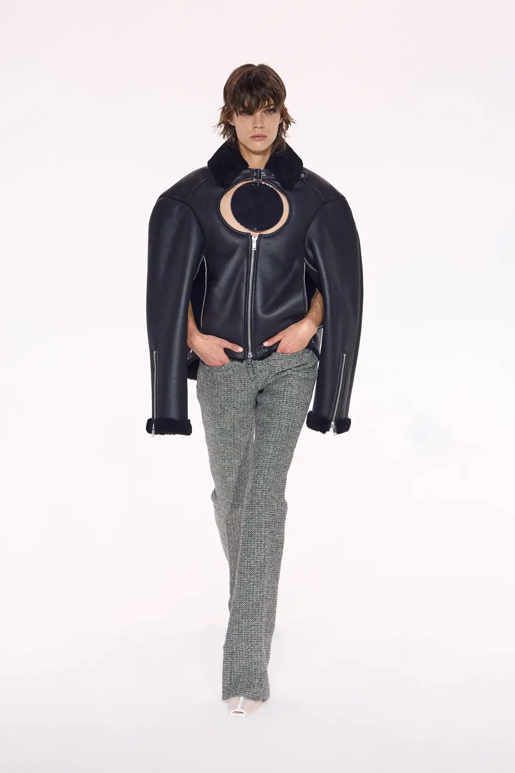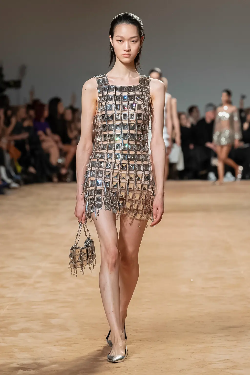 Mirrors! Smoke and mirrors. Even the invite was a circular-looking glass that you later saw hung from the ears, necks and chests of models, reflecting back the phone cameras of the audience. “Is the sky blue?” a voice inquired over the speaker, as the first models walked down the runway while texting, their faces illuminated by the glow of their phones. Don’t ask them. Courrèges was founded during the Space Race of the 1960s, that great 15-year stretch from which everything still looks more futuristic than the world we live in now (think: The Jetsons). This show felt like an invitation to look up once more. Not necessarily to the Moon, but at least up from your phone. “Do you see me?” the voice said again, as the room fell dark and a light was directed at the mirrors. “I see you.”