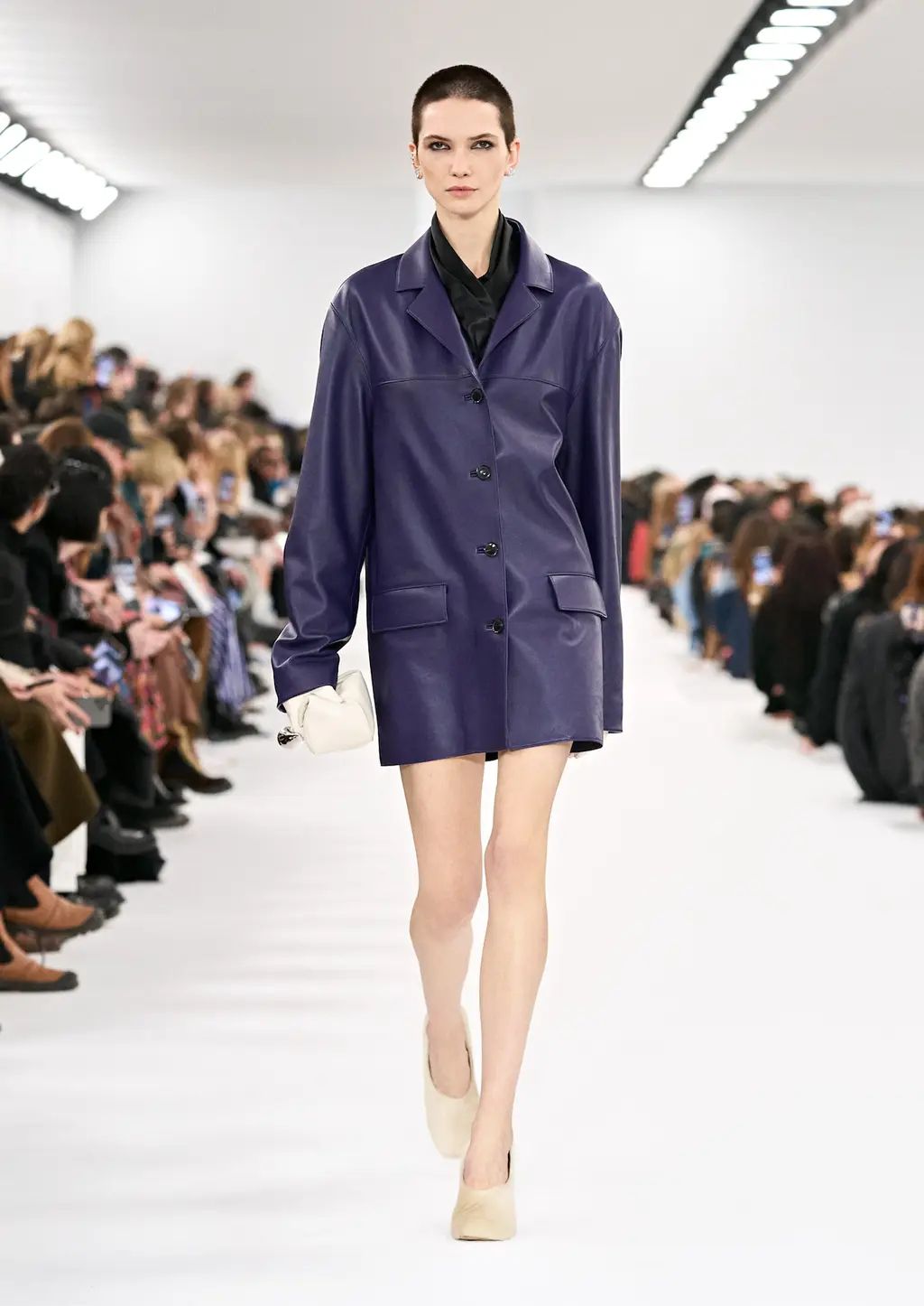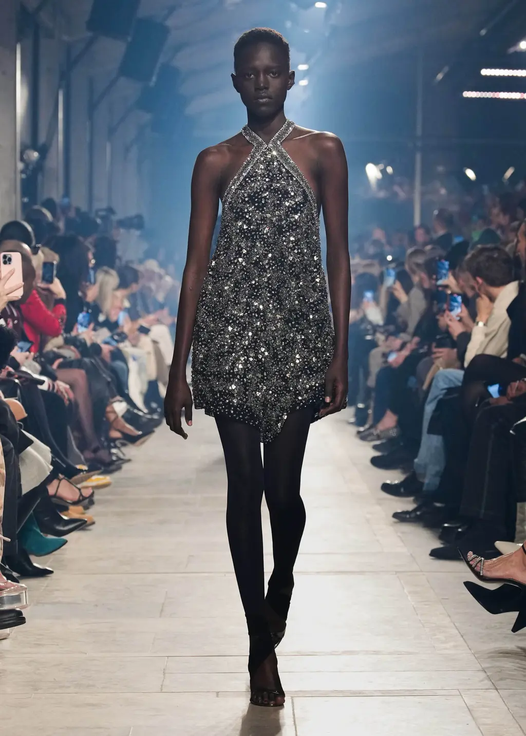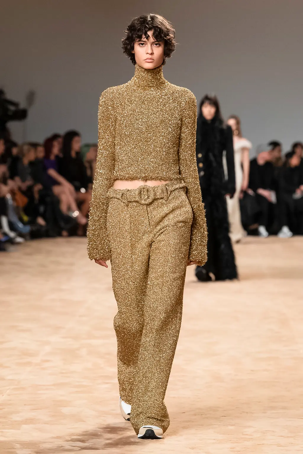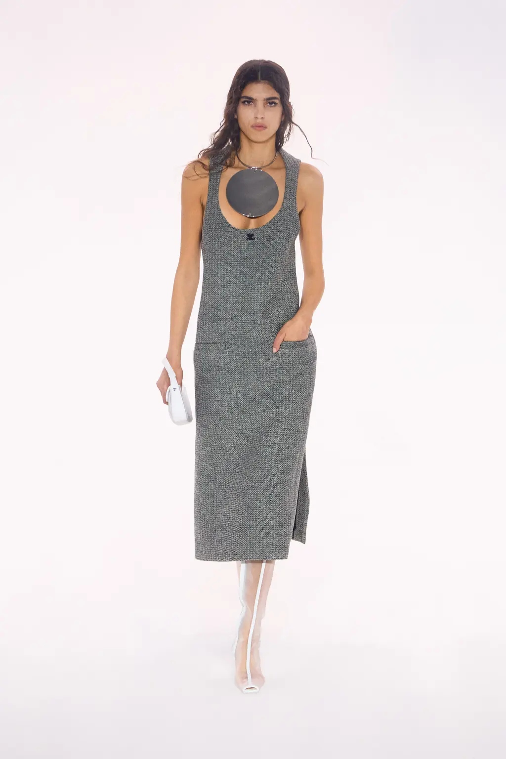 Mirrors! Smoke and mirrors. Even the invite was a circular-looking glass that you later saw hung from the ears, necks and chests of models, reflecting back the phone cameras of the audience. “Is the sky blue?” a voice inquired over the speaker, as the first models walked down the runway while texting, their faces illuminated by the glow of their phones. Don’t ask them. Courrèges was founded during the Space Race of the 1960s, that great 15-year stretch from which everything still looks more futuristic than the world we live in now (think: The Jetsons). This show felt like an invitation to look up once more. Not necessarily to the Moon, but at least up from your phone. “Do you see me?” the voice said again, as the room fell dark and a light was directed at the mirrors. “I see you.”