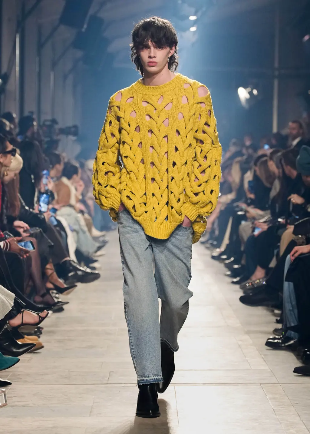 It certainly got us going. Set to a brilliant performance by DJ Gabber Eleganza and the band Lulu Van Trapp, there was chaos in great measure but a huge dollop of comfort, too. It’s something that feels intrinsic to Marant’s work: both able to make clothes to hibernate at home in, as well as dance all night at a club. No wonder she always attracts such great models: her pieces are sexy and desirable with great cut-outs (a recurring theme this season), colour-palettes (we liked the yellow), and fantastically heavy knits (who knew wool could be so hot?).
