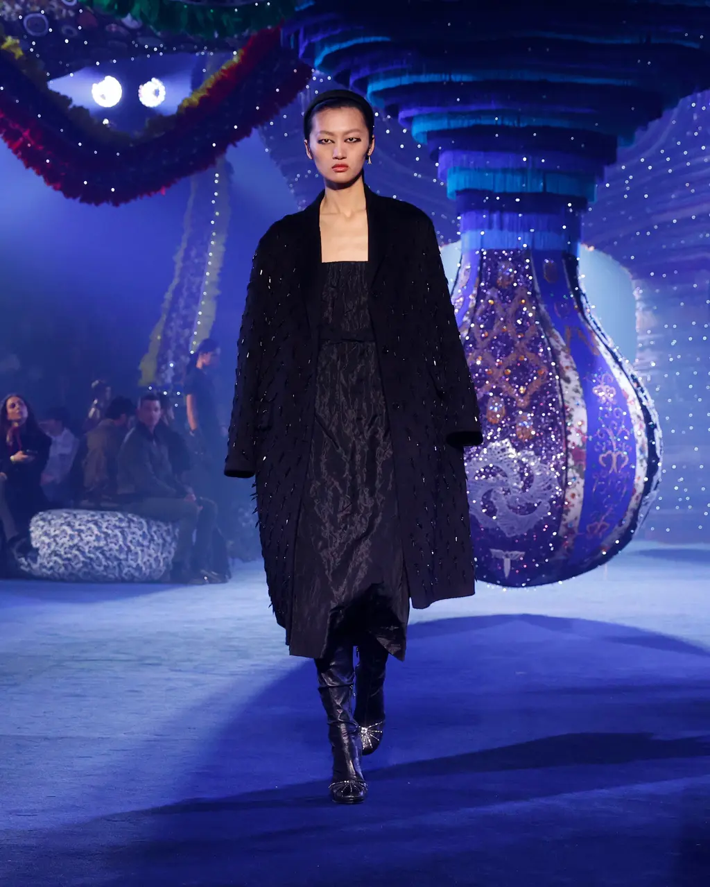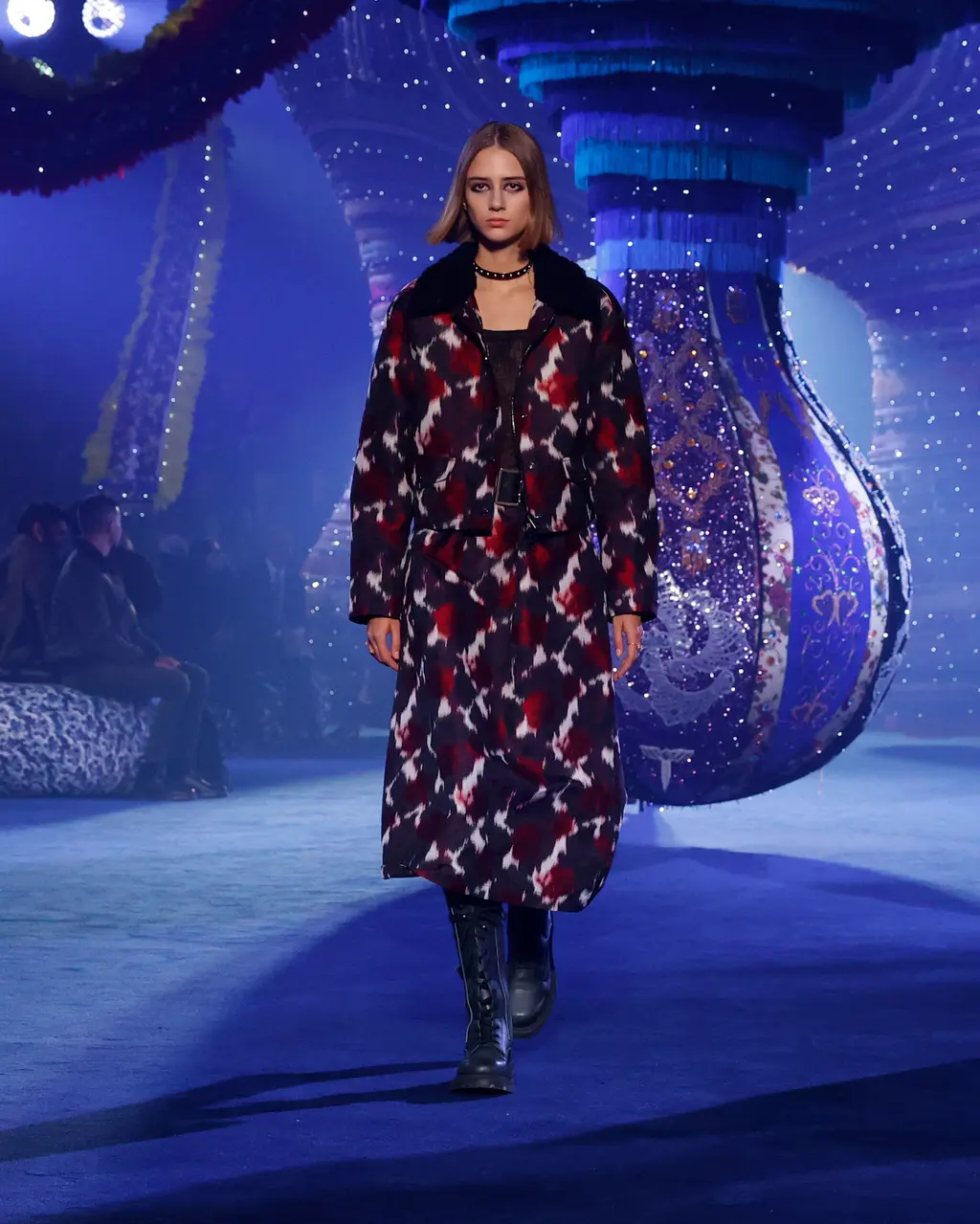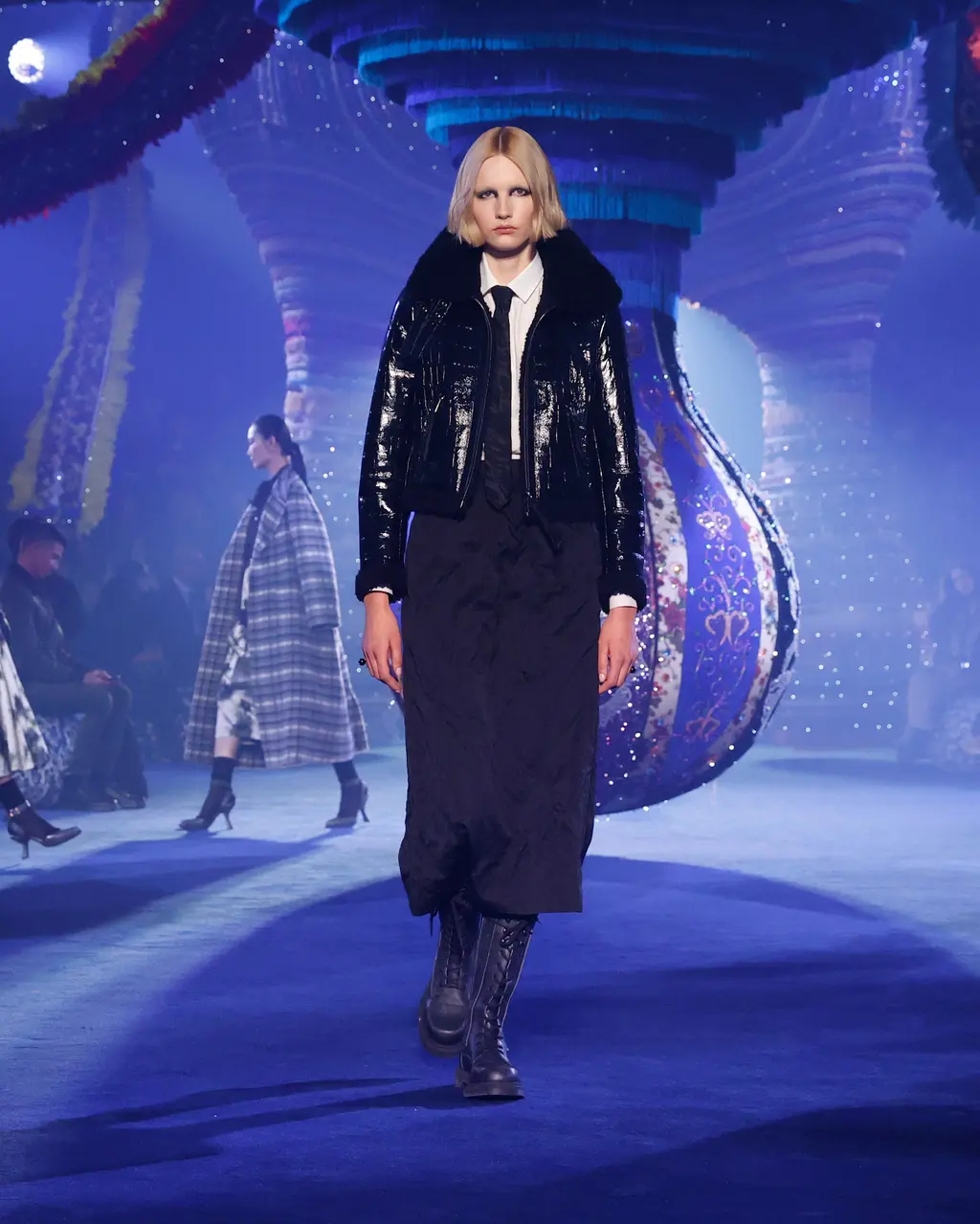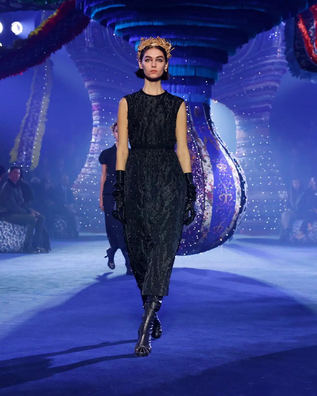 It felt pleasingly ’50s. But modern, too, presented under a set of what looked like kaleidoscopic rock formations by Portuguese artist Joana Vasconcelos. According to the show notes, Creative Director Maria Grazia Chiuri, who has often paid tribute to women in her work, wanted to “delve deeper into French style around three extraordinary personalities: Édith Piaf, Juliette Gréco, and Catherine Dior” (Christian’s sister, who was part of the French Resistance). And that she did, creating a collection that felt classically Dior (the florals; the shapes) but also bracingly modern (the lightness; the metallic thread which gave the fabrics a sort of crumpled look). Just like the women who inspired it.