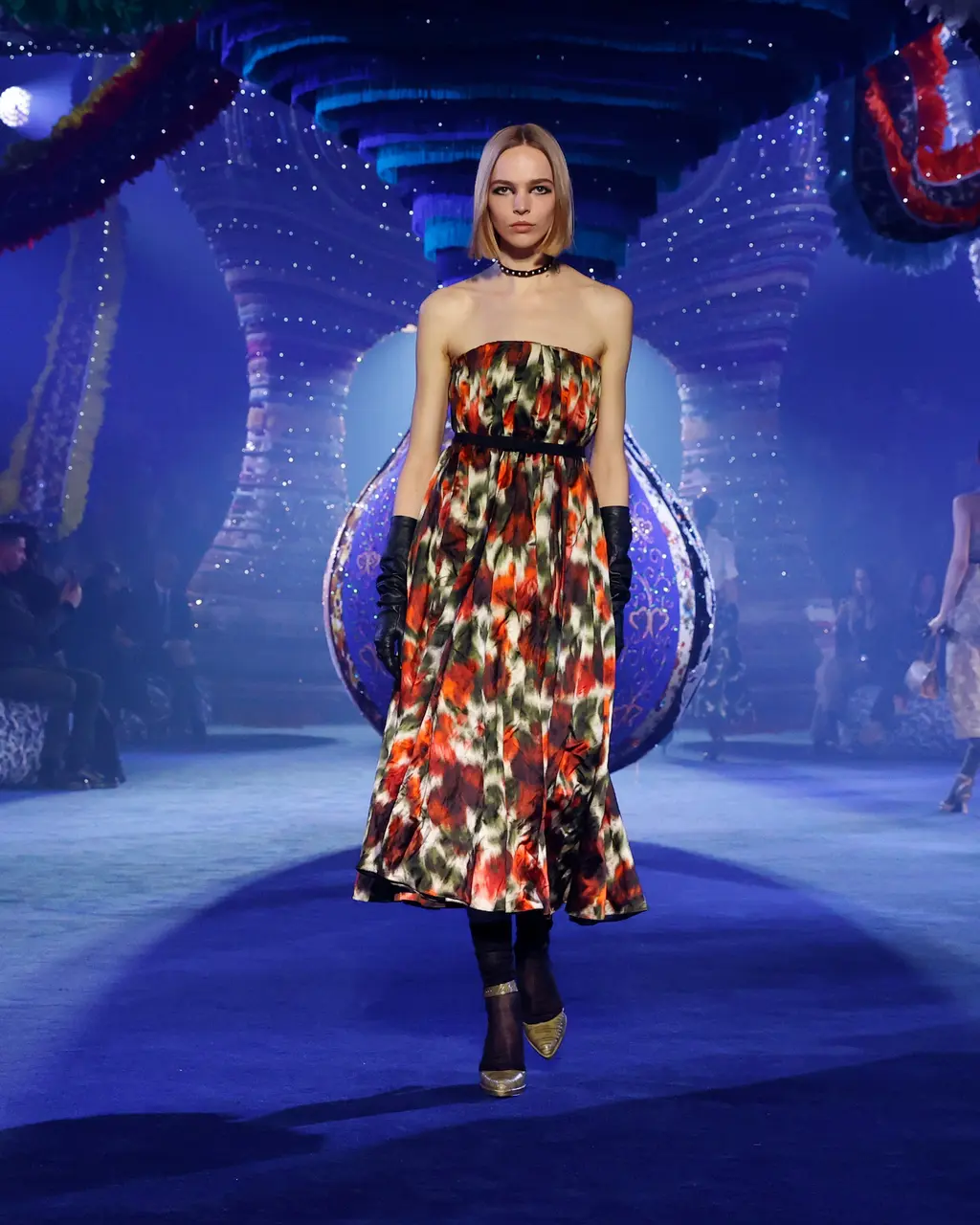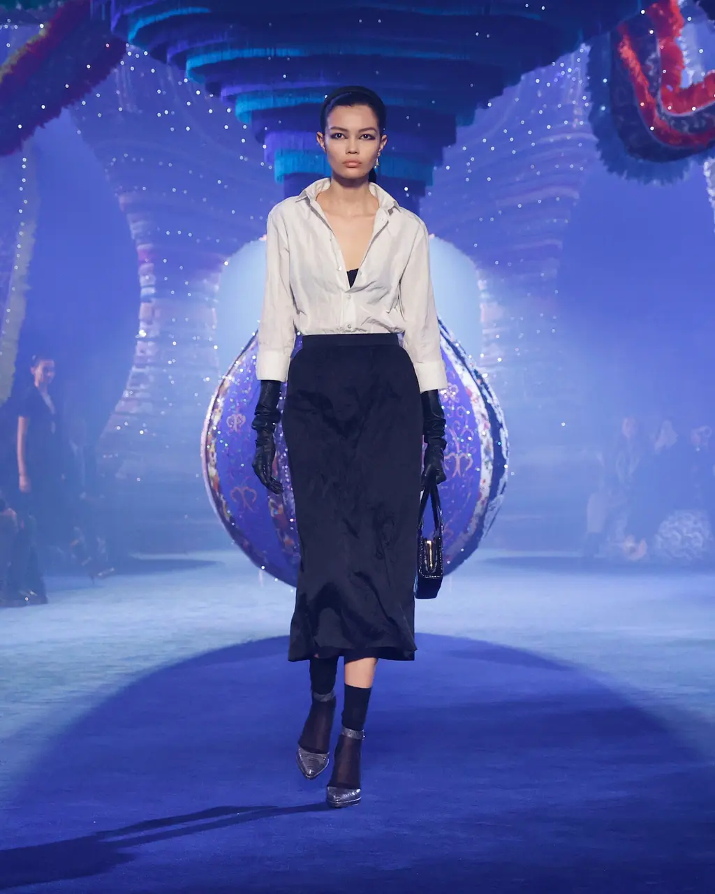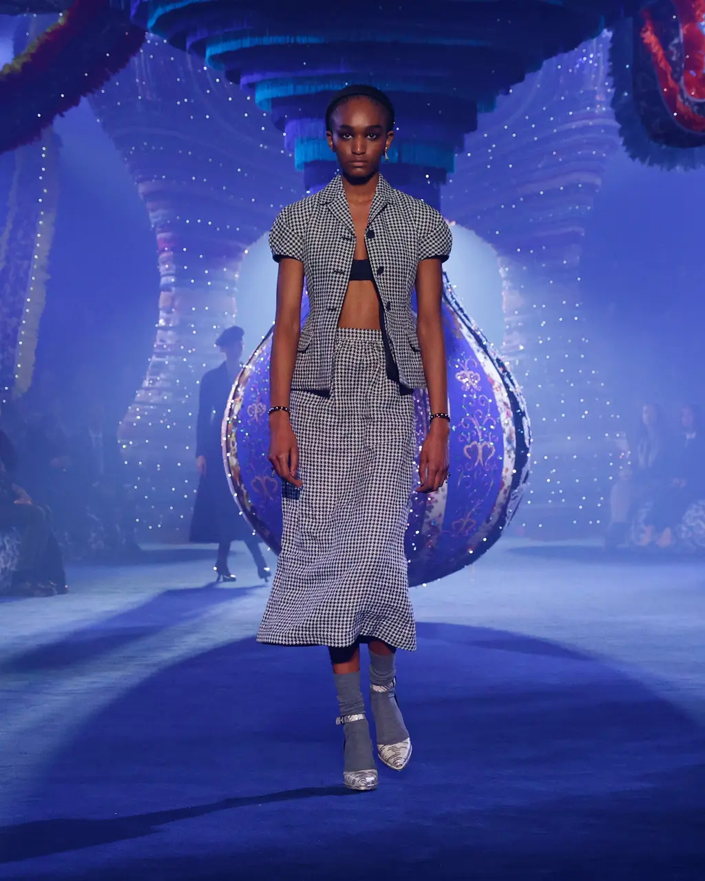 It felt pleasingly ’50s. But modern, too, presented under a set of what looked like kaleidoscopic rock formations by Portuguese artist Joana Vasconcelos. According to the show notes, Creative Director Maria Grazia Chiuri, who has often paid tribute to women in her work, wanted to “delve deeper into French style around three extraordinary personalities: Édith Piaf, Juliette Gréco, and Catherine Dior” (Christian’s sister, who was part of the French Resistance). And that she did, creating a collection that felt classically Dior (the florals; the shapes) but also bracingly modern (the lightness; the metallic thread which gave the fabrics a sort of crumpled look). Just like the women who inspired it.