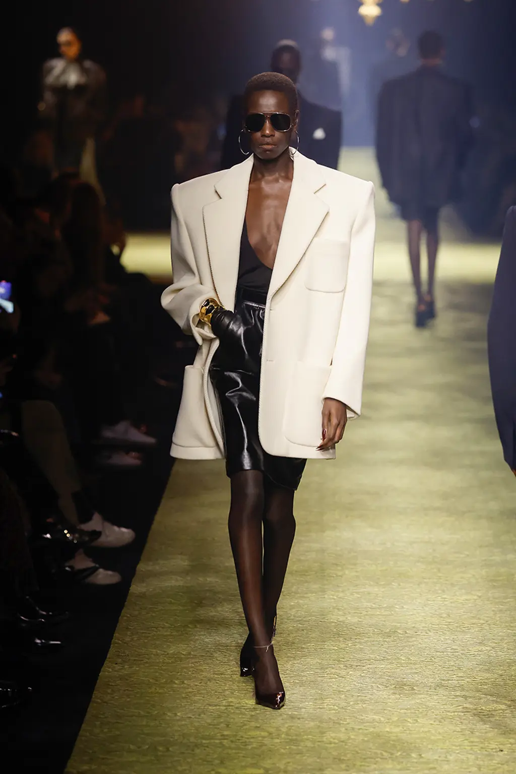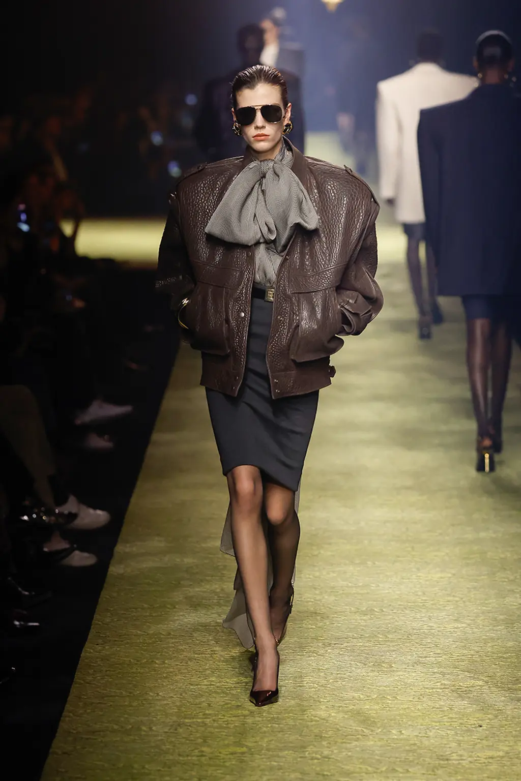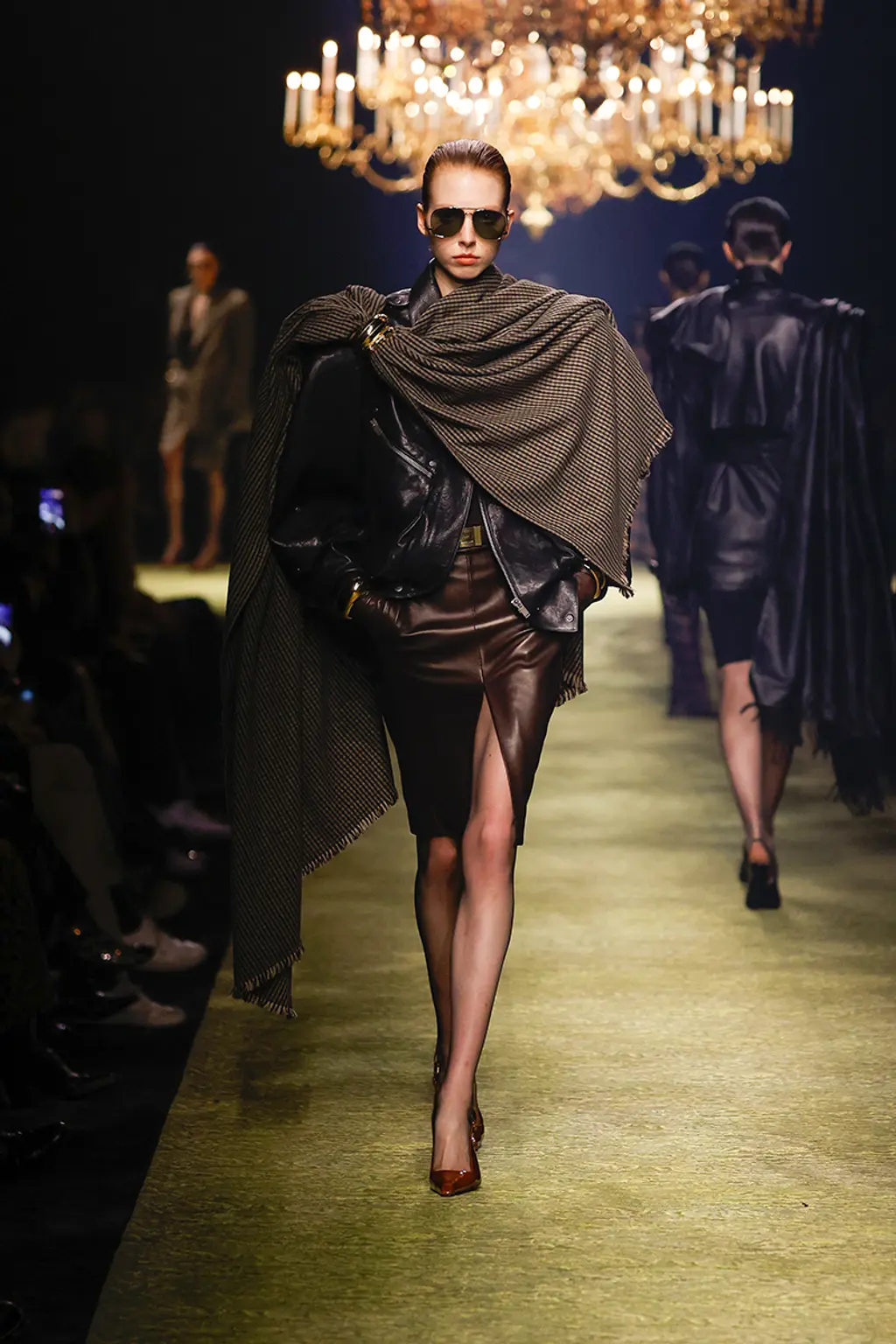 How do you embody this elusive style? You can couture techniques on ready-to-wear, for one, which was seen on highly-structured dresses that seemed to retain movement, the painstaking embroidery on a knee-length skirt and a ruched camisole, which featured countless hand-sewn diamantés. And then there was its sheer sophistication, with tailoring done to exemplary effect: a furry brown blazer shimmered in the light, a chequered two-piece suit that fell off the body like liquid and huge cocoon-like coats were closed only by a thin leather belt. Elsewhere, there were flashes of red, white and blue on leather motocross gloves and patches on the side of knits, a more obvious nod to the creative director’s home. “The French touch never fails to captivate,” said the press notes. Especially when in the hands of Ghesquière.